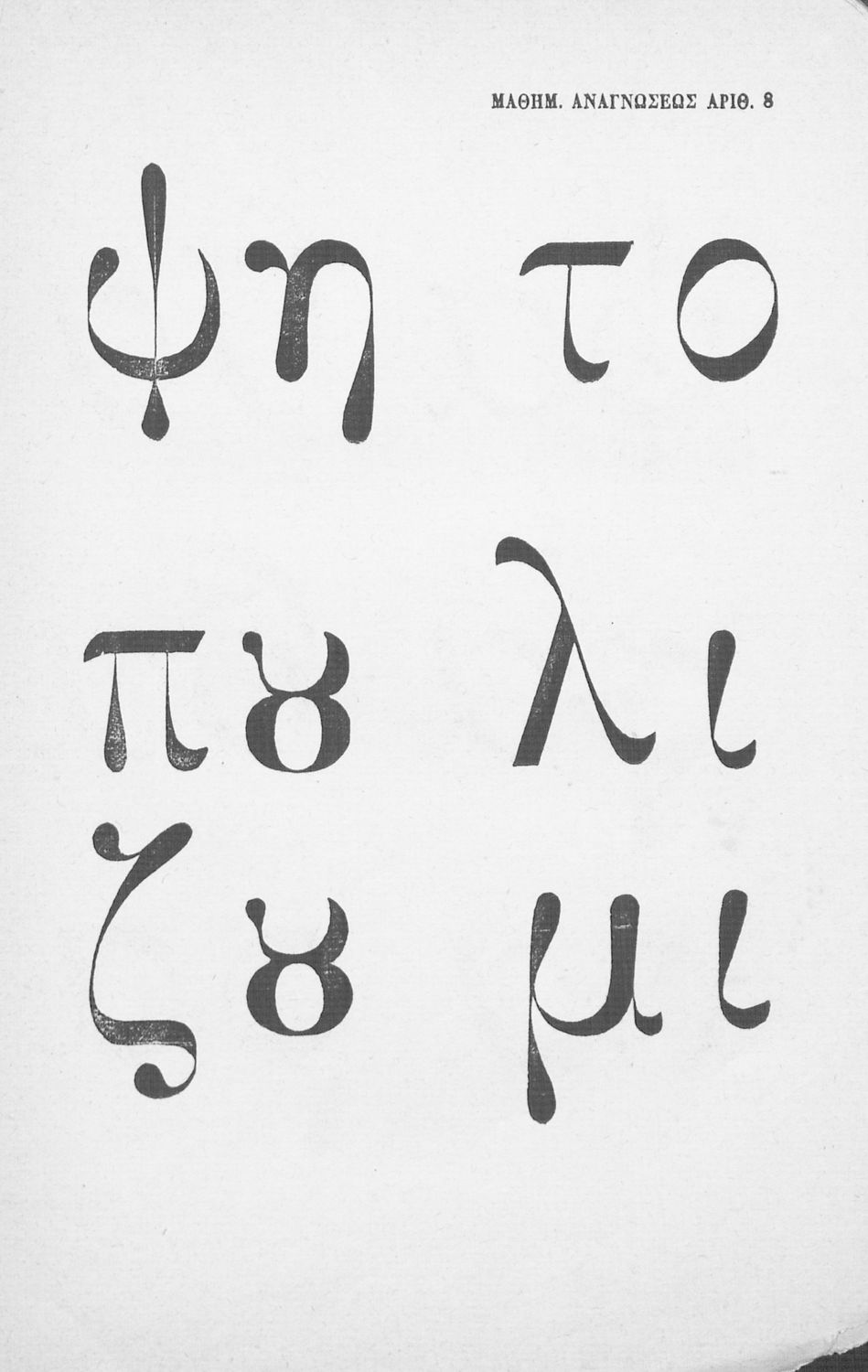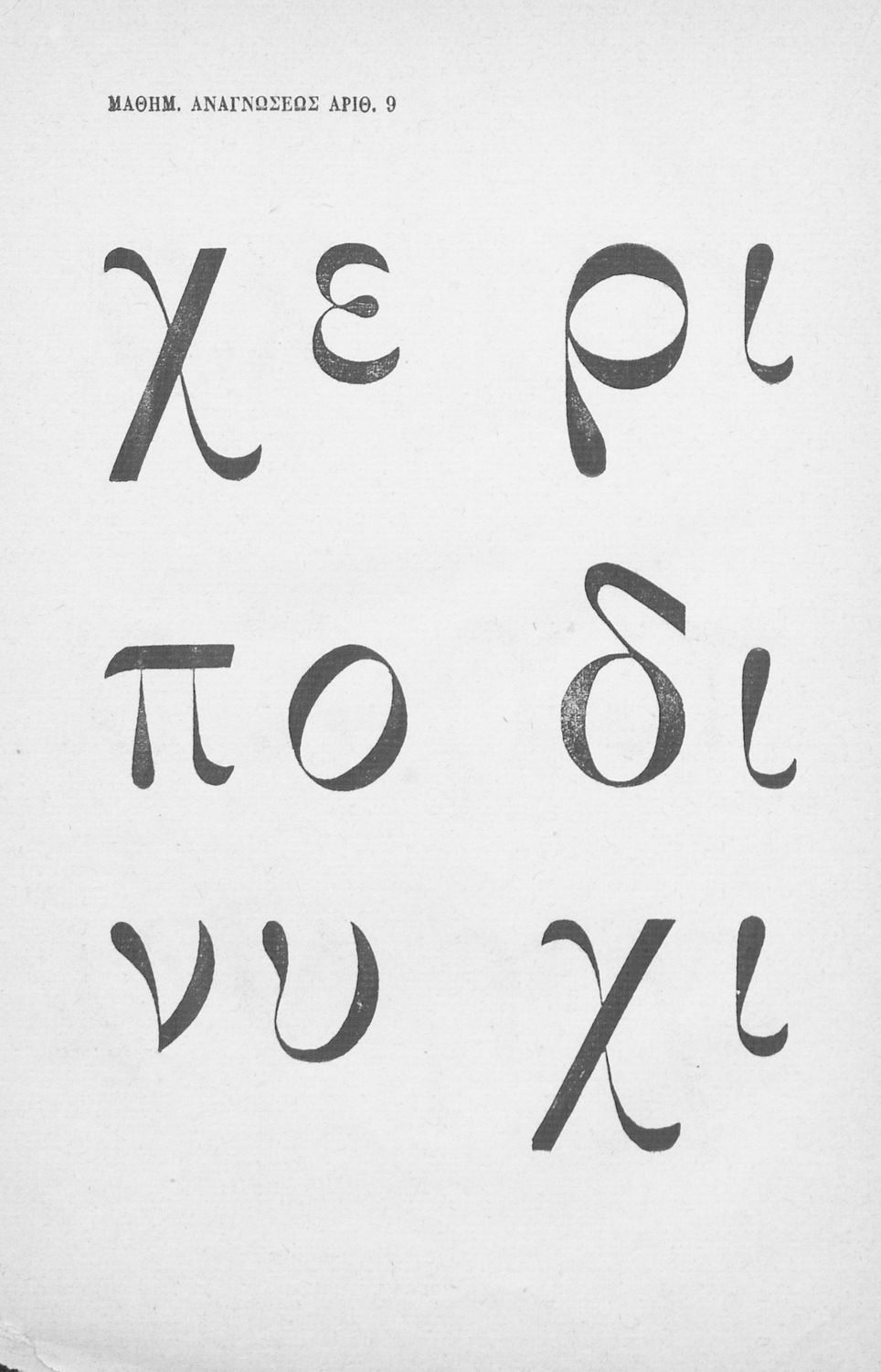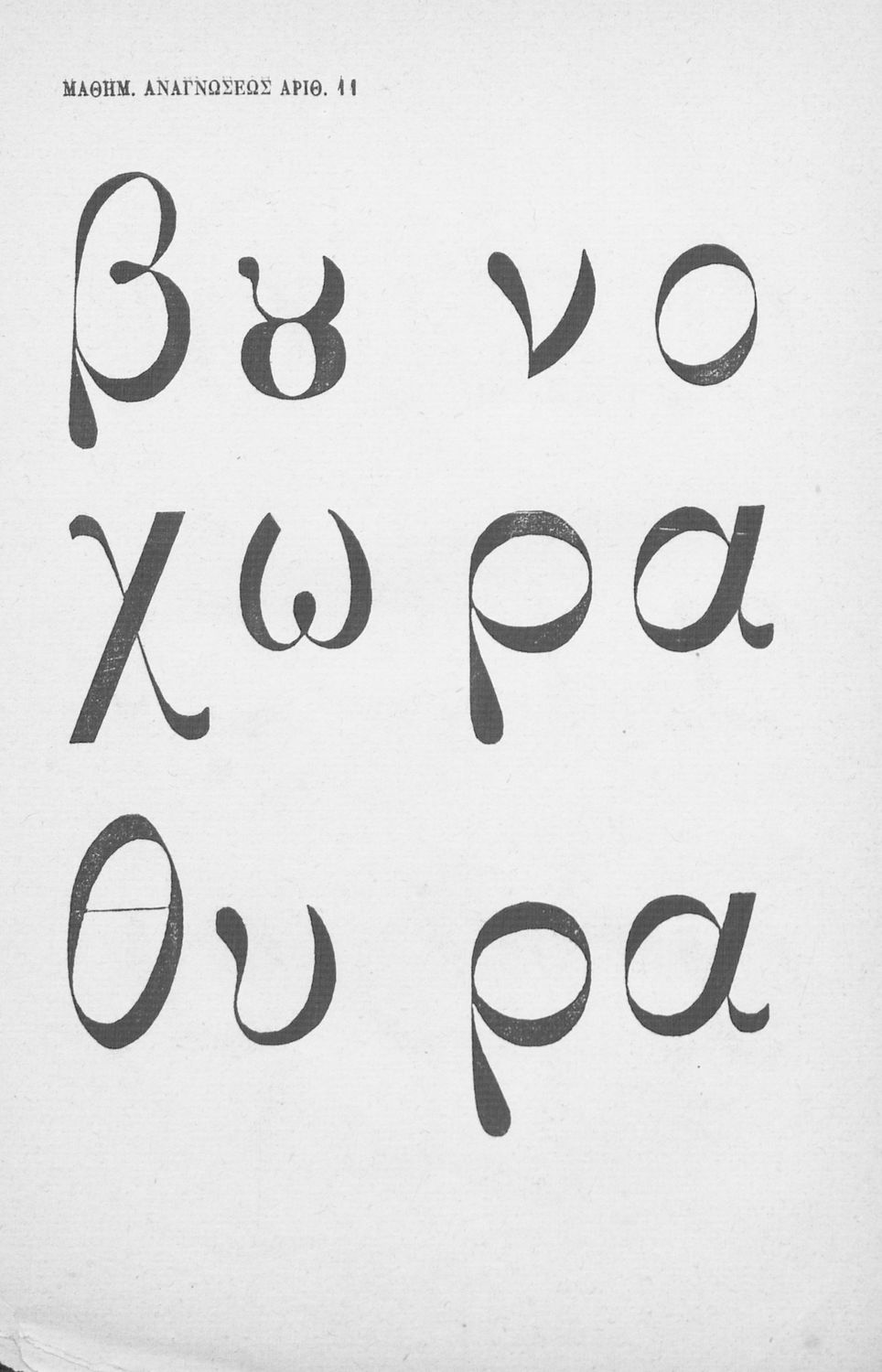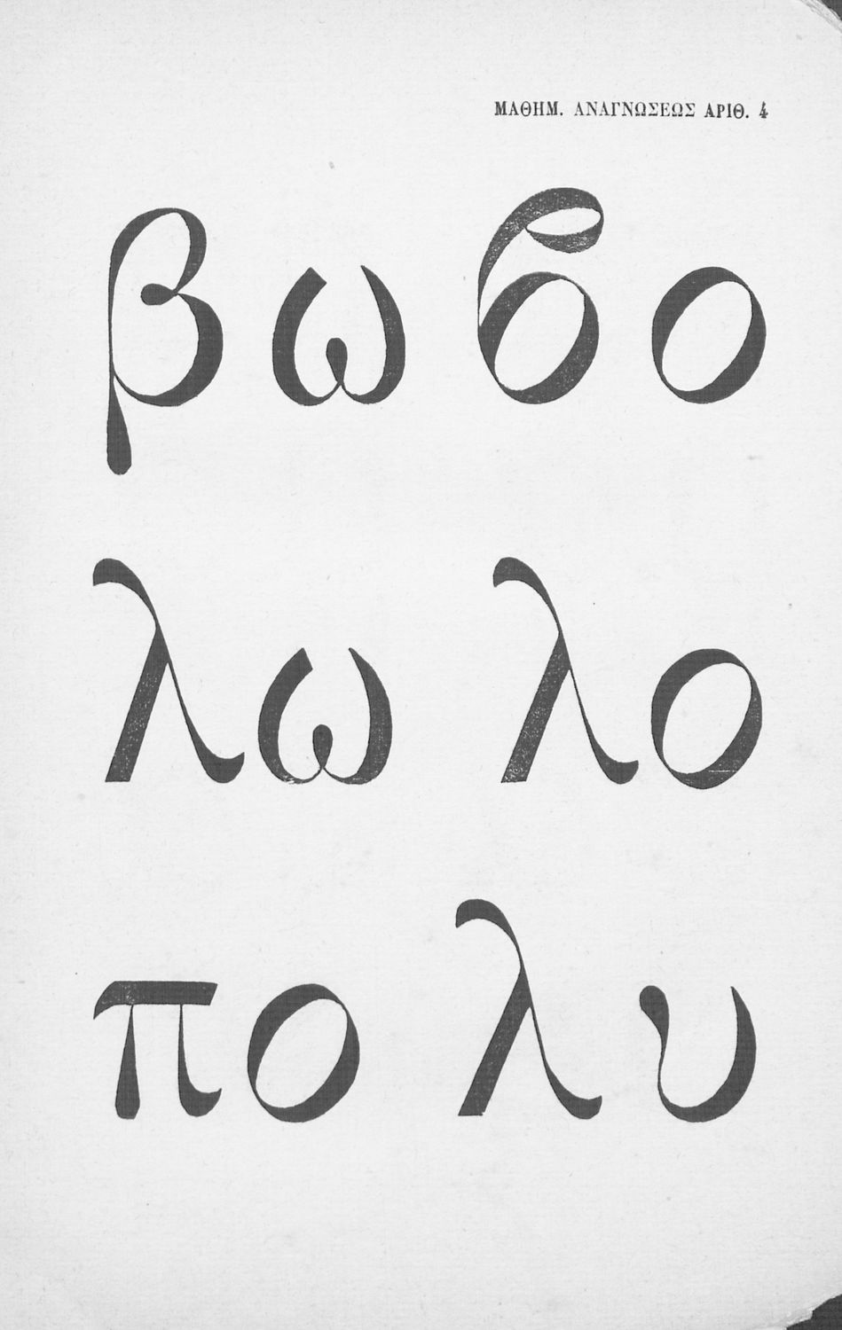 Αναγνωστικό Α΄ Δημοτικού που περιέχει γράμματα, συλλαβές, λέξεις, προτάσεις και κείμενα εμπνευσμένα από την οικογενειακή και κοινωνική ζωή του τόπου. Φέρει το σύμβολο της δικτατορίας.