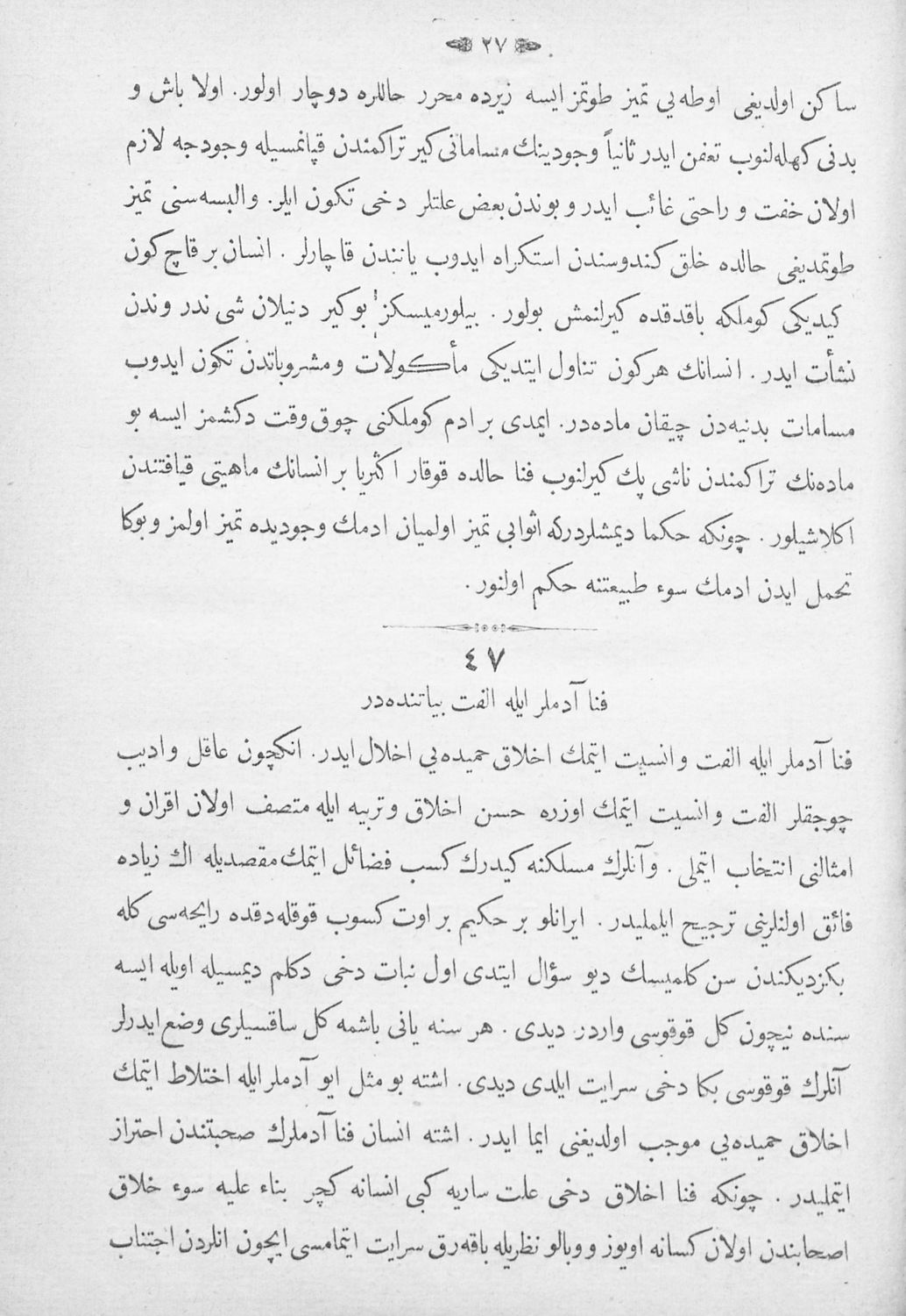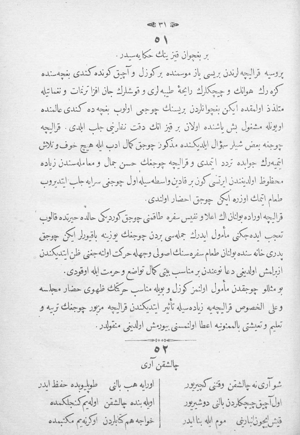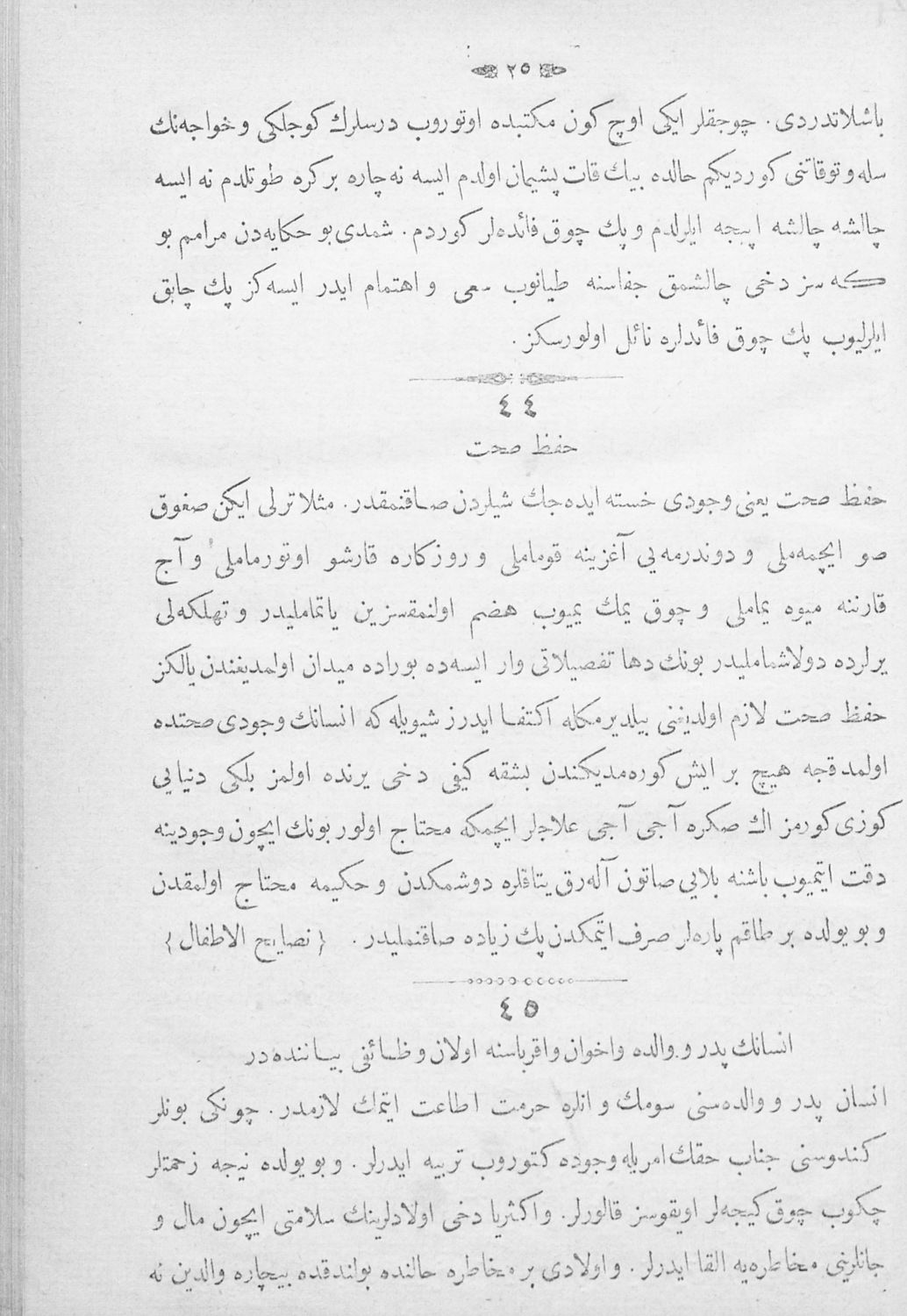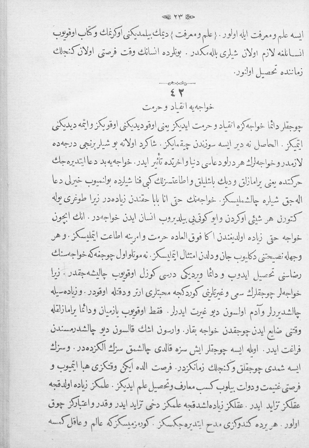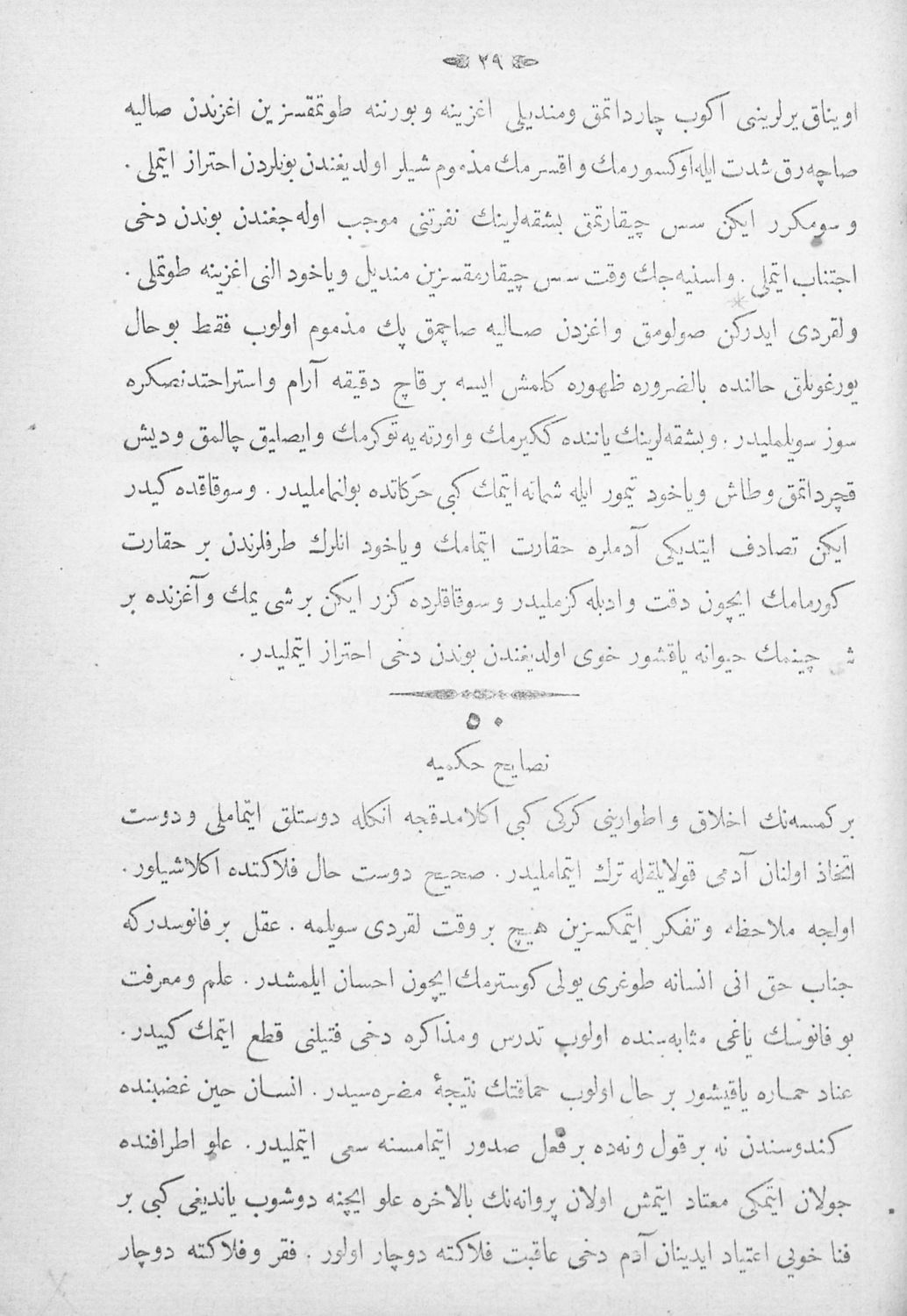 Σχολικό εγχειρίδιο που περιλαμβάνει κείμενα Οθωμανών συγγραφέων εμπνευσμένα από την οικογενειακή και κοινωνική ζωή και την ιστορία, λεξιλογική ανάλυση, και τους βασικότερους κανόνες γραμματικής της τουρκοαραβοπερσικής γλώσσας.