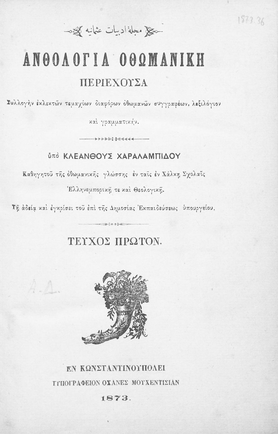 Εκδότης: Οχανές Μουχεντισιάν Έτος έκδοσης: 1873 Τόπος έκδοσης: Κωνσταντινούπολη |