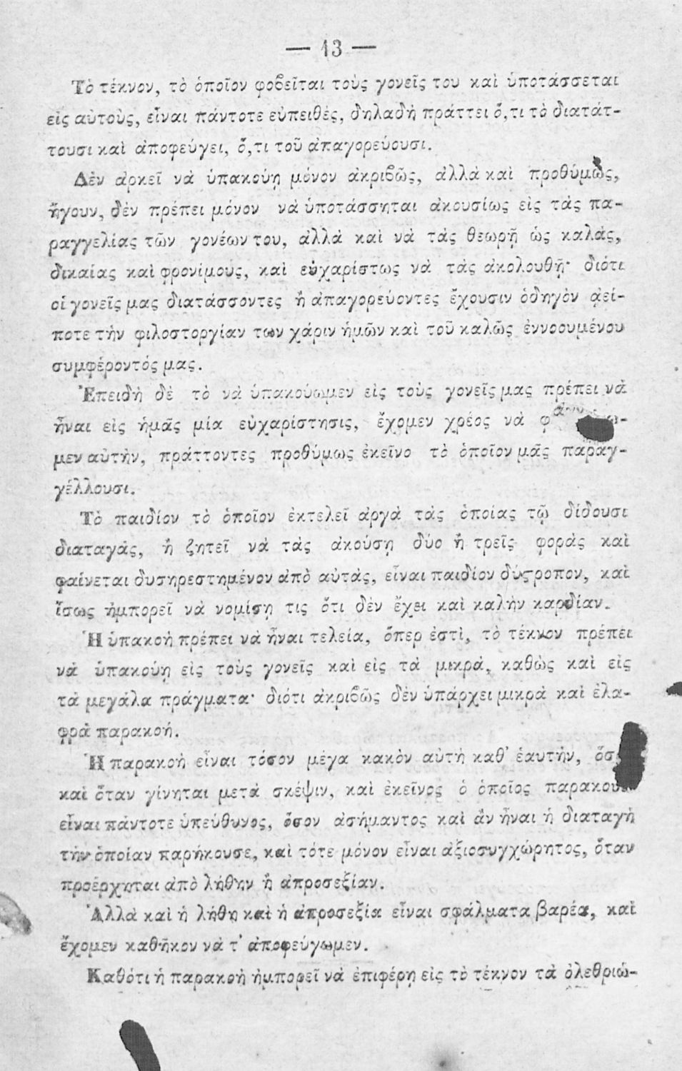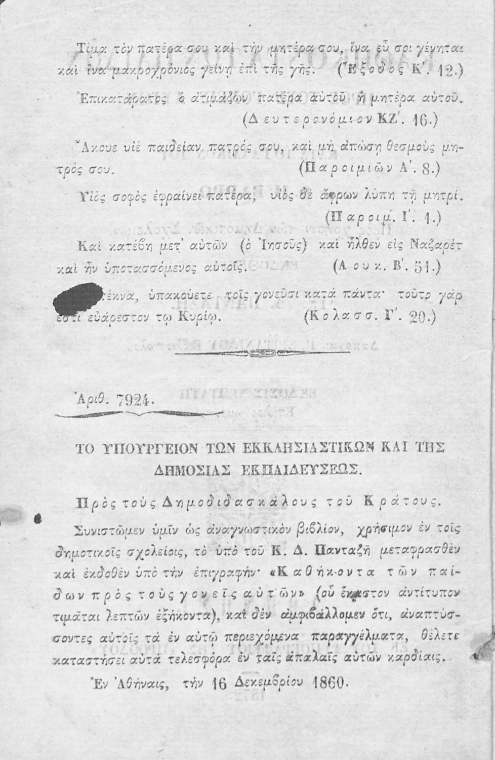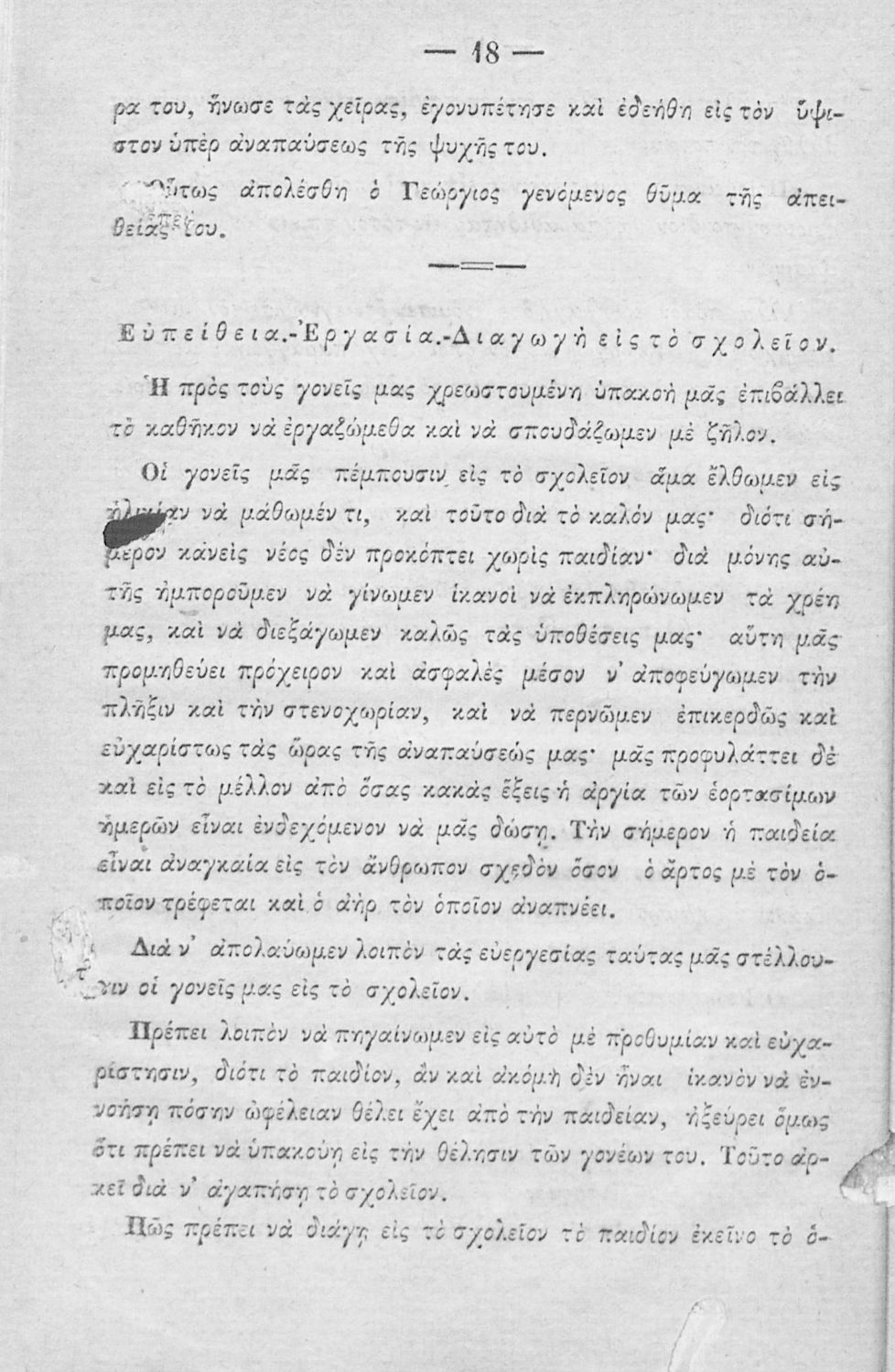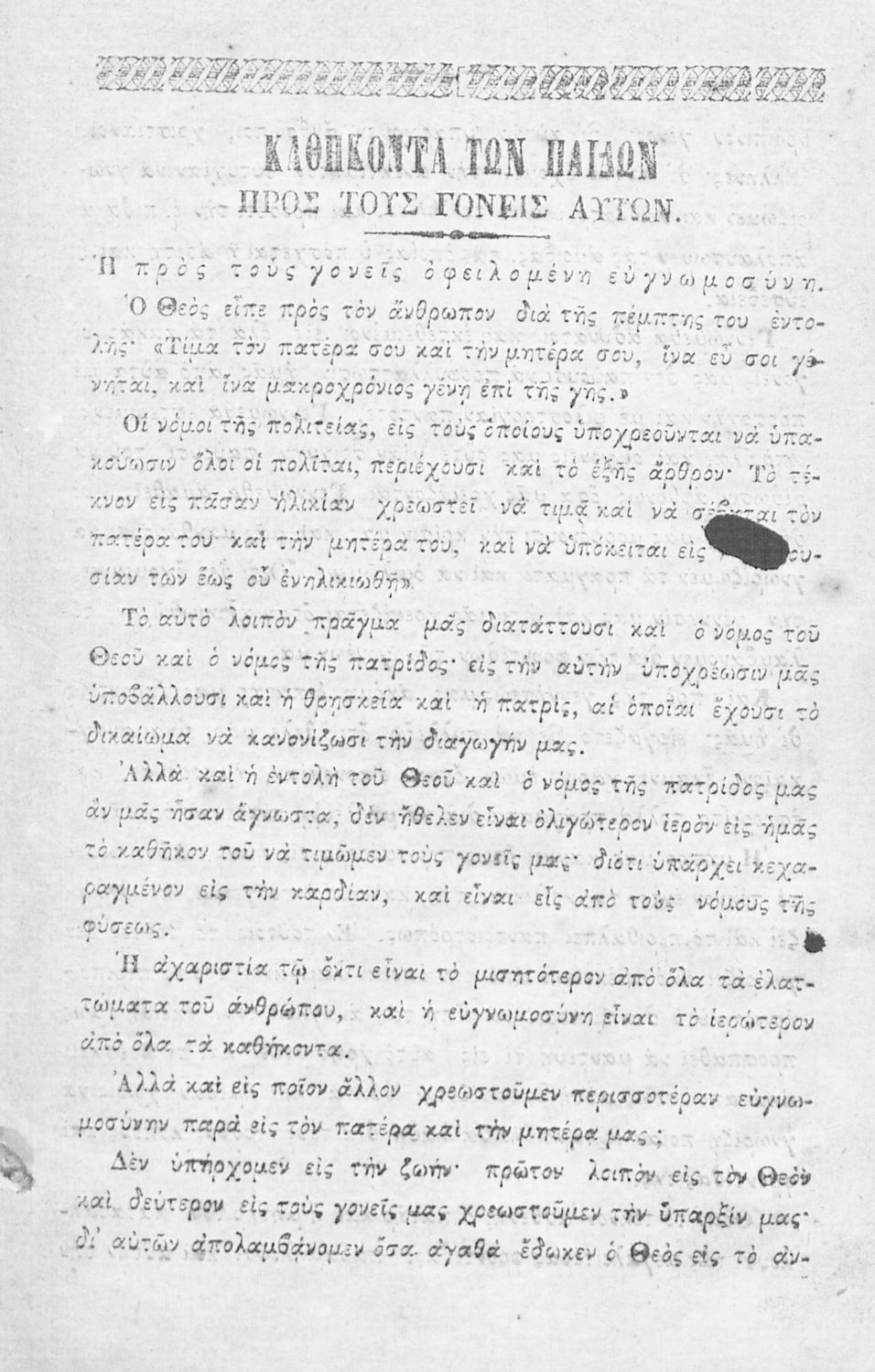 Αναγνωστικό Δημοτικού που περιλαμβάνει κείμενα με νουθεσίες και προοριζόταν για τη διδασκαλία των καθηκόντων των παιδιών απέναντι στους γονείς τους.