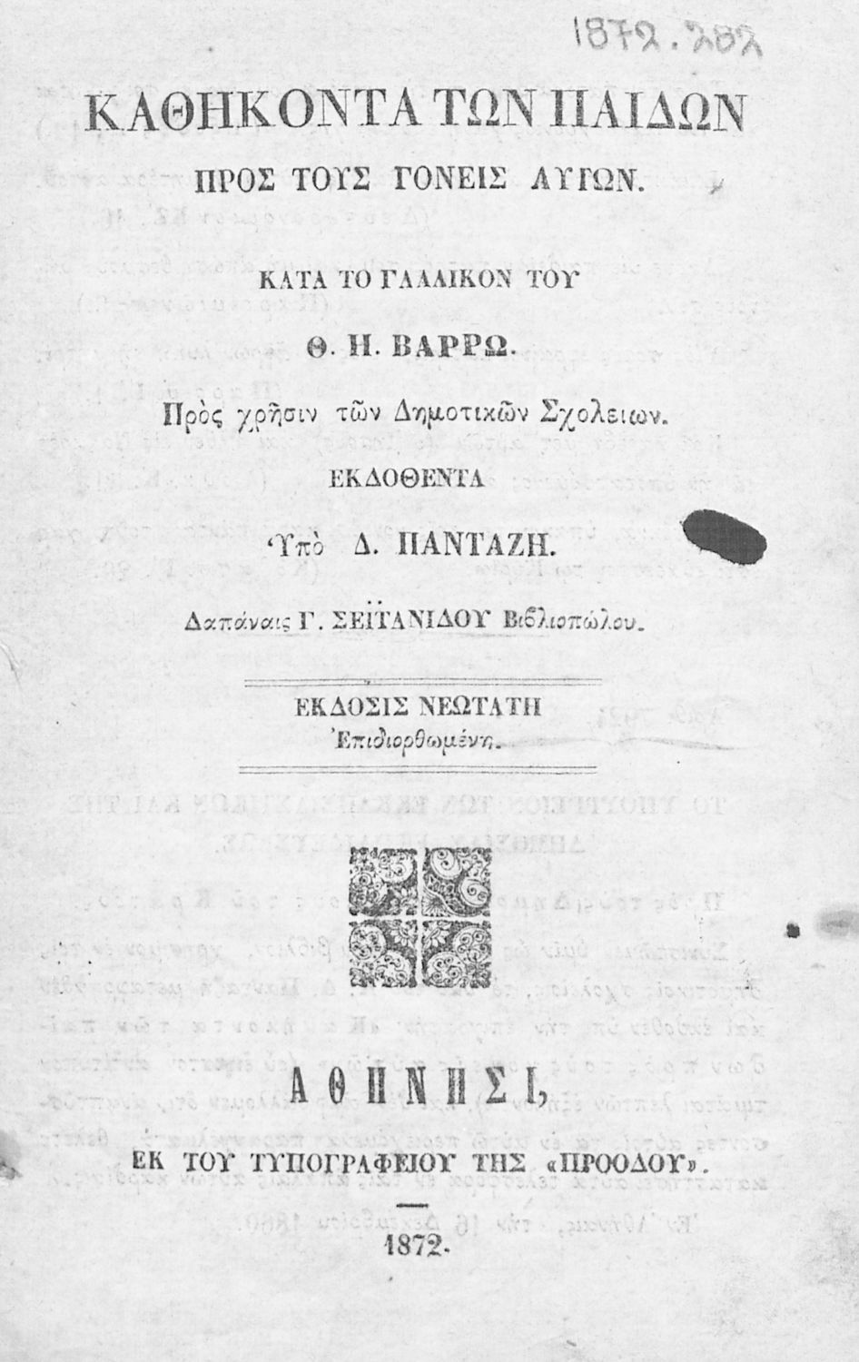 Εκδότης: Δ. Πανταζής Έτος έκδοσης: 1872 Τόπος έκδοσης: Αθήνα Υπουργική απόφαση / Σύμβαση: 7924/16-12-1860 |