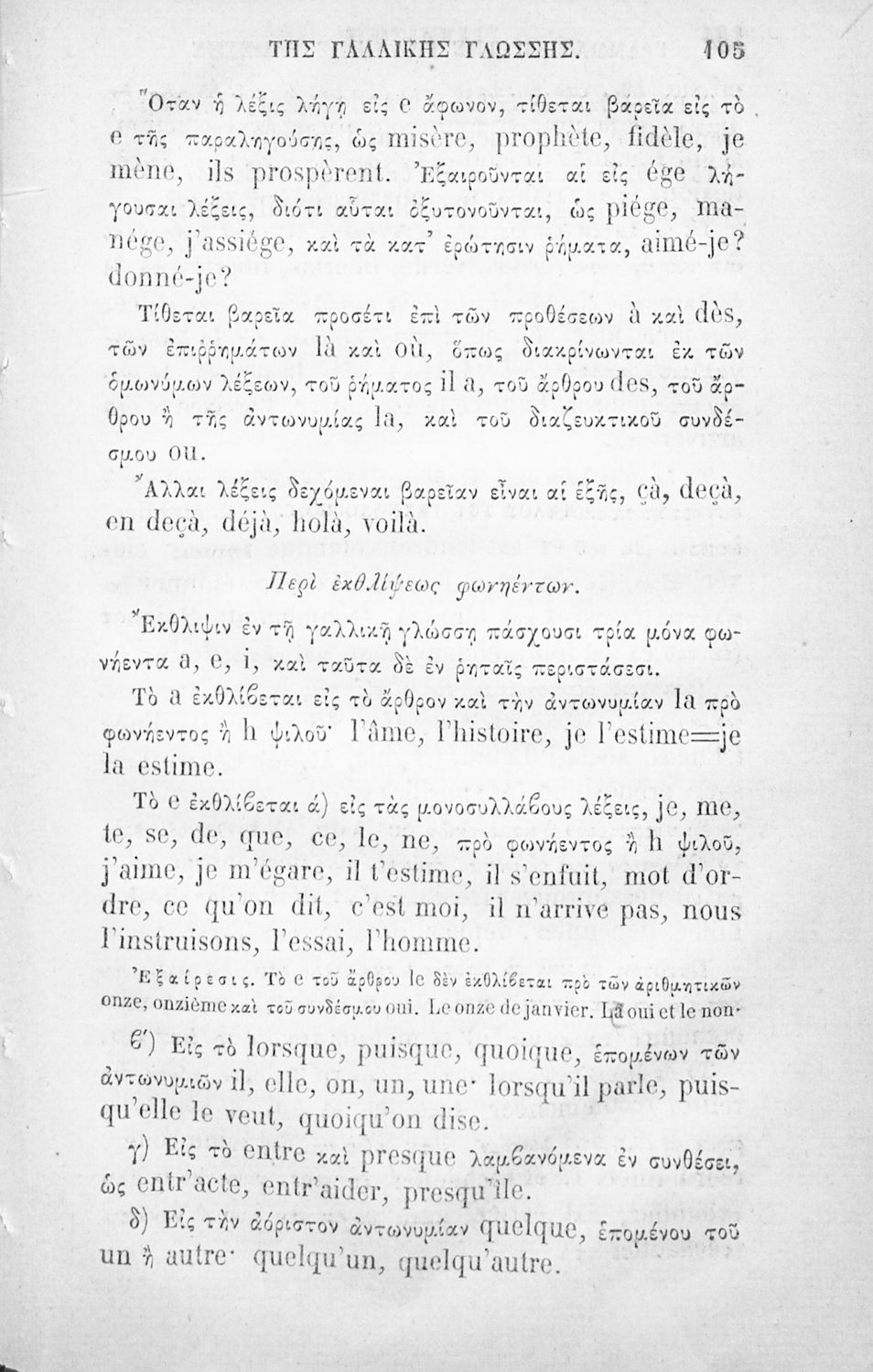 Βαθμίδα εκπαίδευσης: Δευτεροβάθμια Τάξη: Γυμνάσιο Μάθημα: Γαλλικά Γλώσσα: Καθαρεύουσα Παρουσίαση περιεχομένου: Σχολικό εγχειρίδιο Γαλλικών Γυμνασίου που περιέχει τους κανόνες γραμματικής και συντακτικού. |