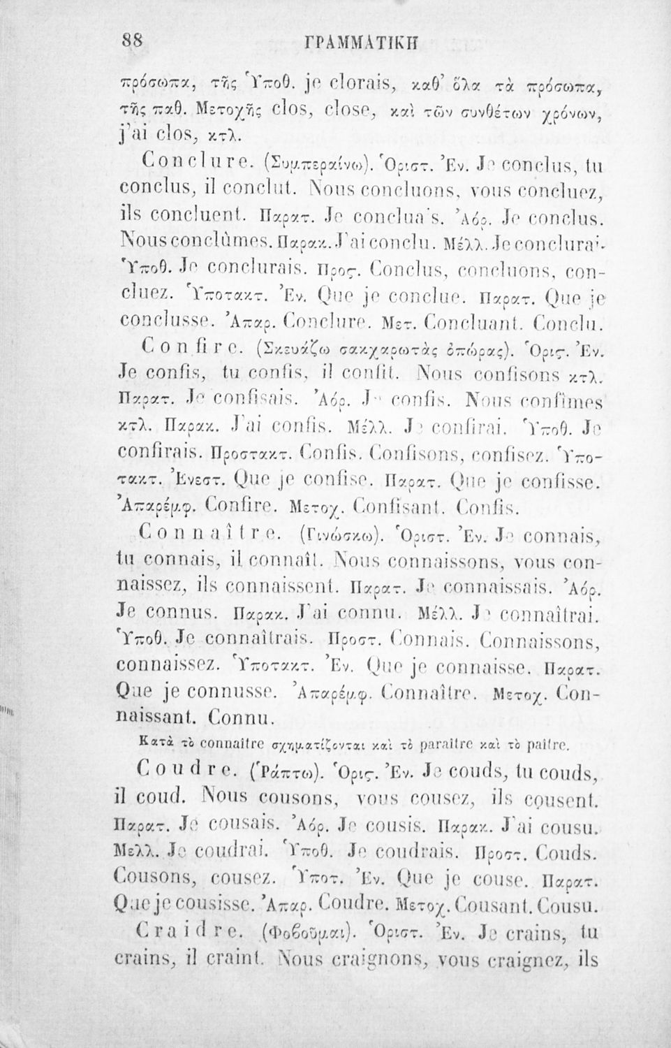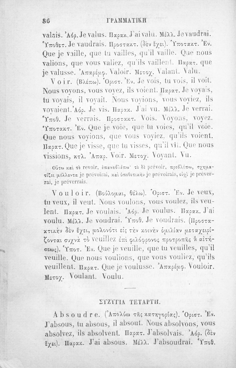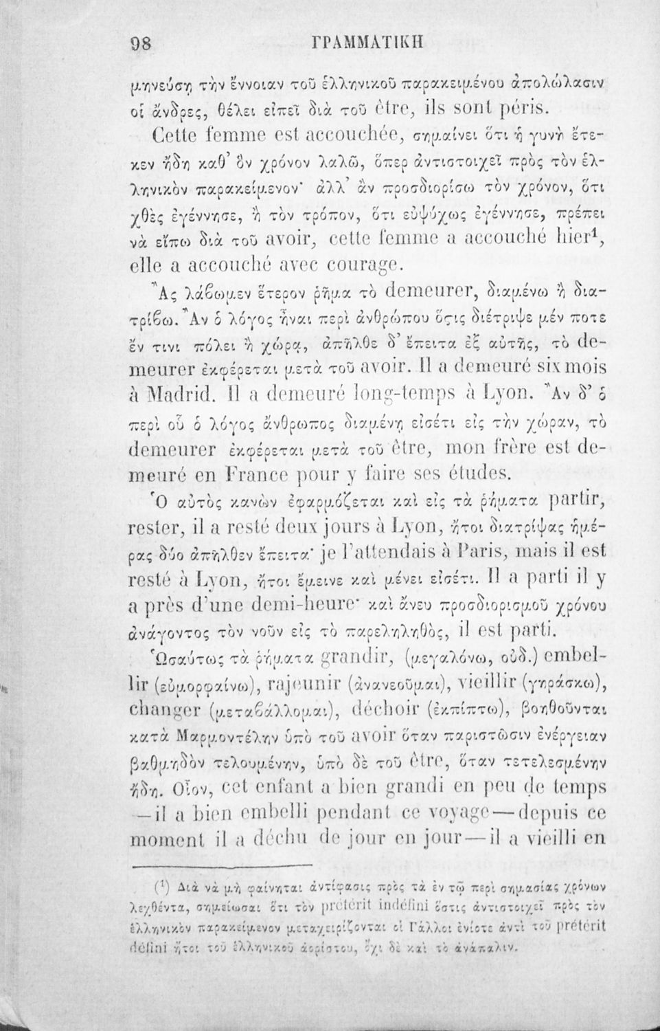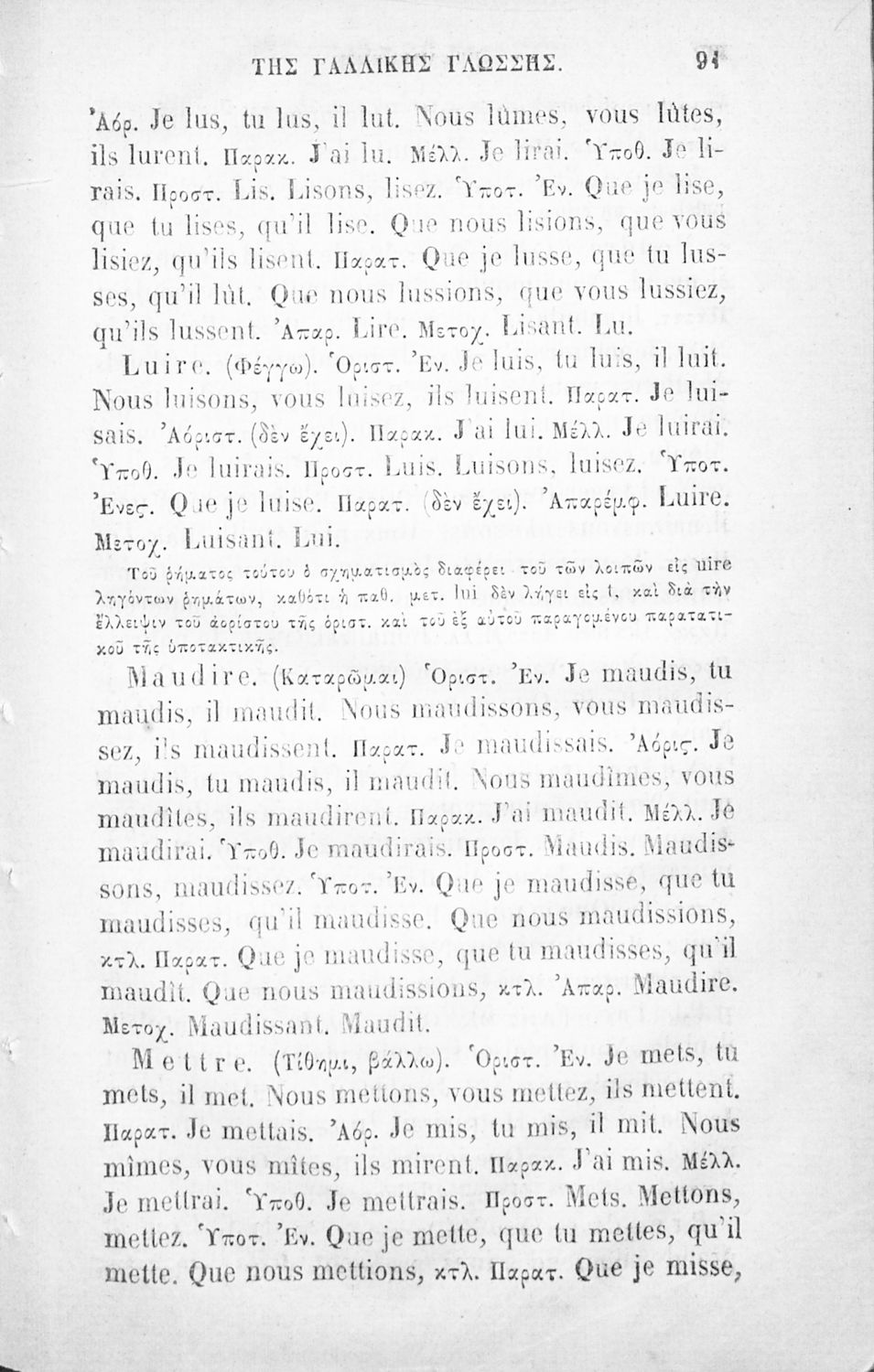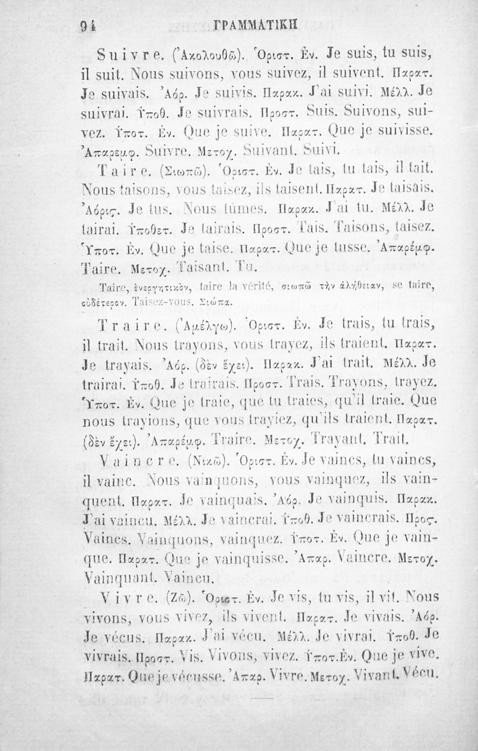 Βαθμίδα εκπαίδευσης: Δευτεροβάθμια Τάξη: Γυμνάσιο Μάθημα: Γαλλικά Γλώσσα: Καθαρεύουσα Παρουσίαση περιεχομένου: Σχολικό εγχειρίδιο Γαλλικών Γυμνασίου που περιέχει τους κανόνες γραμματικής και συντακτικού. |