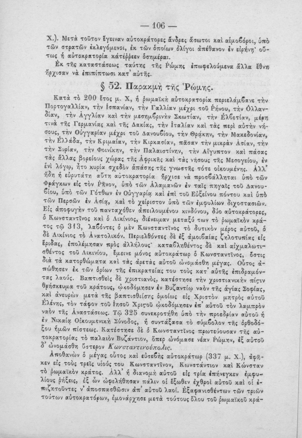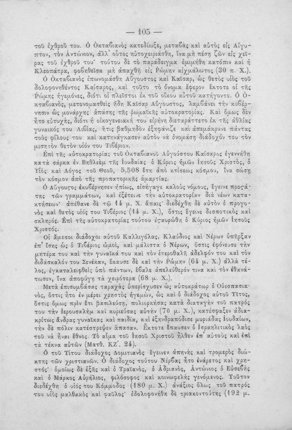 Βαθμίδα εκπαίδευσης: Δευτεροβάθμια Τάξη: Ελληνικό Σχολείο Μάθημα: Ιστορία Γλώσσα: Καθαρεύουσα Παρουσίαση περιεχομένου: Σχολικό εγχειρίδιο Ιστορίας για τα Ελληνικά Σχολεία που περιλαμβάνει συνοπτικά την ελληνική και την ευρωπαϊκή ιστορία. Αναφέρεται στους Περσικούς Πολέμους, τον Πελοποννησιακό, την άνοδο των Μακεδόνων βασιλιάδων και τις ελληνικές αποικίες. Συνεχίζει με την άνοδο της Ρώμης και την αυτοκρατορία. Αναφέρεται στα ευρωπαϊκά ιστορικά γεγονότα την αναγέννηση, τη θρησκευτική μεταρρύθμιση, τη Γαλλική Επανάσταση και τους Ναπολεόντειους Πολέμους. |