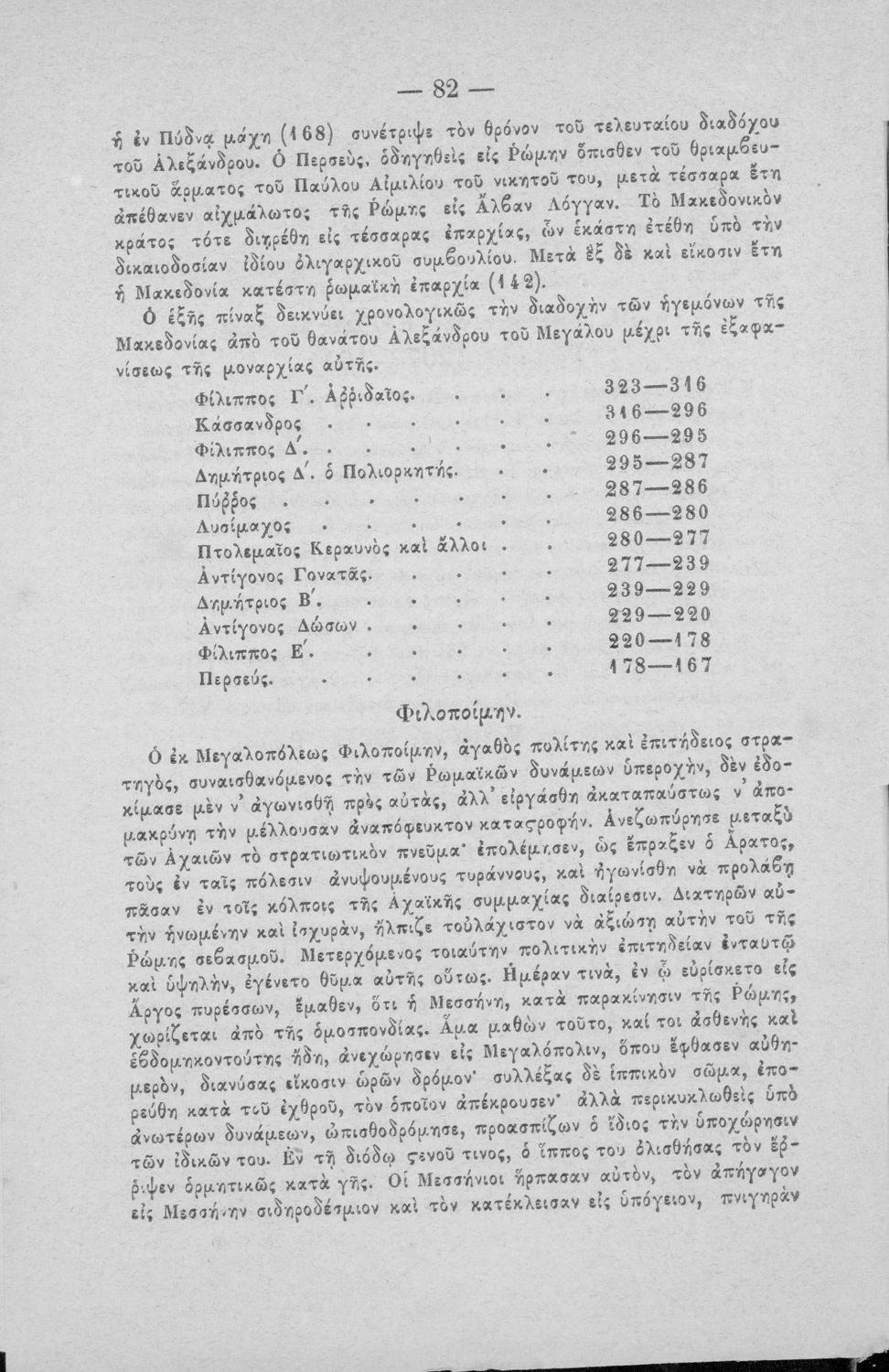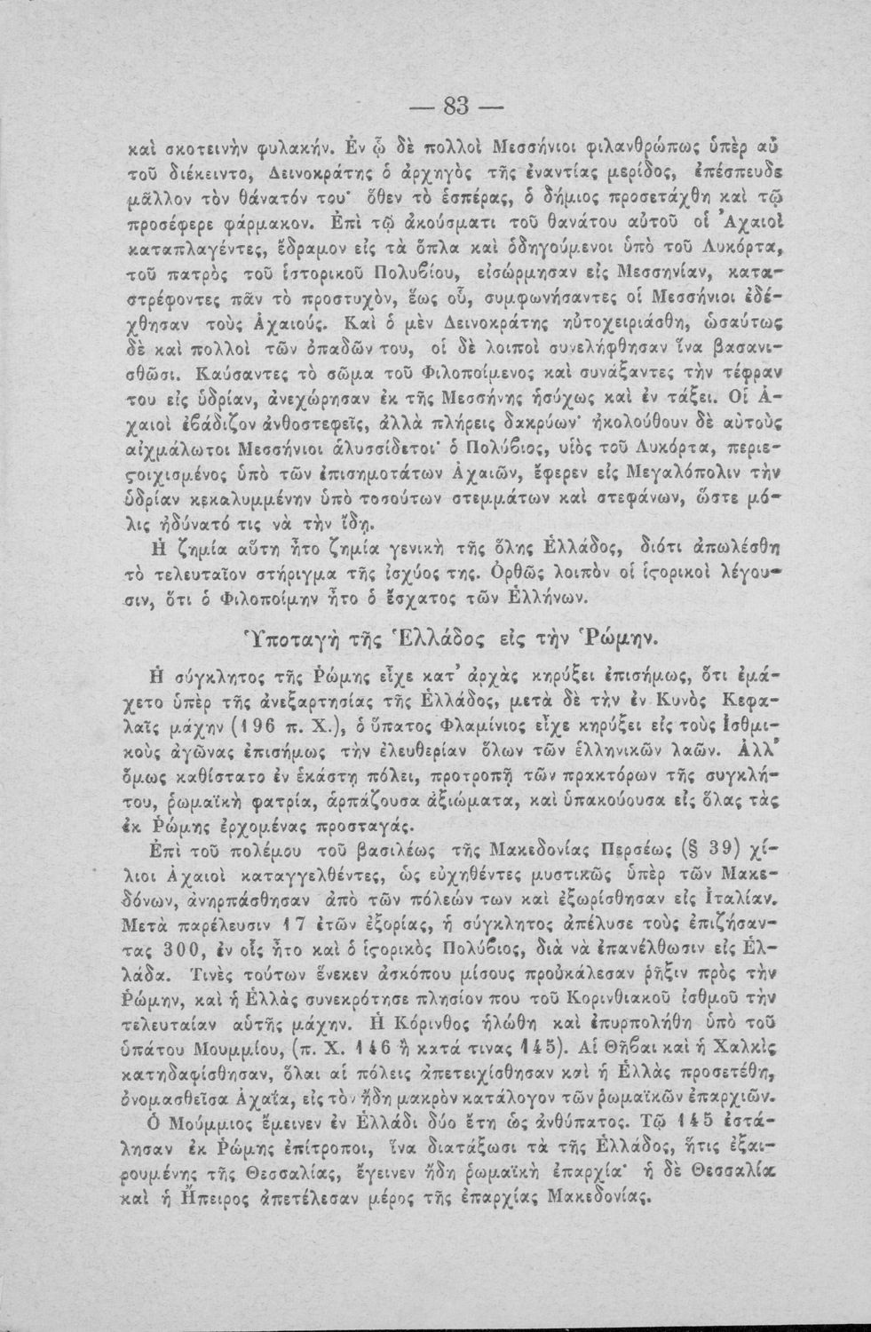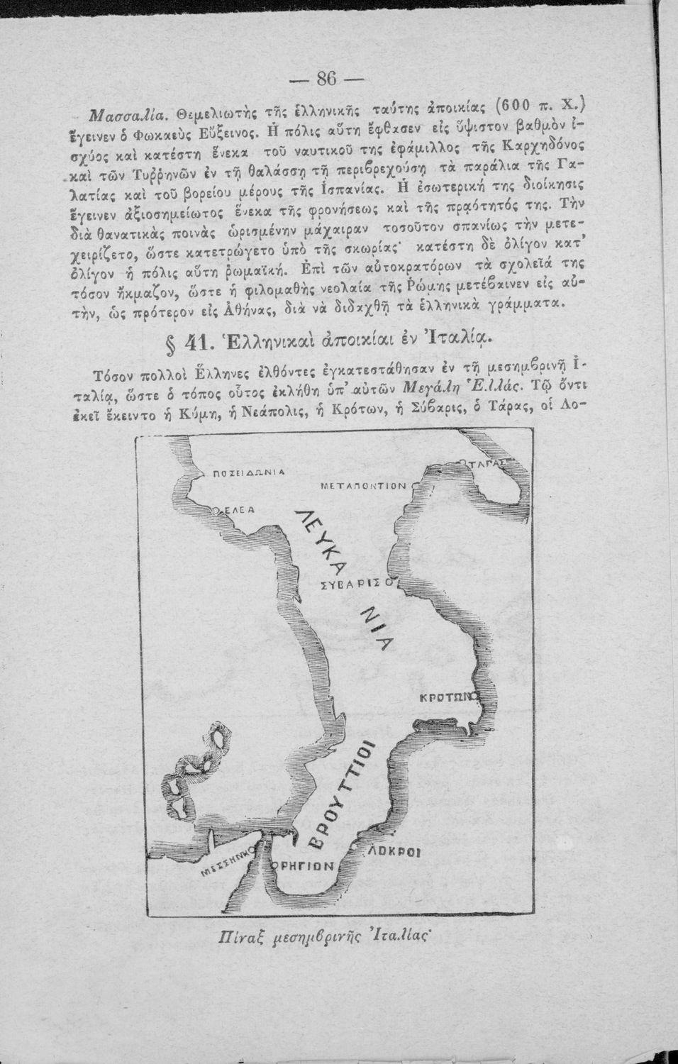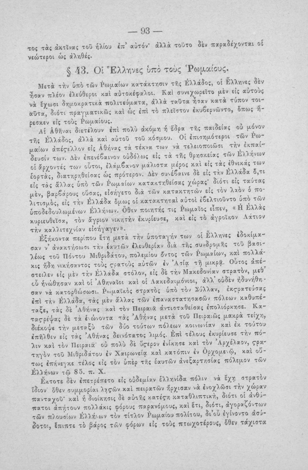 Βαθμίδα εκπαίδευσης: Δευτεροβάθμια Τάξη: Ελληνικό Σχολείο Μάθημα: Ιστορία Γλώσσα: Καθαρεύουσα Παρουσίαση περιεχομένου: Σχολικό εγχειρίδιο Ιστορίας για τα Ελληνικά Σχολεία που περιλαμβάνει συνοπτικά την ελληνική και την ευρωπαϊκή ιστορία. Αναφέρεται στους Περσικούς Πολέμους, τον Πελοποννησιακό, την άνοδο των Μακεδόνων βασιλιάδων και τις ελληνικές αποικίες. Συνεχίζει με την άνοδο της Ρώμης και την αυτοκρατορία. Αναφέρεται στα ευρωπαϊκά ιστορικά γεγονότα την αναγέννηση, τη θρησκευτική μεταρρύθμιση, τη Γαλλική Επανάσταση και τους Ναπολεόντειους Πολέμους. |