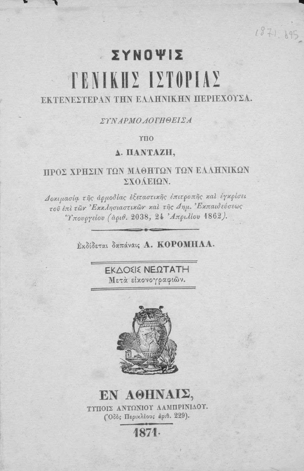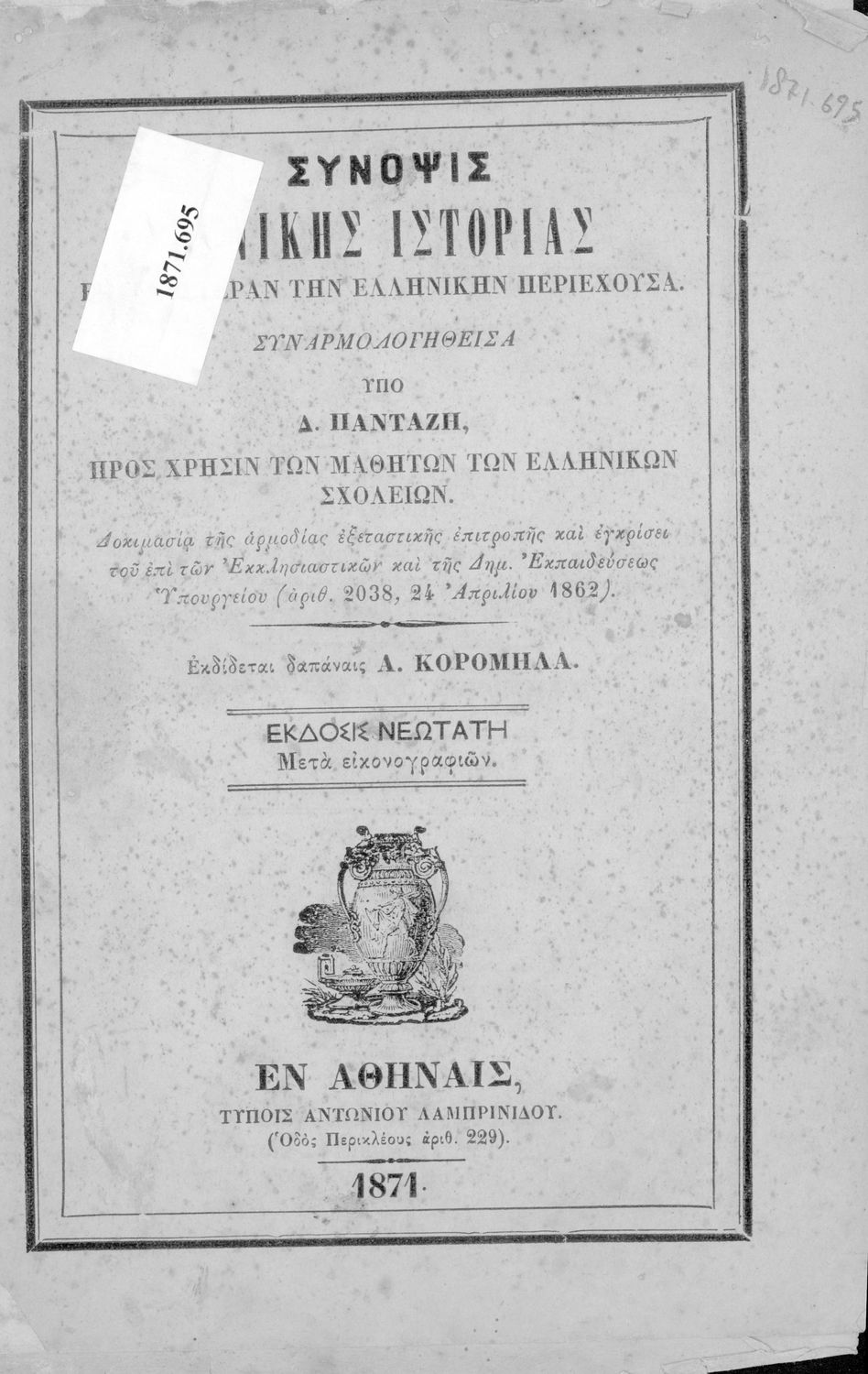 Εκδότης: Κορομηλάς Έτος έκδοσης: 1871 Τόπος έκδοσης: Αθήνα |