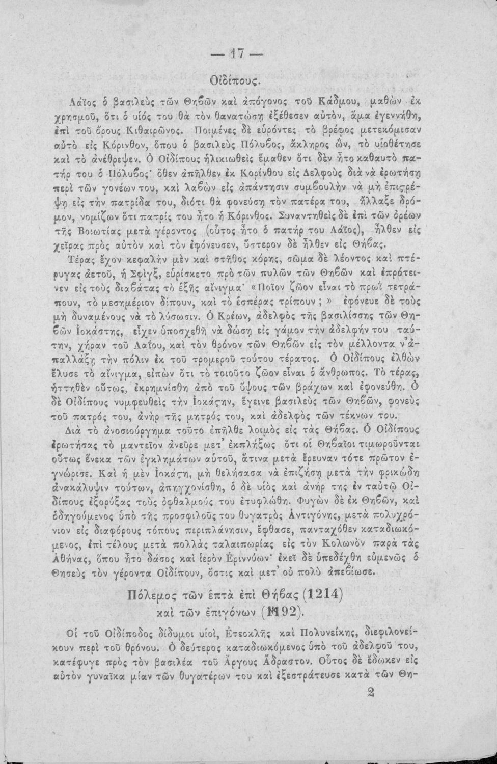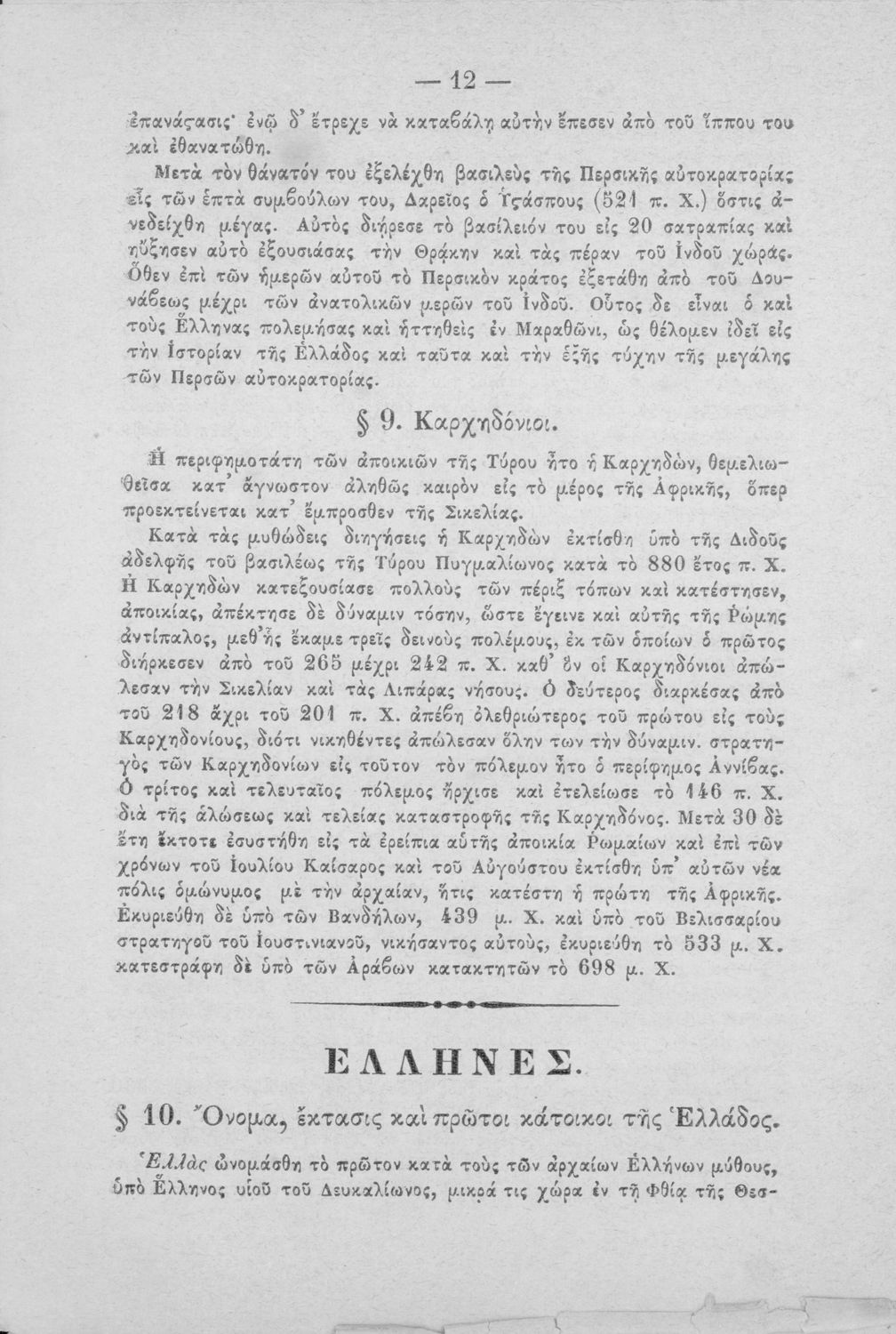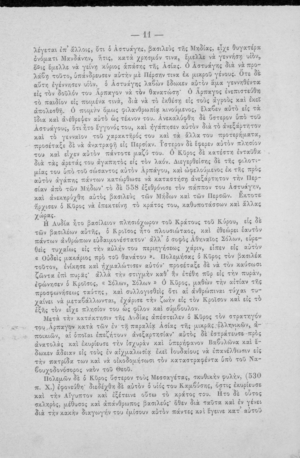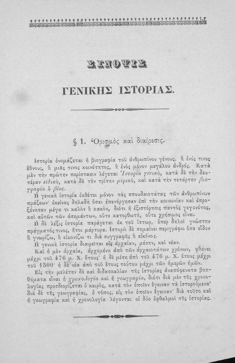 Βαθμίδα εκπαίδευσης: Δευτεροβάθμια Τάξη: Ελληνικό Σχολείο Μάθημα: Ιστορία Γλώσσα: Καθαρεύουσα Παρουσίαση περιεχομένου: Σχολικό εγχειρίδιο Ιστορίας για τα Ελληνικά Σχολεία που περιλαμβάνει συνοπτικά την ελληνική και την ευρωπαϊκή ιστορία. Αναφέρεται στους Περσικούς Πολέμους, τον Πελοποννησιακό, την άνοδο των Μακεδόνων βασιλιάδων και τις ελληνικές αποικίες. Συνεχίζει με την άνοδο της Ρώμης και την αυτοκρατορία. Αναφέρεται στα ευρωπαϊκά ιστορικά γεγονότα την αναγέννηση, τη θρησκευτική μεταρρύθμιση, τη Γαλλική Επανάσταση και τους Ναπολεόντειους Πολέμους. |