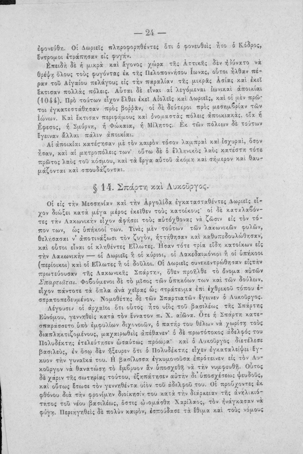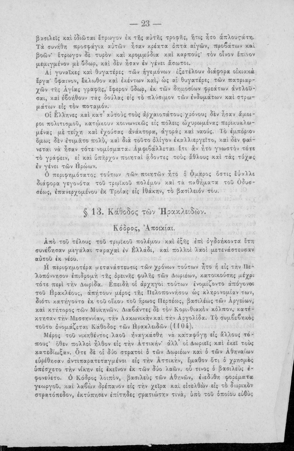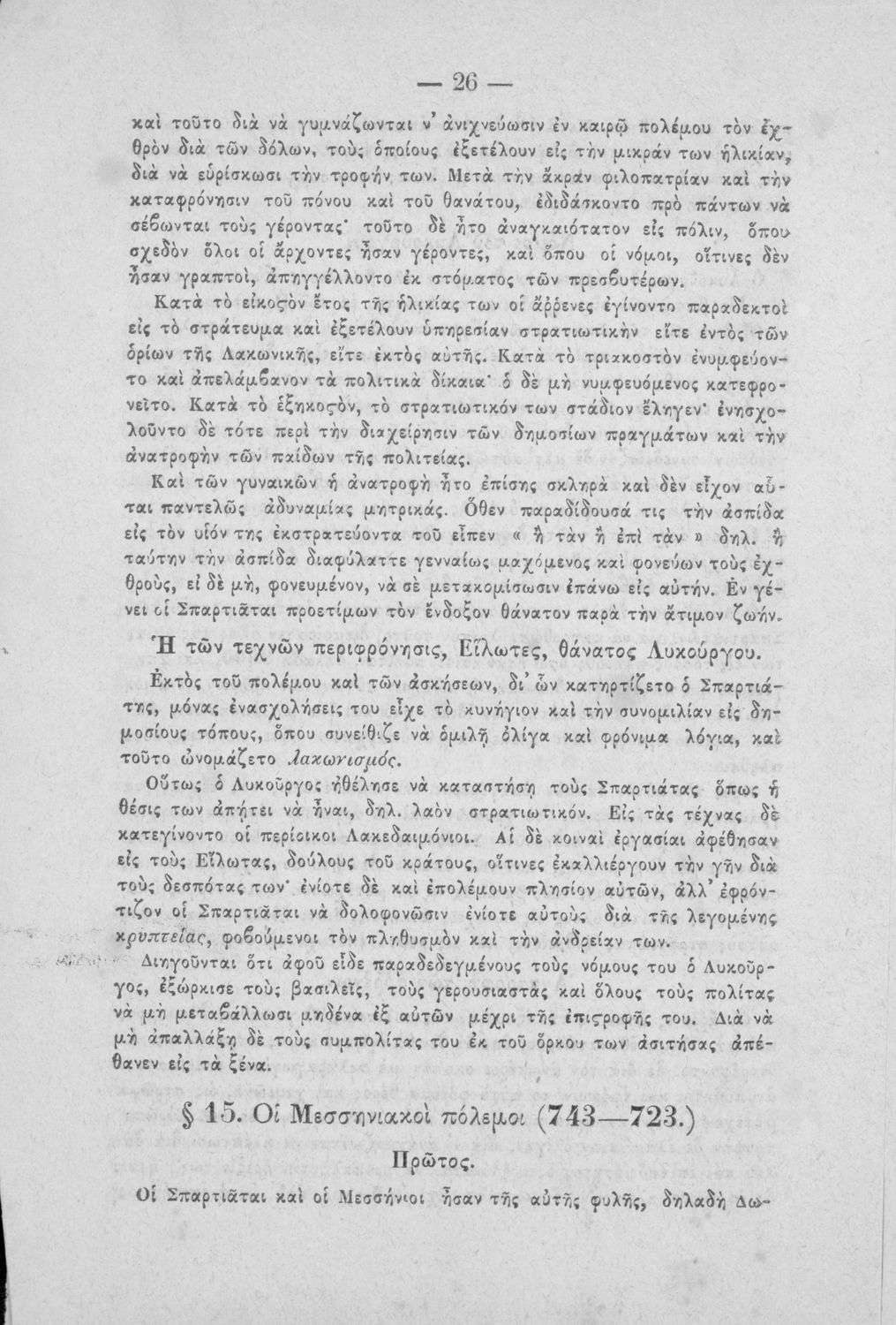 Βαθμίδα εκπαίδευσης: Δευτεροβάθμια Τάξη: Ελληνικό Σχολείο Μάθημα: Ιστορία Γλώσσα: Καθαρεύουσα Παρουσίαση περιεχομένου: Σχολικό εγχειρίδιο Ιστορίας για τα Ελληνικά Σχολεία που περιλαμβάνει συνοπτικά την ελληνική και την ευρωπαϊκή ιστορία. Αναφέρεται στους Περσικούς Πολέμους, τον Πελοποννησιακό, την άνοδο των Μακεδόνων βασιλιάδων και τις ελληνικές αποικίες. Συνεχίζει με την άνοδο της Ρώμης και την αυτοκρατορία. Αναφέρεται στα ευρωπαϊκά ιστορικά γεγονότα την αναγέννηση, τη θρησκευτική μεταρρύθμιση, τη Γαλλική Επανάσταση και τους Ναπολεόντειους Πολέμους. |