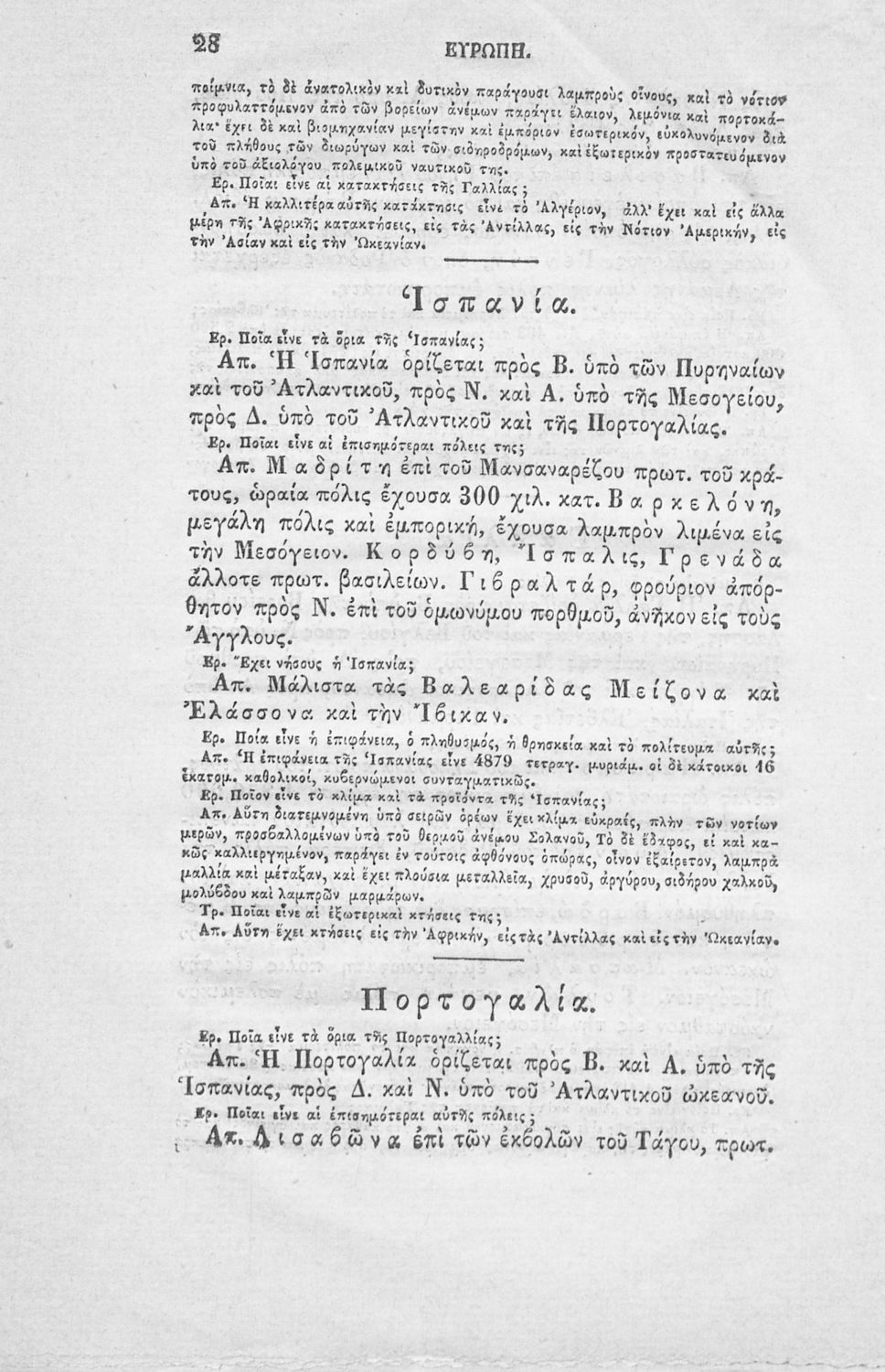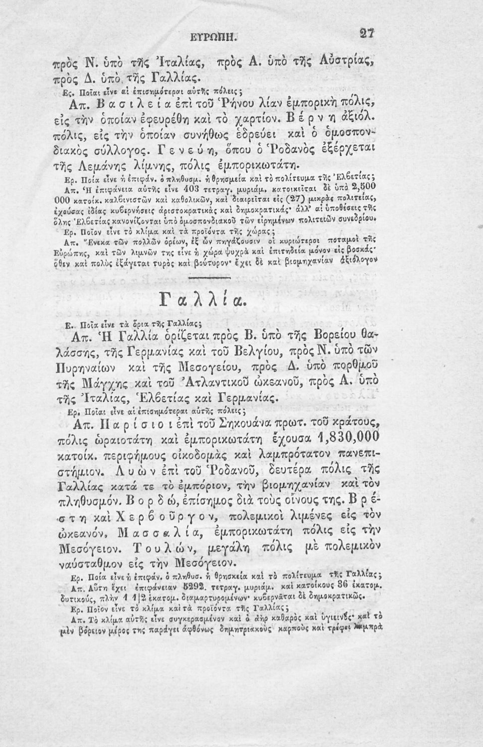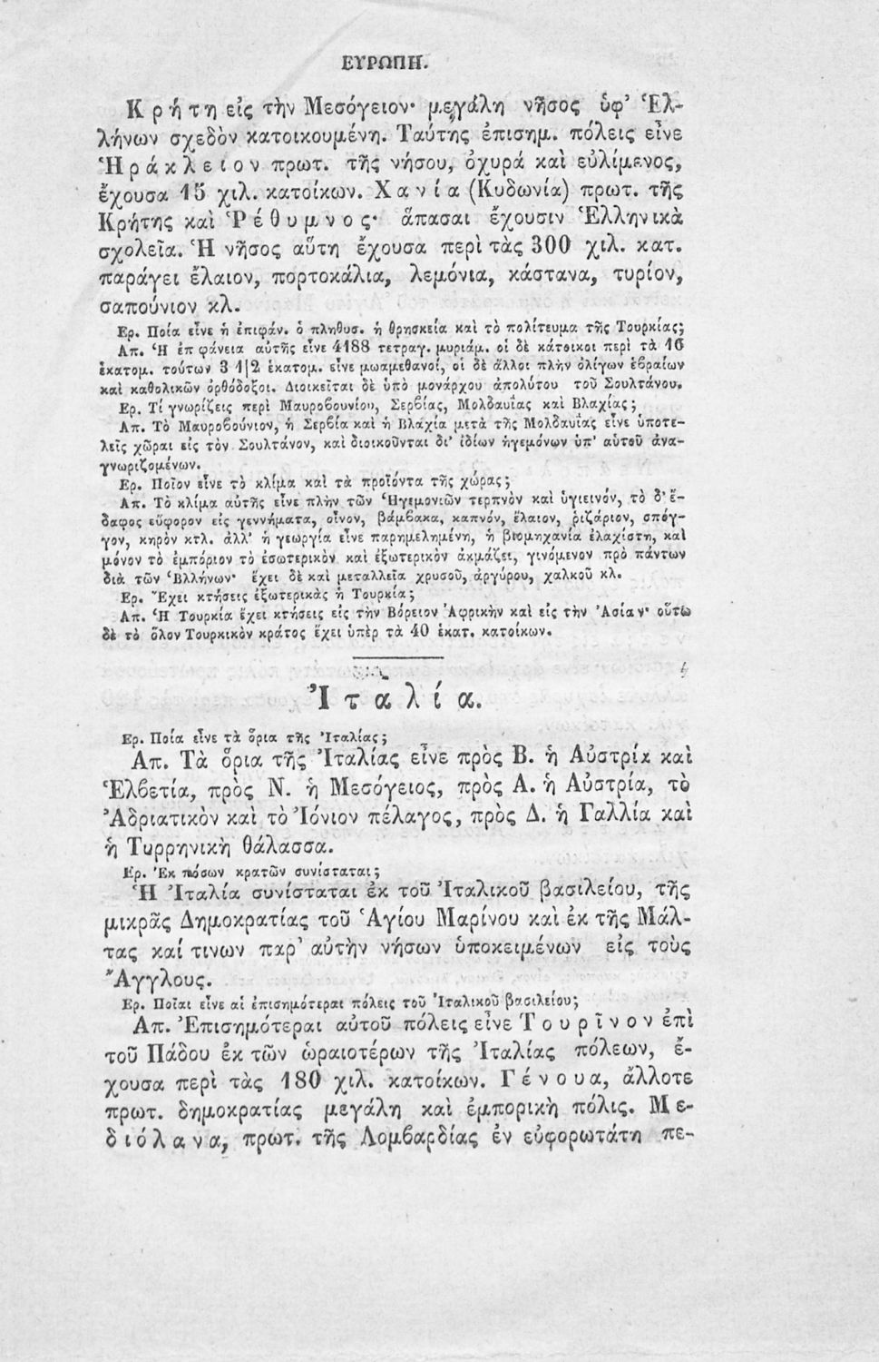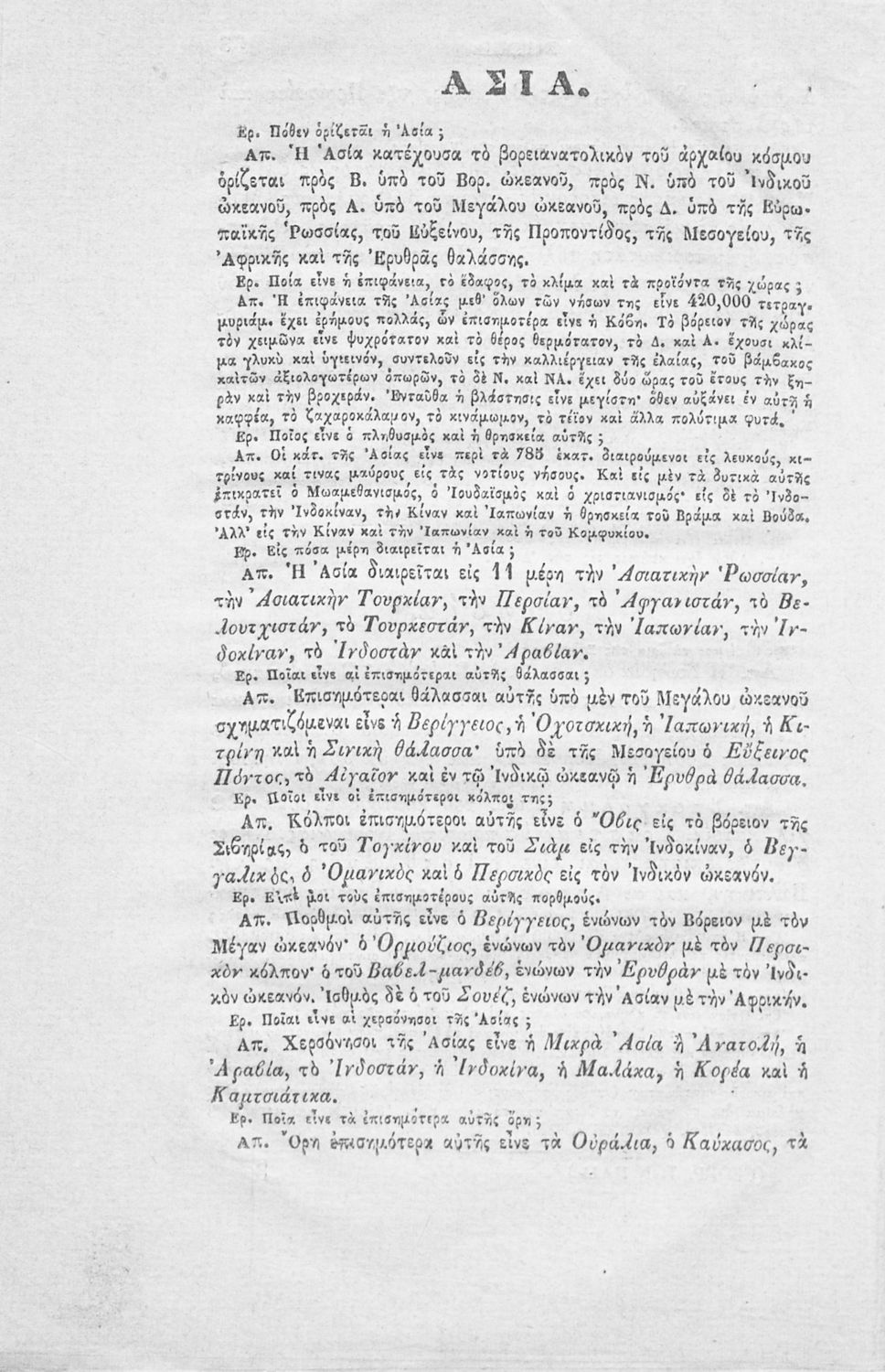 Σχολικό εγχειρίδιο Γεωγραφίας για τα Ελληνικά Σχολεία που περιλαμβάνει εισαγωγή στις βασικές έννοιες και ορισμούς της επιστήμης, και στοιχεία μαθηματικής, φυσικής και πολιτικής γεωγραφίας των πέντε ηπείρων.