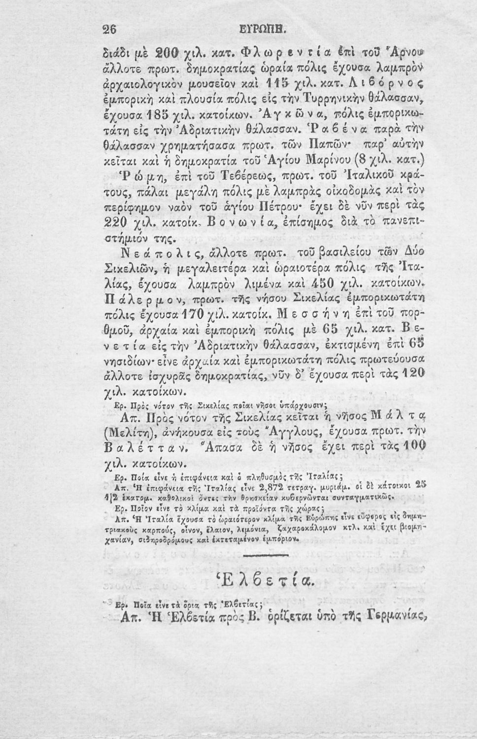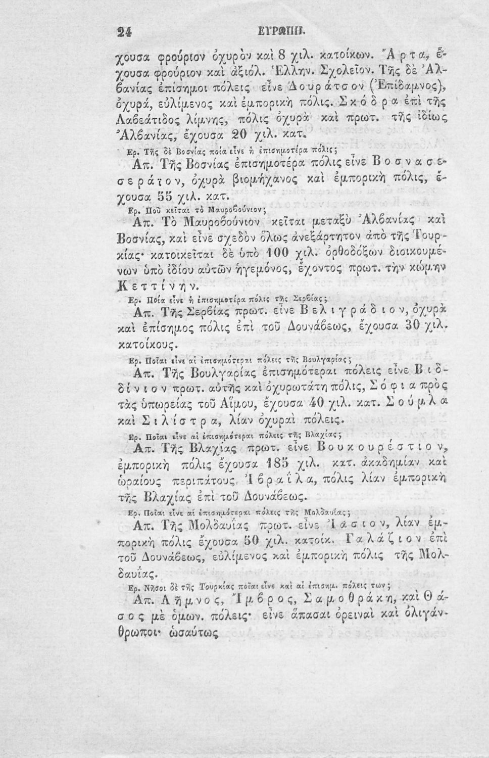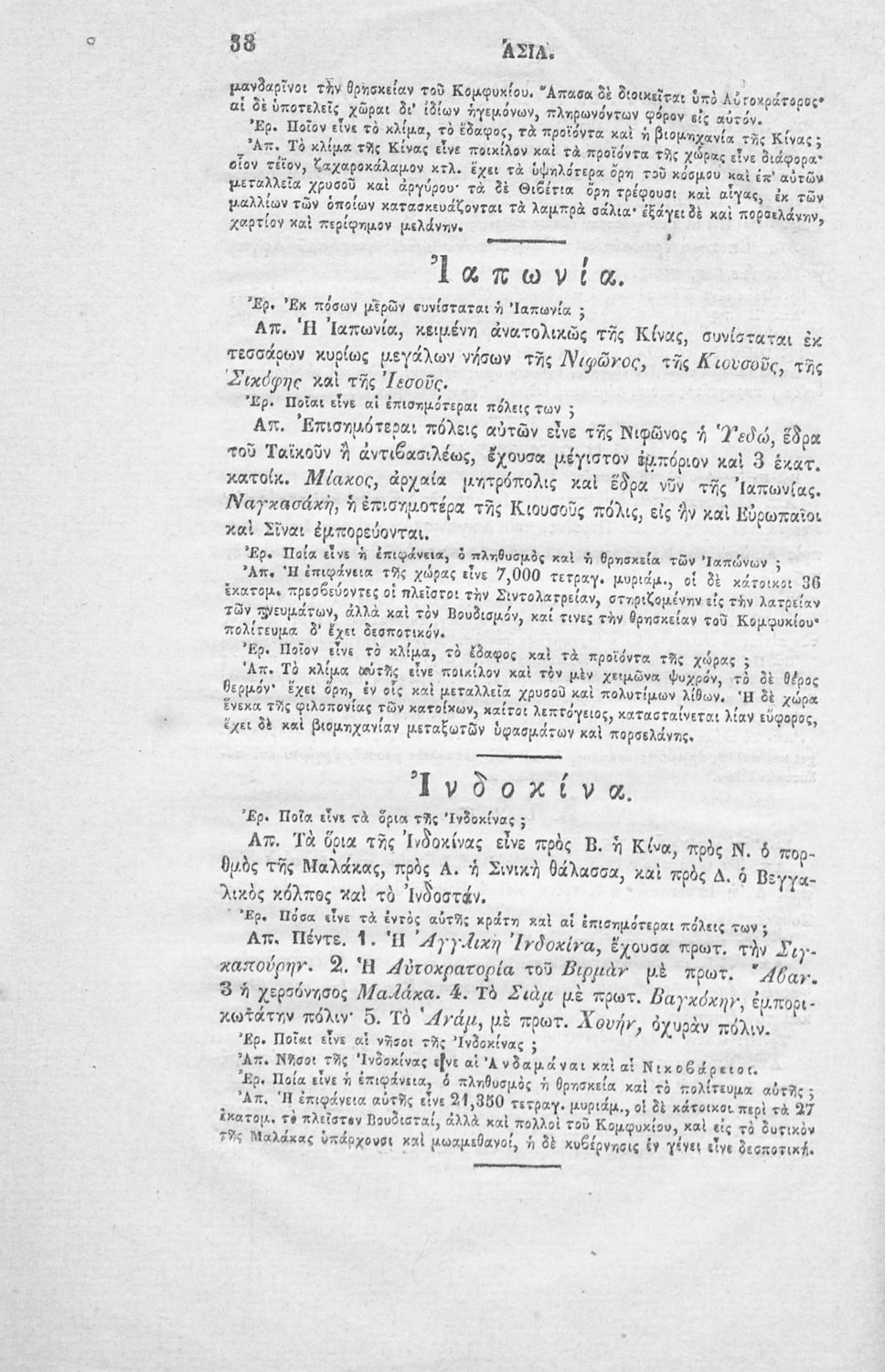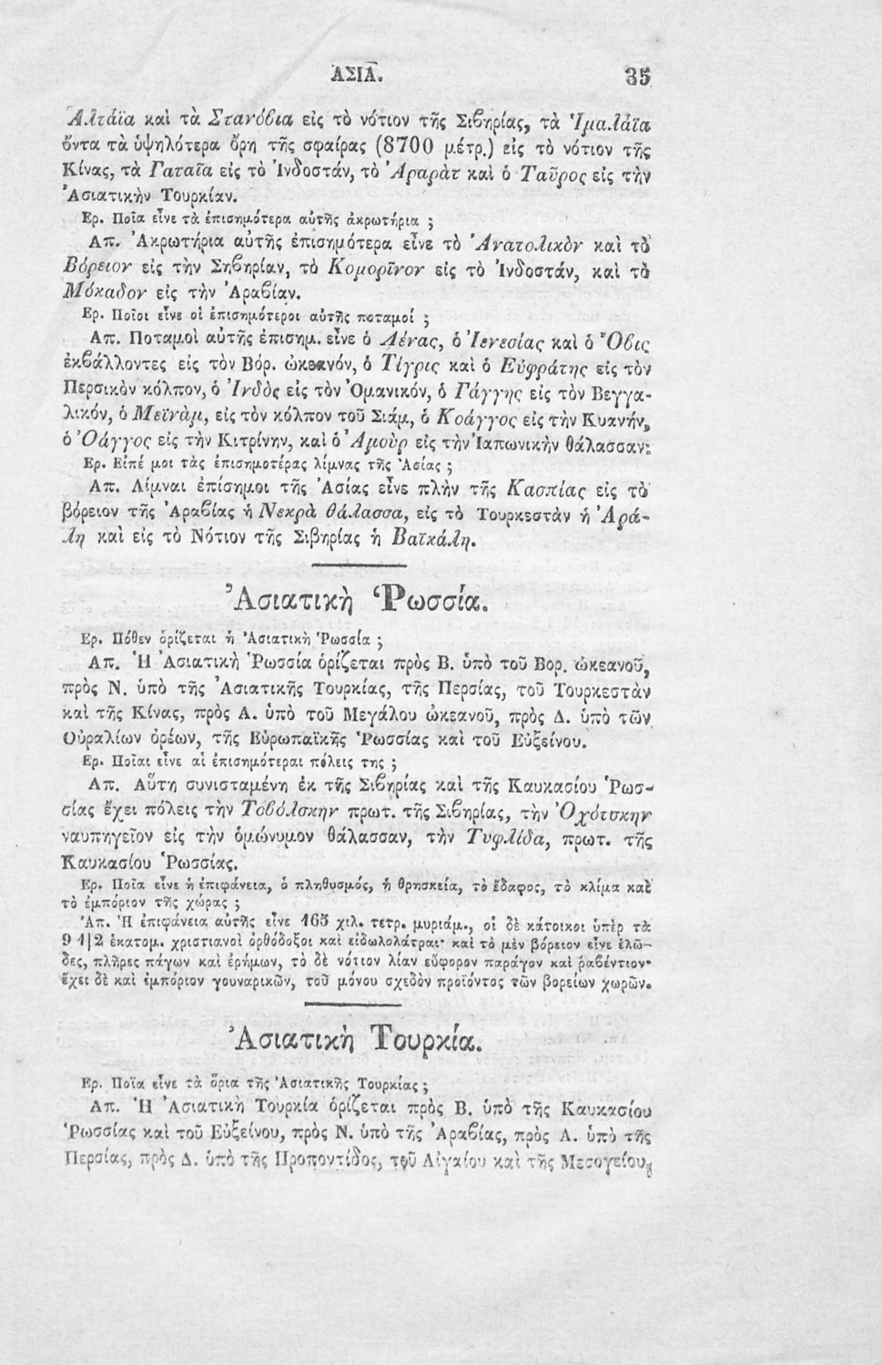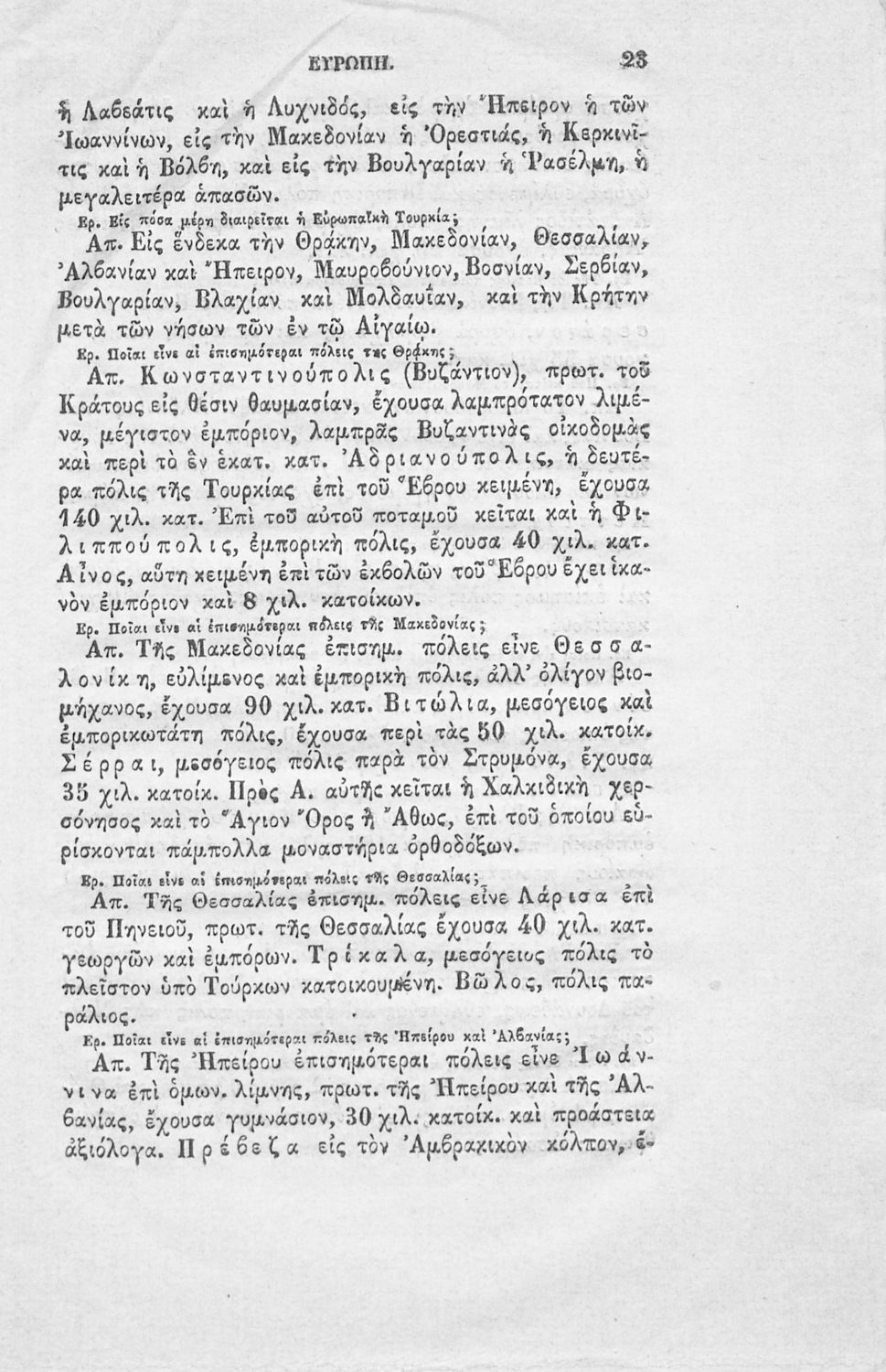 Σχολικό εγχειρίδιο Γεωγραφίας για τα Ελληνικά Σχολεία που περιλαμβάνει εισαγωγή στις βασικές έννοιες και ορισμούς της επιστήμης, και στοιχεία μαθηματικής, φυσικής και πολιτικής γεωγραφίας των πέντε ηπείρων.