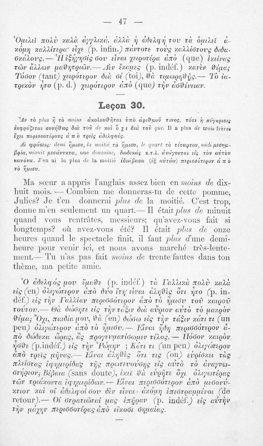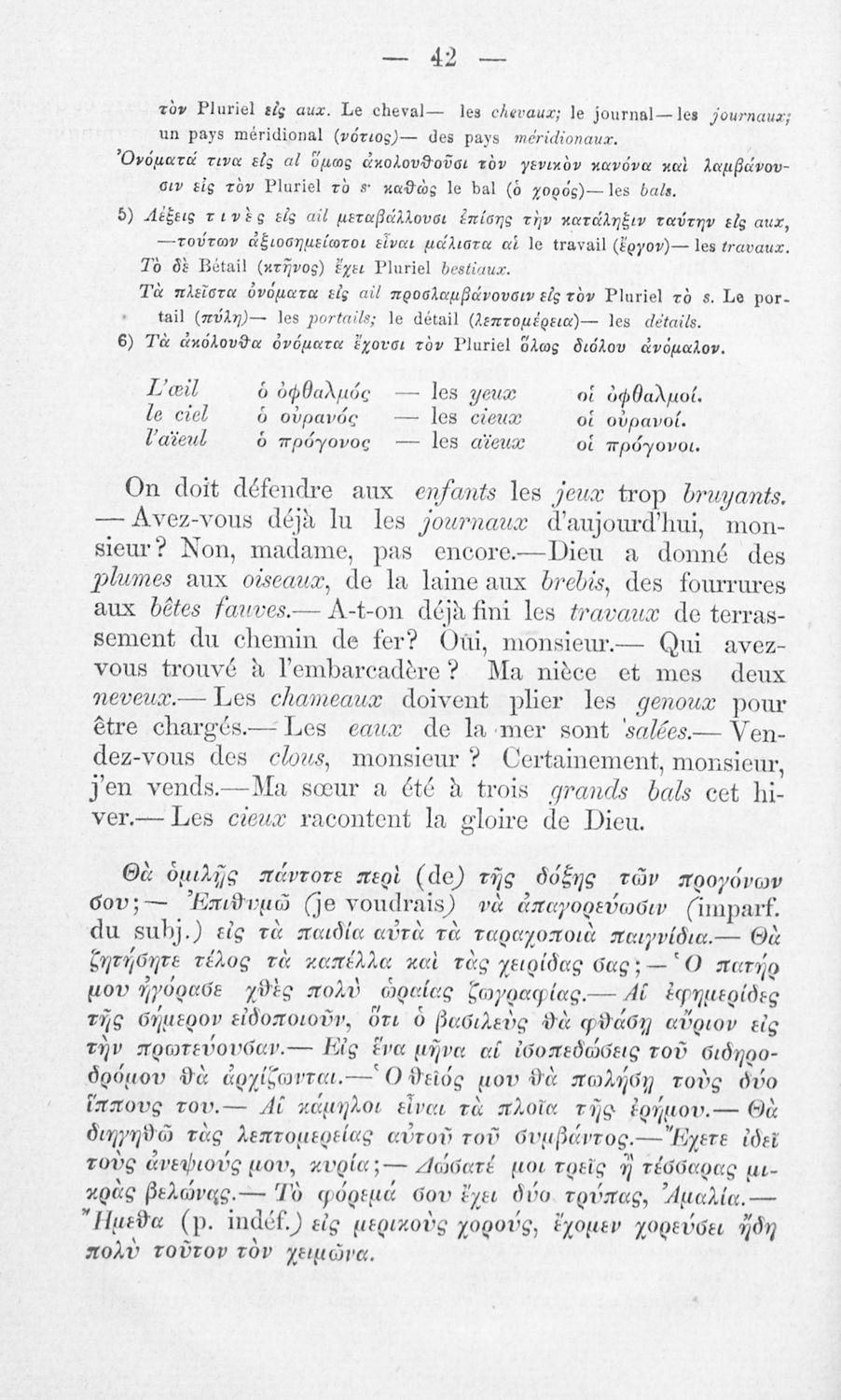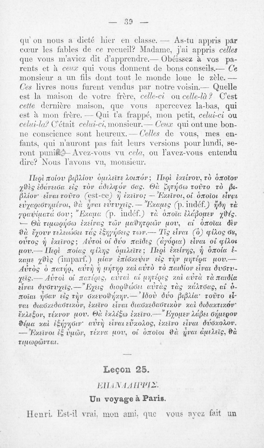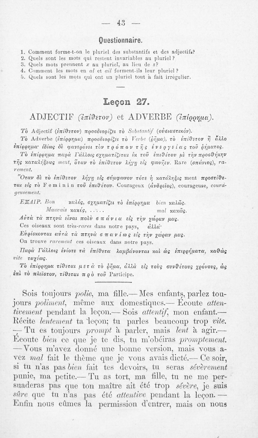 Σχολικό εγχειρίδιο Γαλλικών για τις Β’ και Γ’ Ελληνικού και Αστικού Σχολείου και Παρθεναγωγείου που περιλαμβάνει ασκήσεις προφοράς, συνομιλίας και γραμματικής, και λεξιλόγιο.