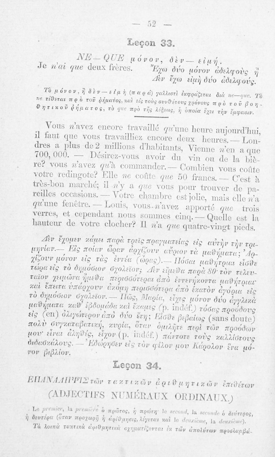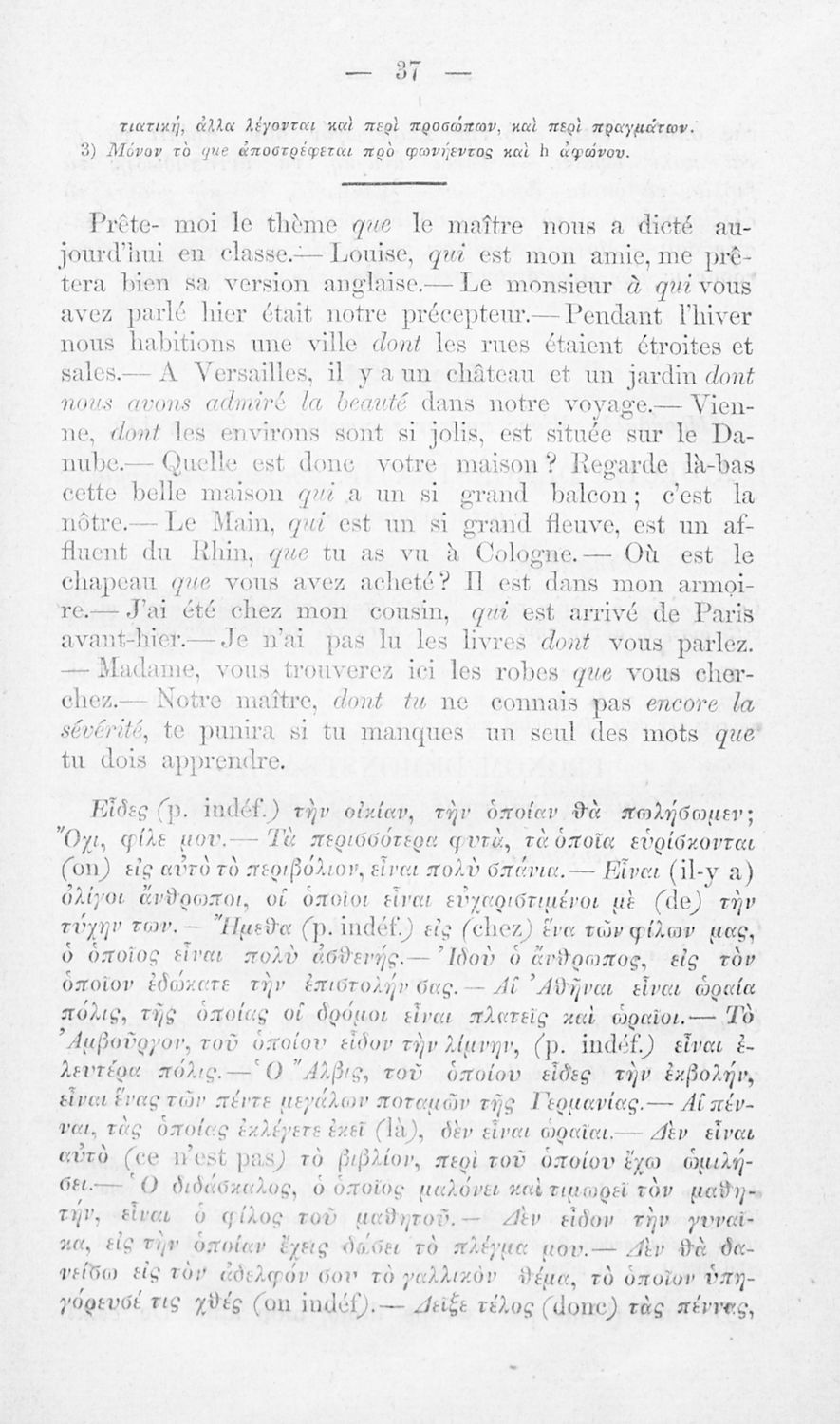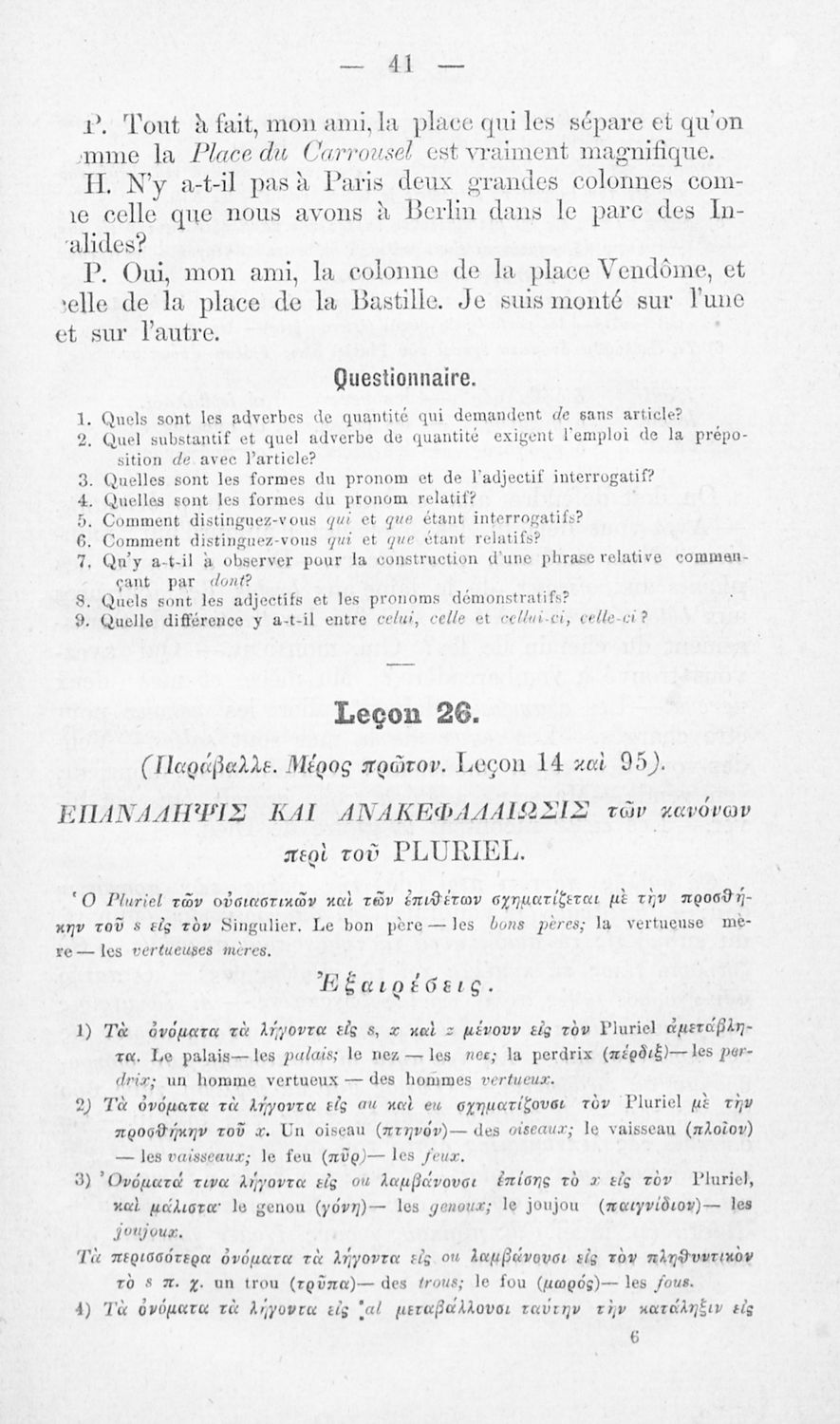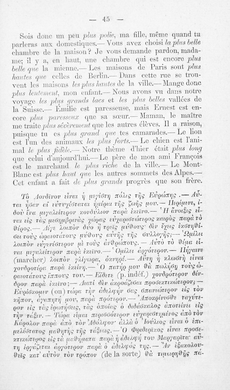 Σχολικό εγχειρίδιο Γαλλικών για τις Β’ και Γ’ Ελληνικού και Αστικού Σχολείου και Παρθεναγωγείου που περιλαμβάνει ασκήσεις προφοράς, συνομιλίας και γραμματικής, και λεξιλόγιο.