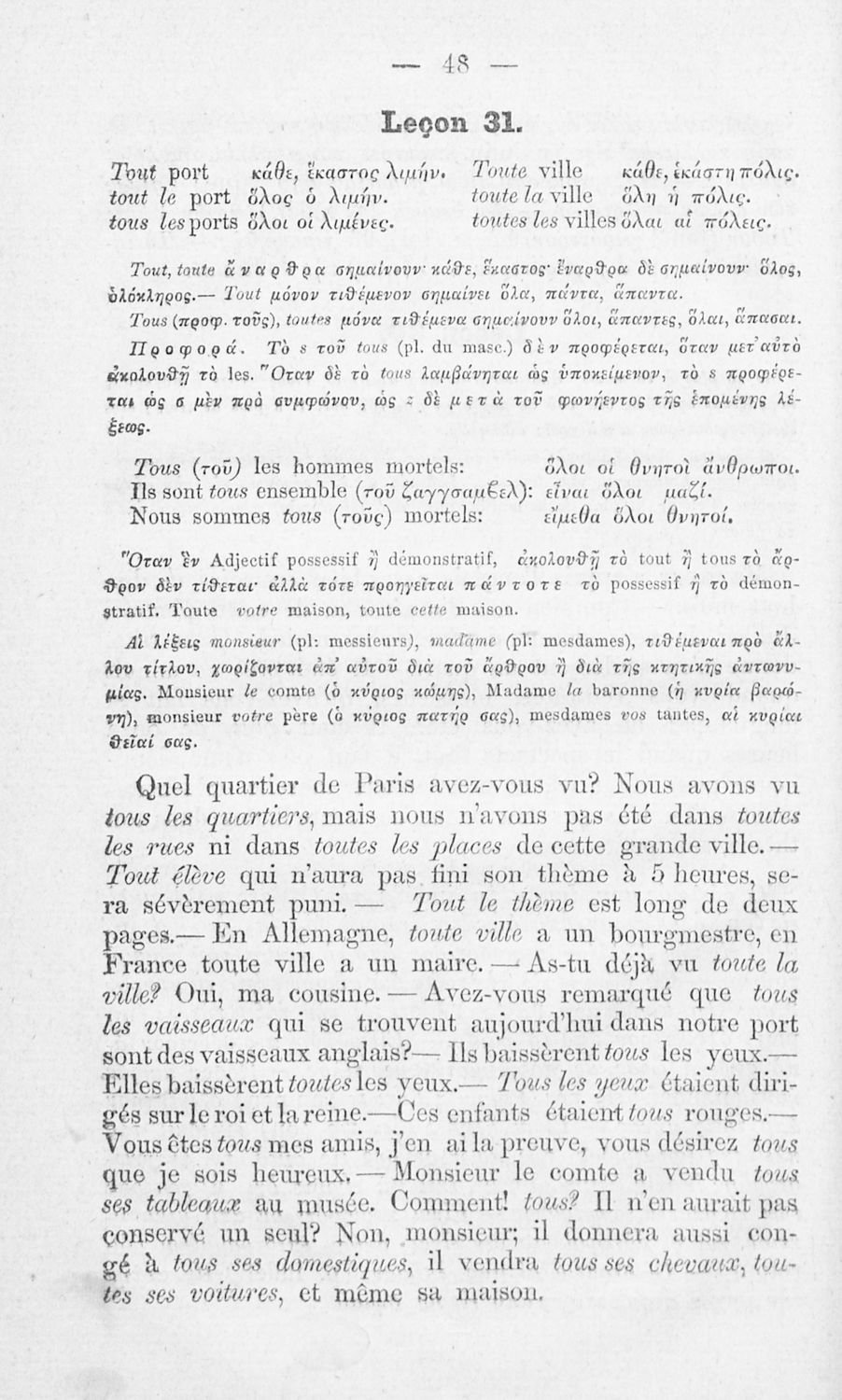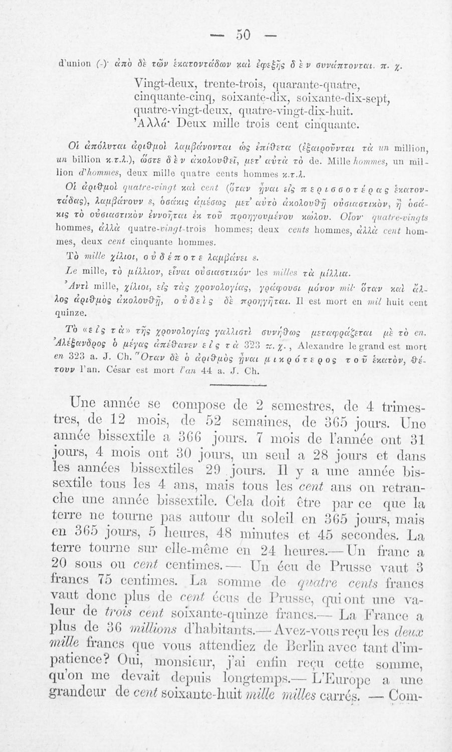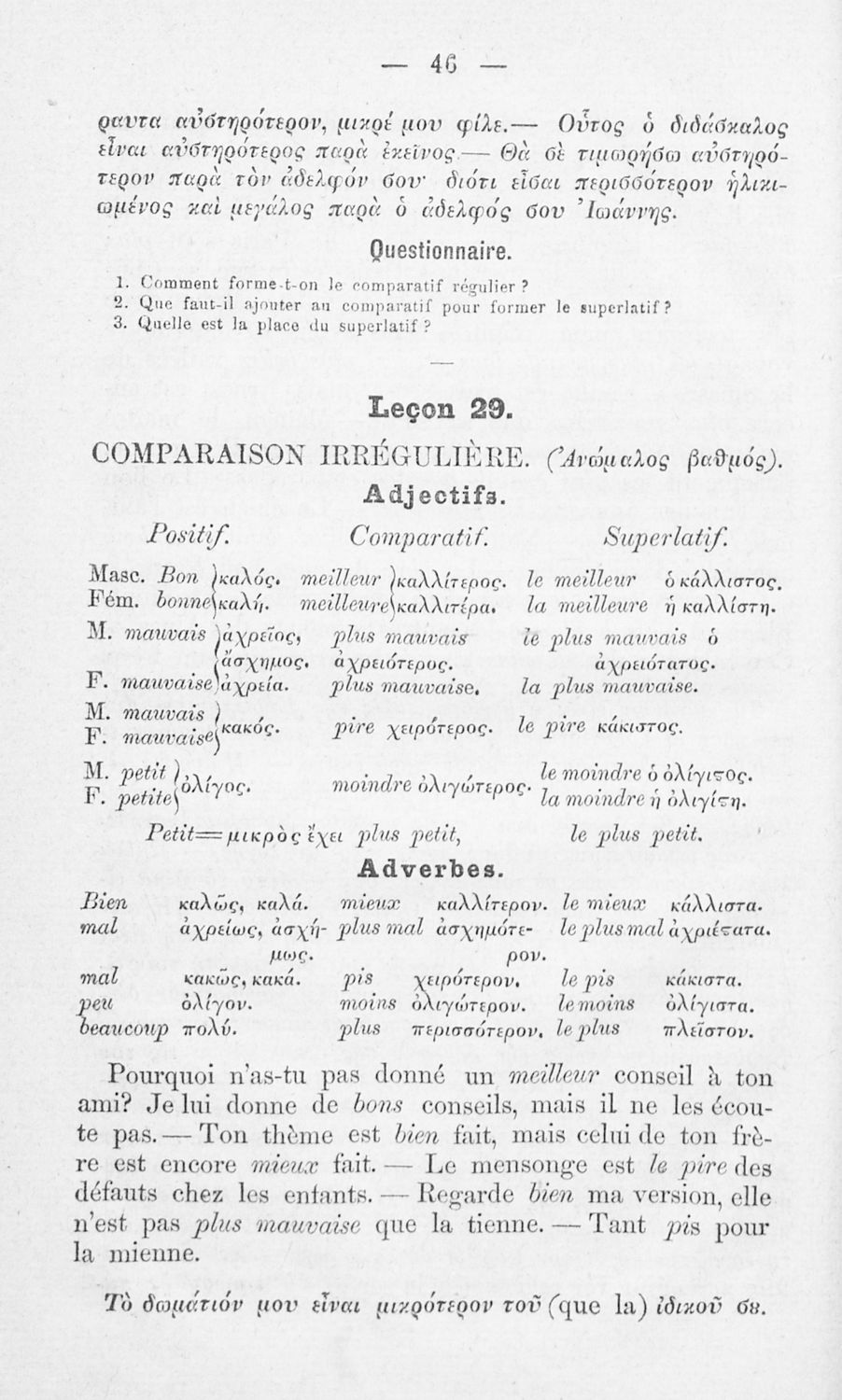 Σχολικό εγχειρίδιο Γαλλικών που περιλαμβάνει 54 κείμενα για τη διδασκαλία των γραμματικών και συντακτικών φαινομένων και της ορθογραφίας, λεξιλόγιο και παράρτημα με τους κανόνες συλλαβισμού.