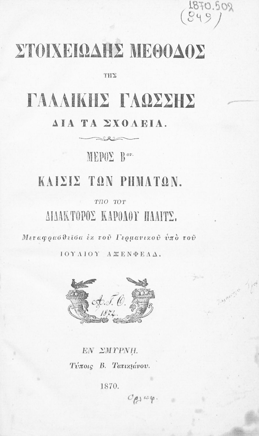Εκδότης: Β. Τατικλάνος Έτος έκδοσης: 1870 Τόπος έκδοσης: Σμύρνη |