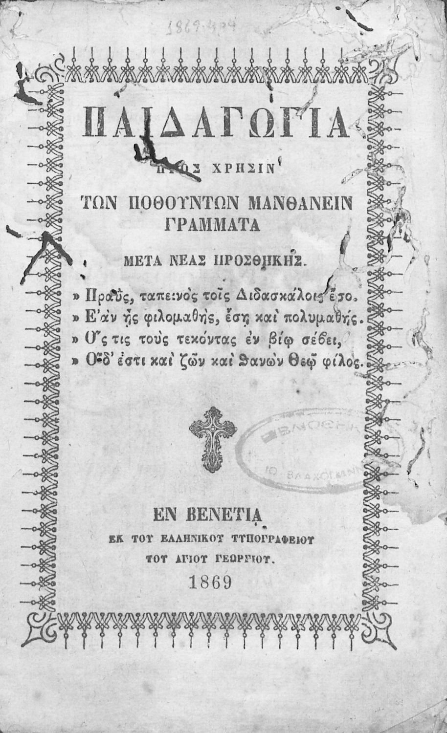 Εκδότης: Ελληνικό τυπογραφείο “Άγιος Γεώργιος” Έτος έκδοσης: 1869 Τόπος έκδοσης: Βενετία |