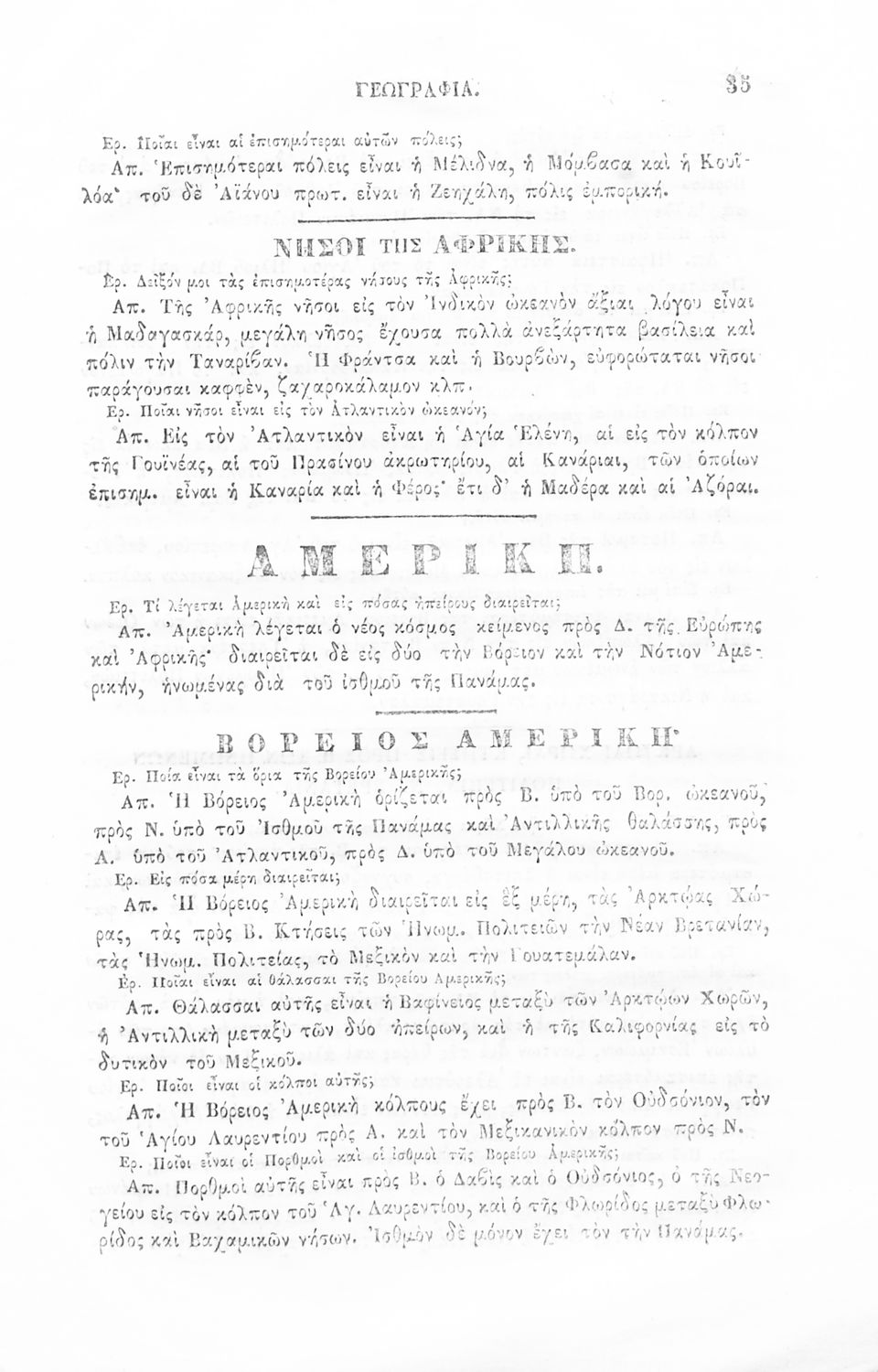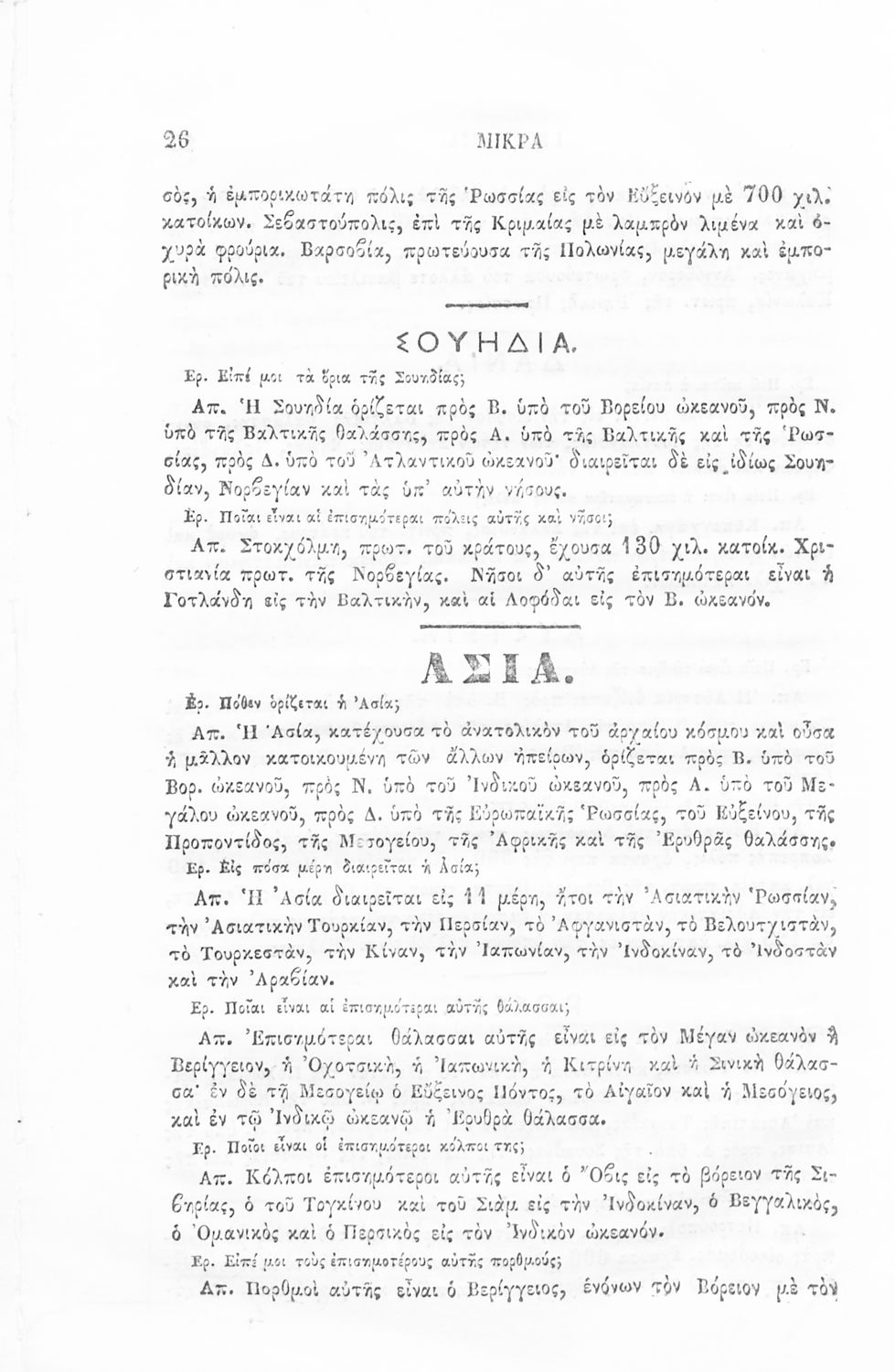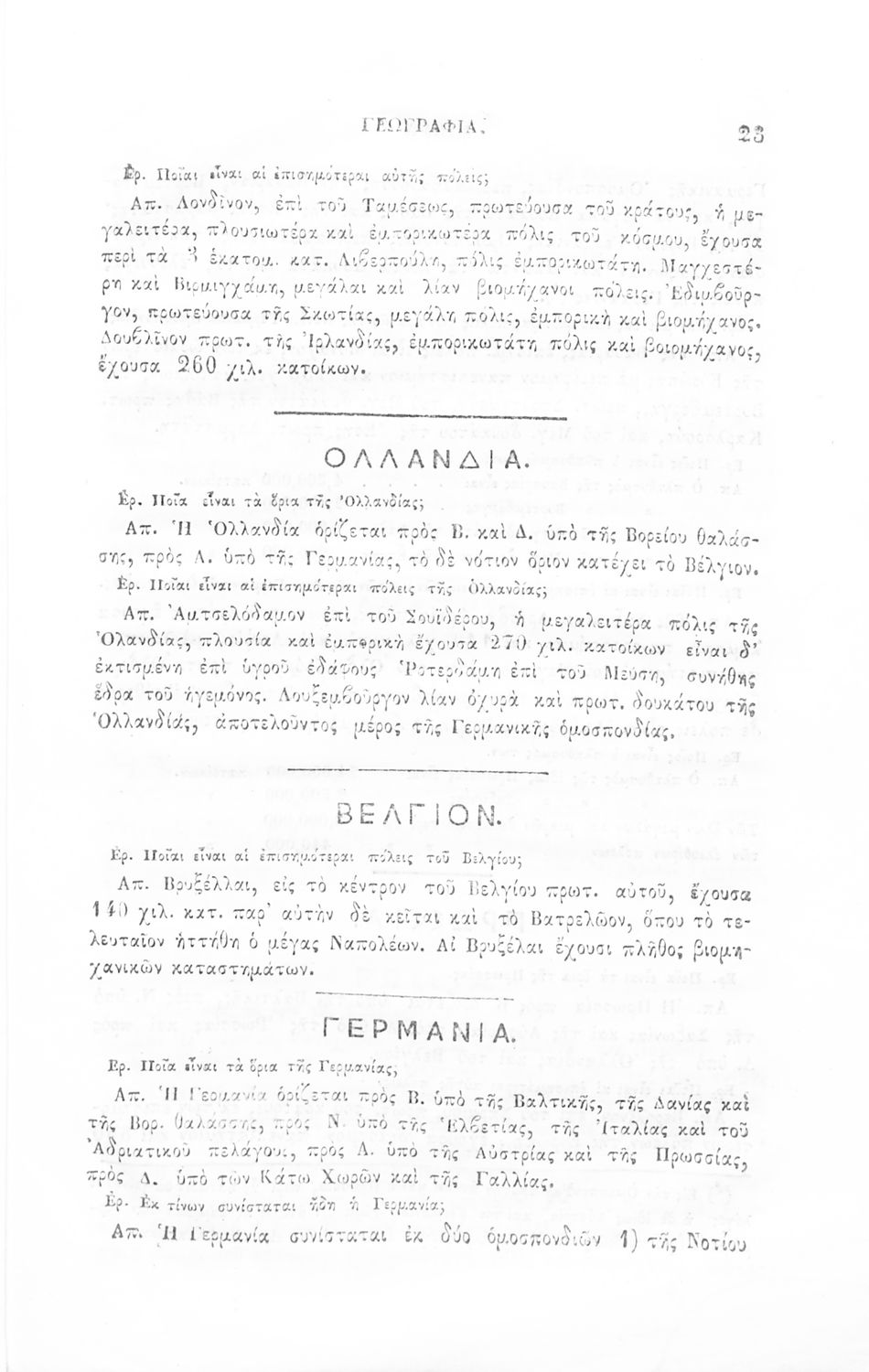 Βαθμίδα εκπαίδευσης: Πρωτοβάθμια Μάθημα: Γεωγραφία Γλώσσα: Καθαρεύουσα Παρουσίαση περιεχομένου: Σχολικό εγχειρίδιο Γεωγραφίας Δημοτικού που περιλαμβάνει σύντομες περιγραφές ηπείρων και χωρών. |
