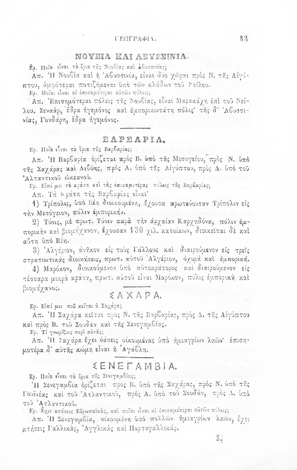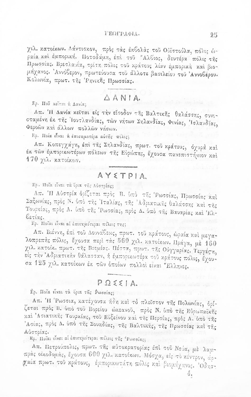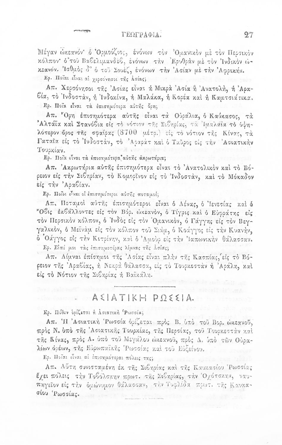 Βαθμίδα εκπαίδευσης: Πρωτοβάθμια Μάθημα: Γεωγραφία Γλώσσα: Καθαρεύουσα Παρουσίαση περιεχομένου: Σχολικό εγχειρίδιο Γεωγραφίας Δημοτικού που περιλαμβάνει σύντομες περιγραφές ηπείρων και χωρών. |