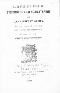 Κωδικός αναγνώρισης: 02-02928 Τίτλος: Ευμέθοδον αναγνωσματάριον της γαλλικής γλώσσης, προς χρήσιν της σπουδαζούσης νεολαίας Συγγραφέας: Κωνσταντίνος Λιβέριος (επιμ.) Μέγεθος και υπόστρωμα: Μαθητικό βοήθημα, μαλακό εξώφυλλο, 48 σελίδες. |