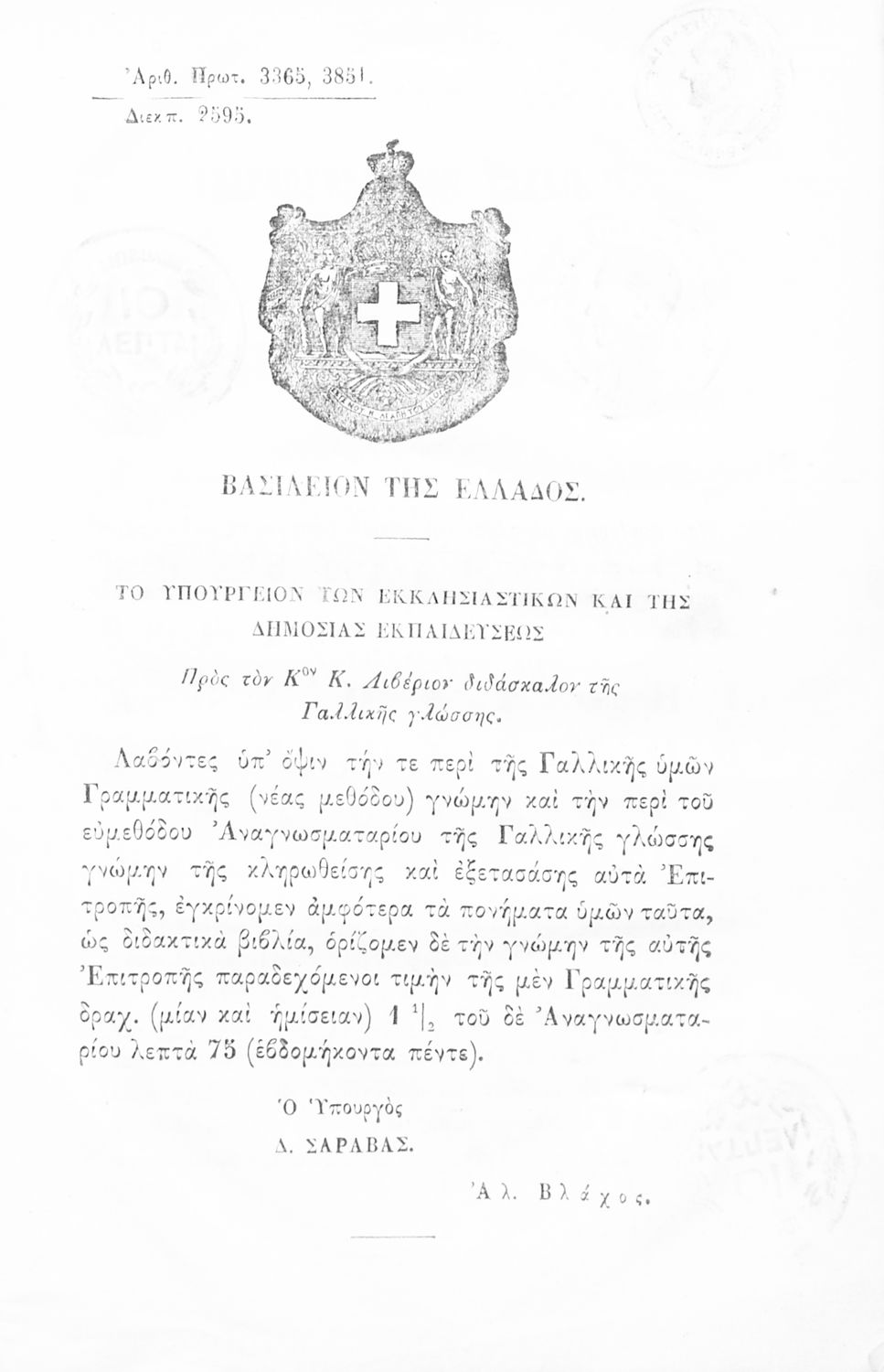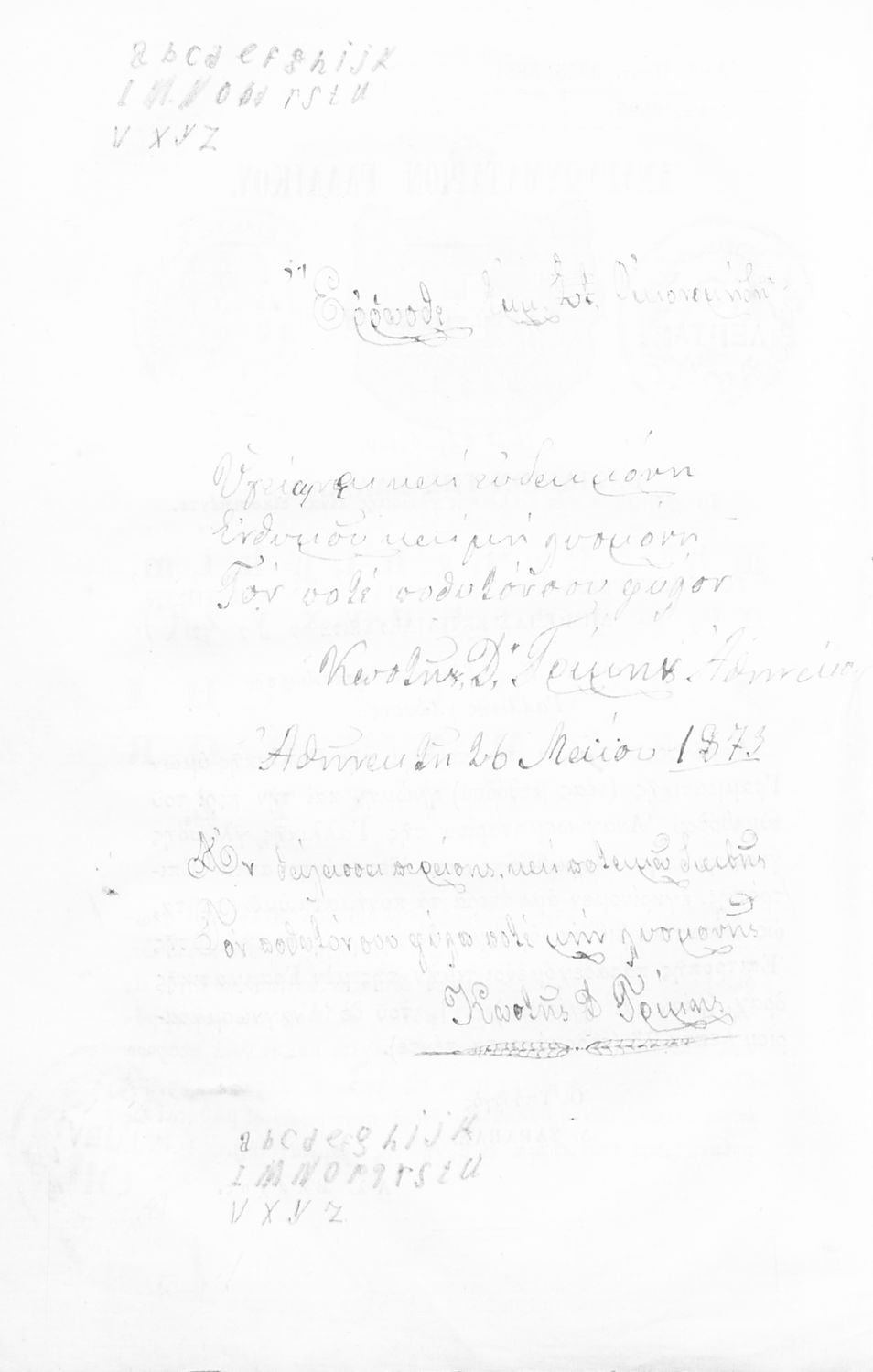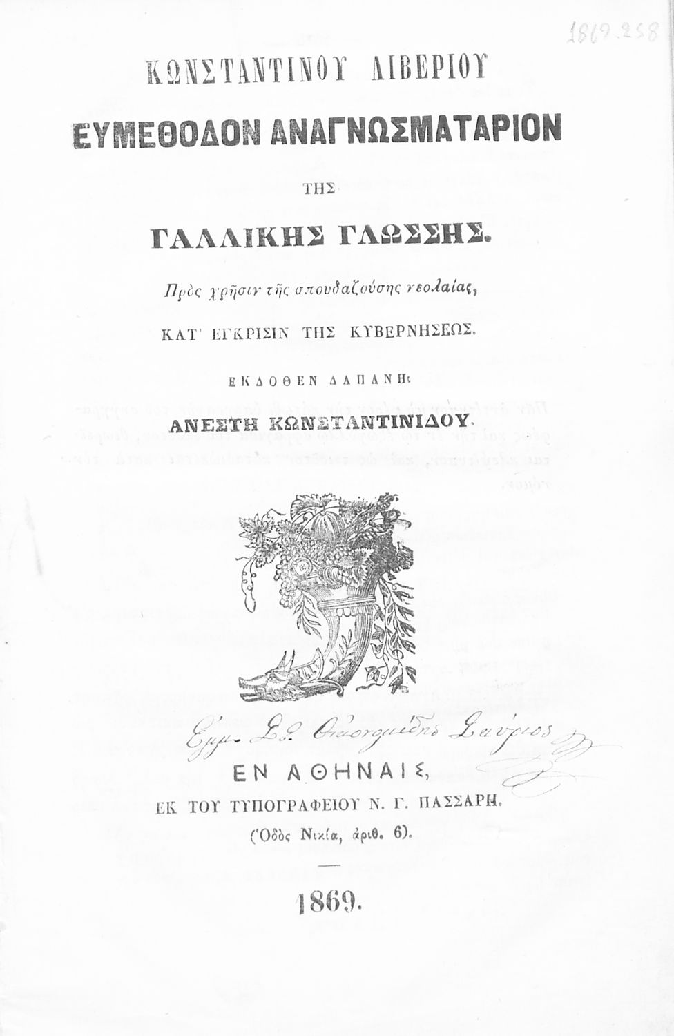 Εκδότης: Ανέστης Κωνσταντινίδης Έτος έκδοσης: 1869 Τόπος έκδοσης: Αθήνα Υπουργική απόφαση / Σύμβαση: 3365,3851/24-6-1869 |