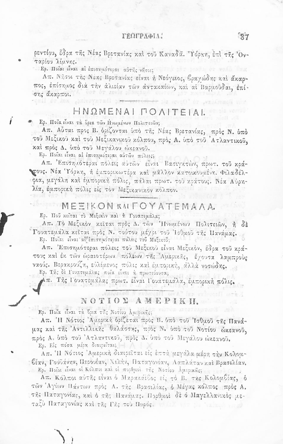 Σχολικό εγχειρίδιο Γεωγραφίας για τα Ελληνικά Σχολεία που περιλαμβάνει στοιχεία κοσμογραφίας, μαθηματικής, και φυσικής γεωγραφίας και εξετάζει ενδεικτικά κράτη από τις πέντε ηπείρους από πολιτική, γεωφυσική ...
