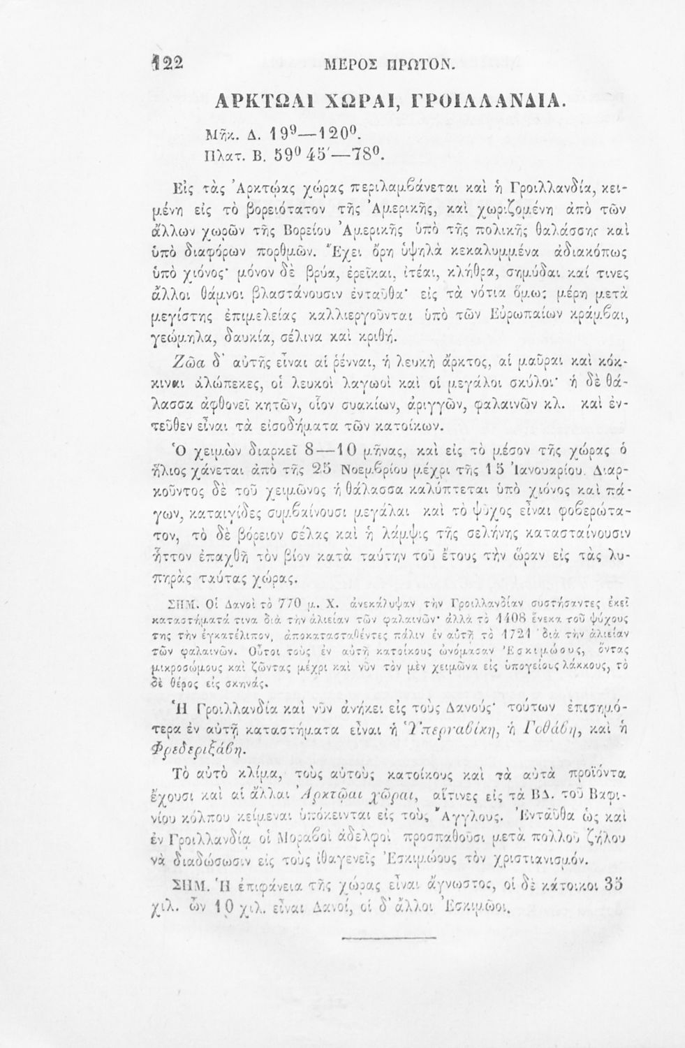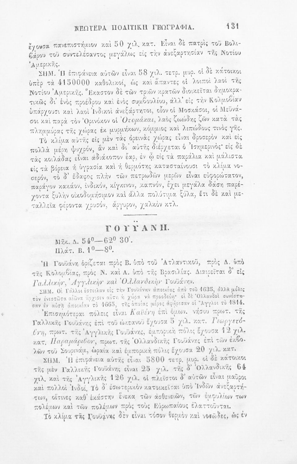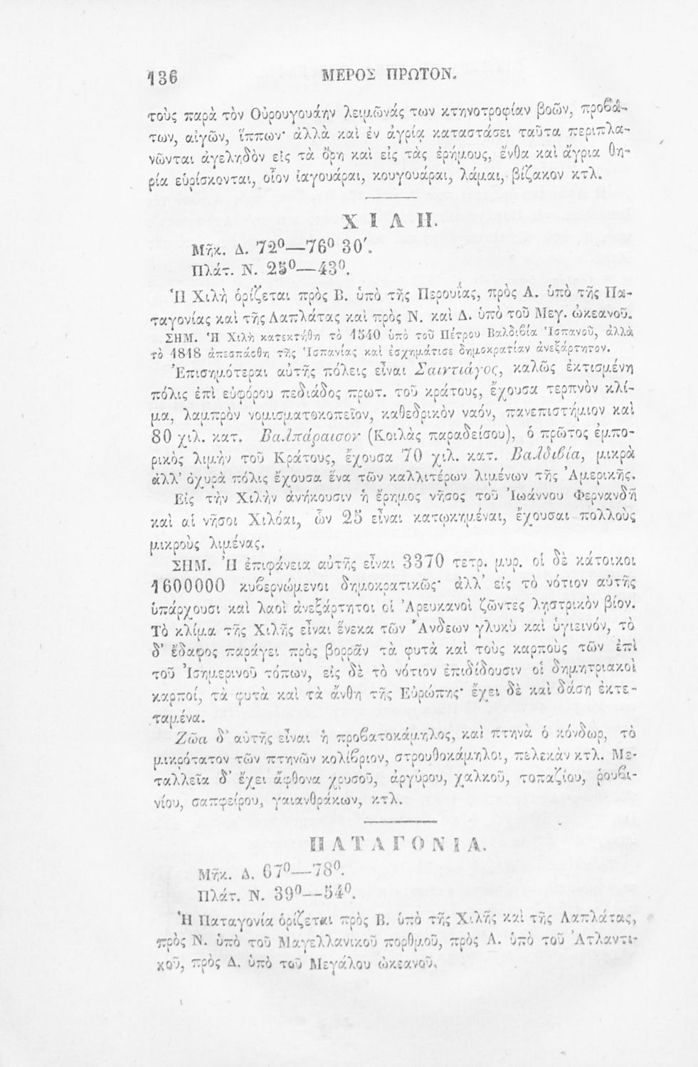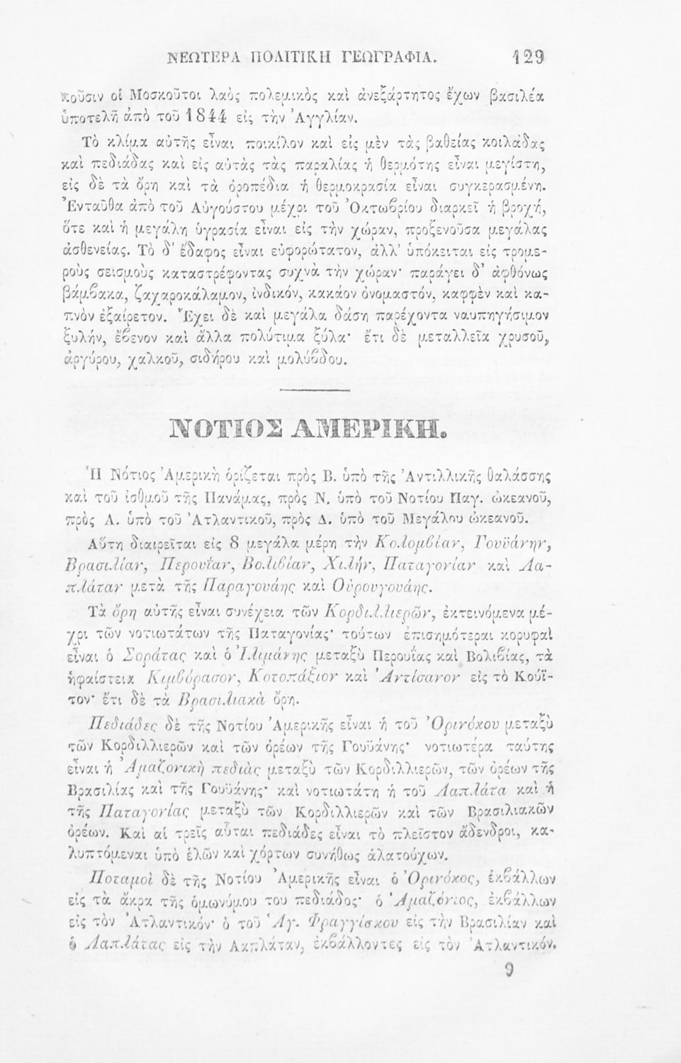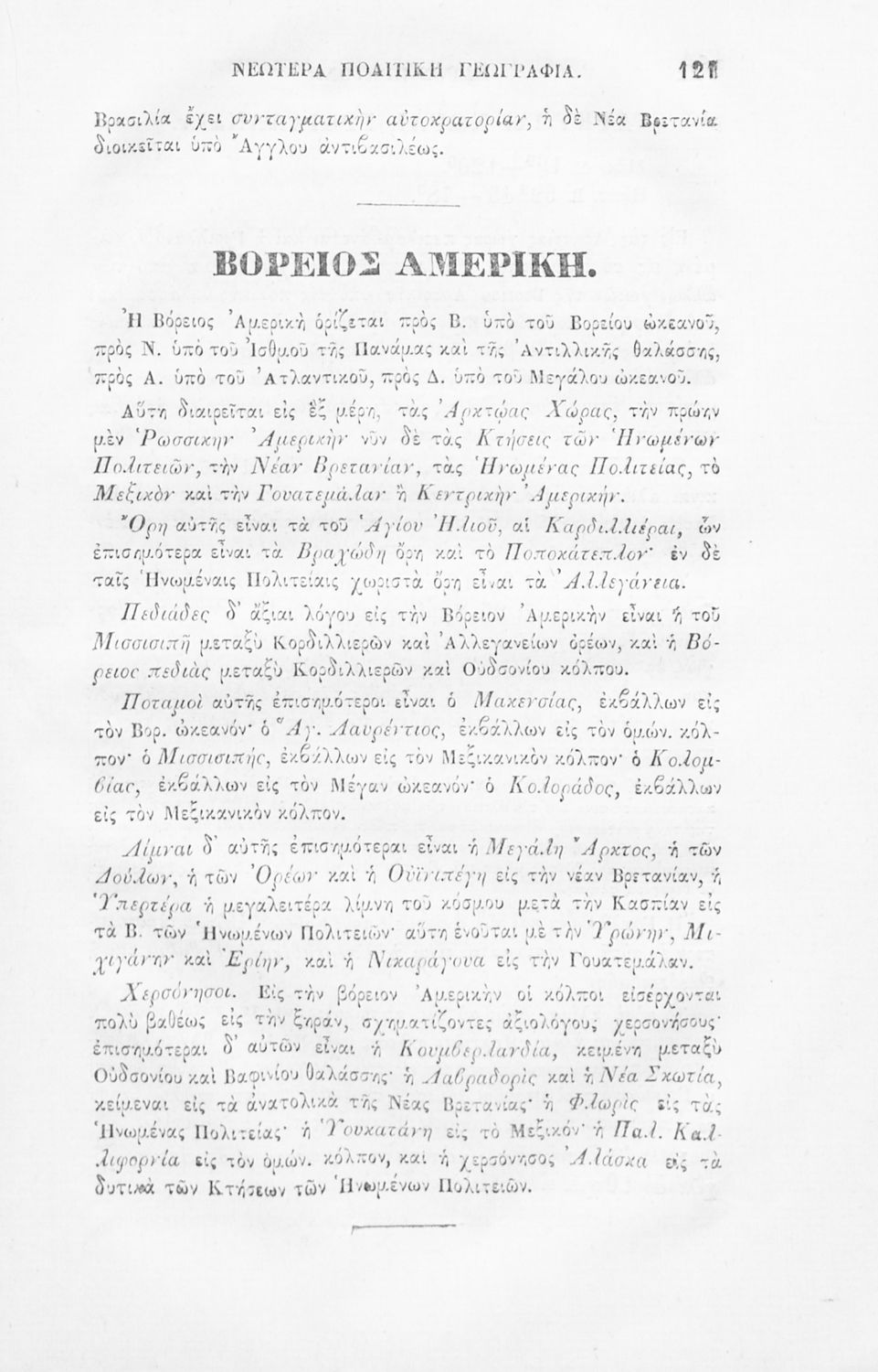 Σχολικό εγχειρίδιο Γεωγραφίας για τα Ελληνικά Σχολεία που περιλαμβάνει εισαγωγή στις βασικές έννοιες και ορισμούς της επιστήμης, και στοιχεία μαθηματικής, φυσικής και πολιτικής γεωγραφίας των πέντε ηπείρων.