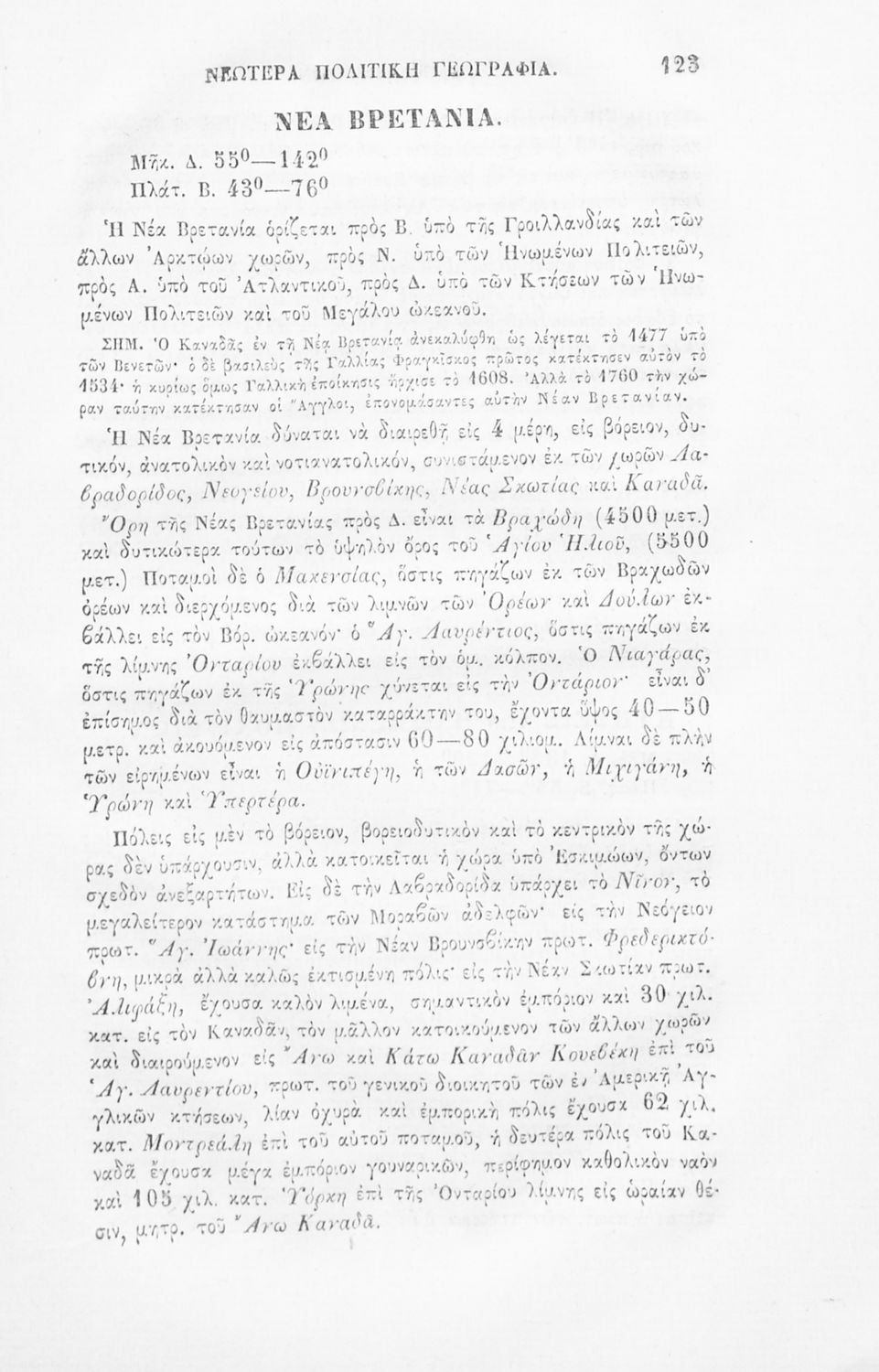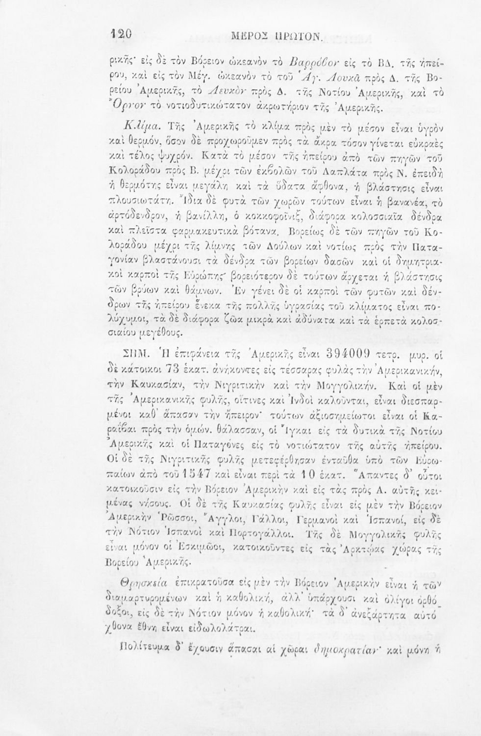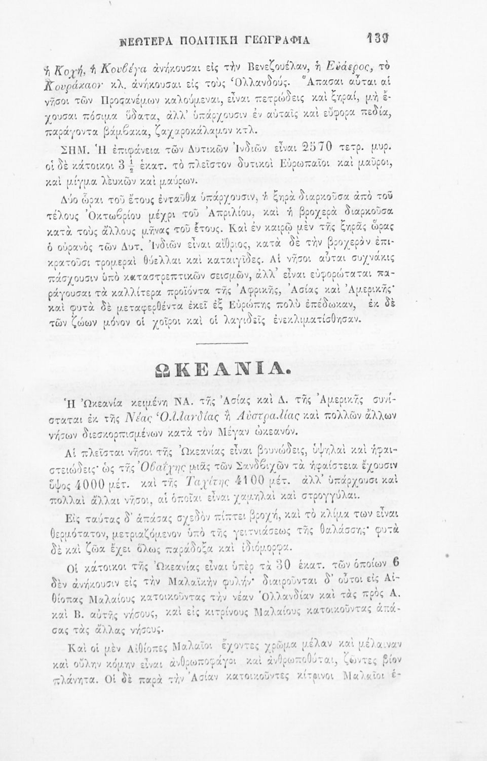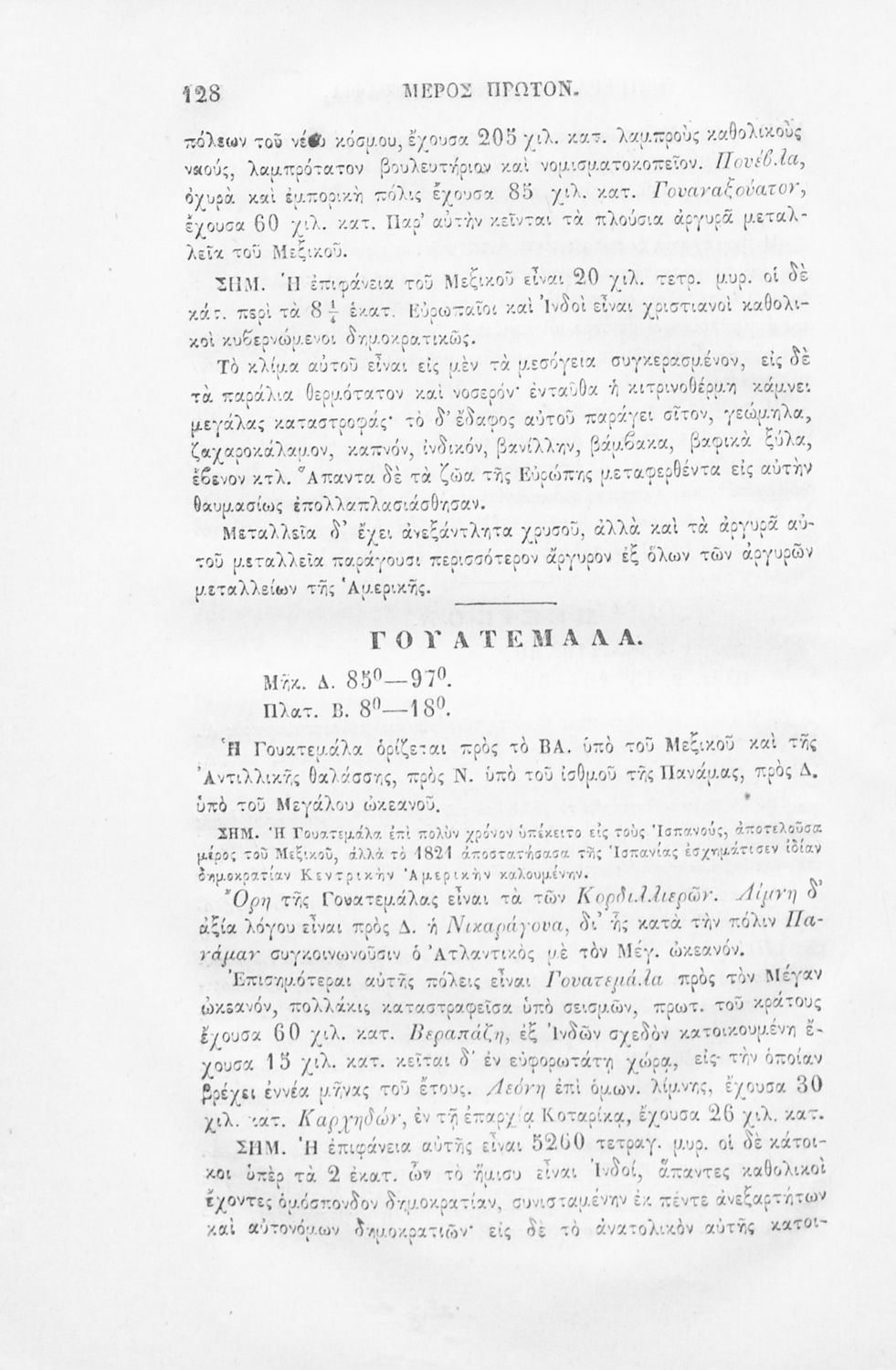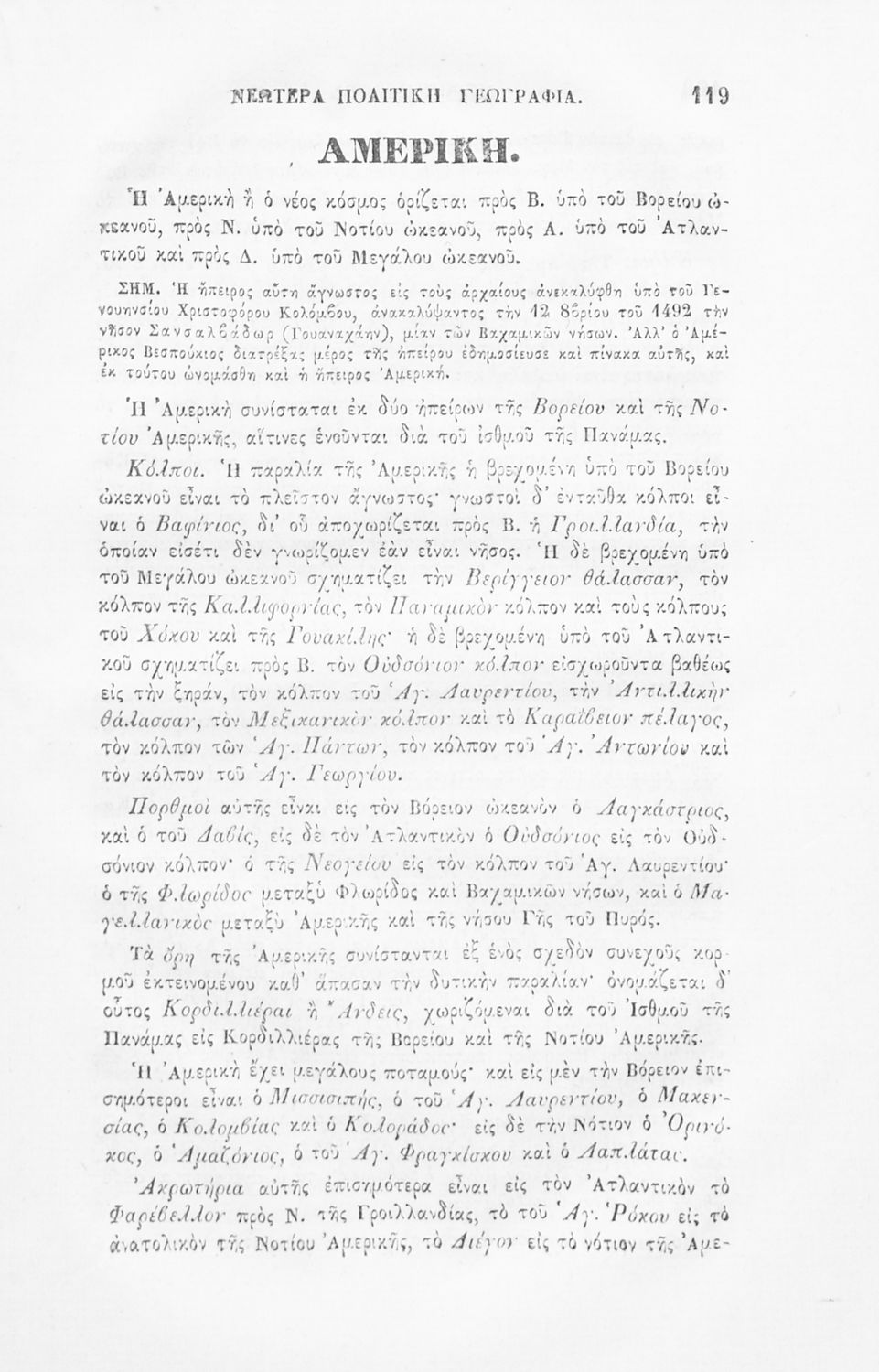 Σχολικό εγχειρίδιο Γεωγραφίας για τα Ελληνικά Σχολεία που περιλαμβάνει εισαγωγή στις βασικές έννοιες και ορισμούς της επιστήμης, και στοιχεία μαθηματικής, φυσικής και πολιτικής γεωγραφίας των πέντε ηπείρων.