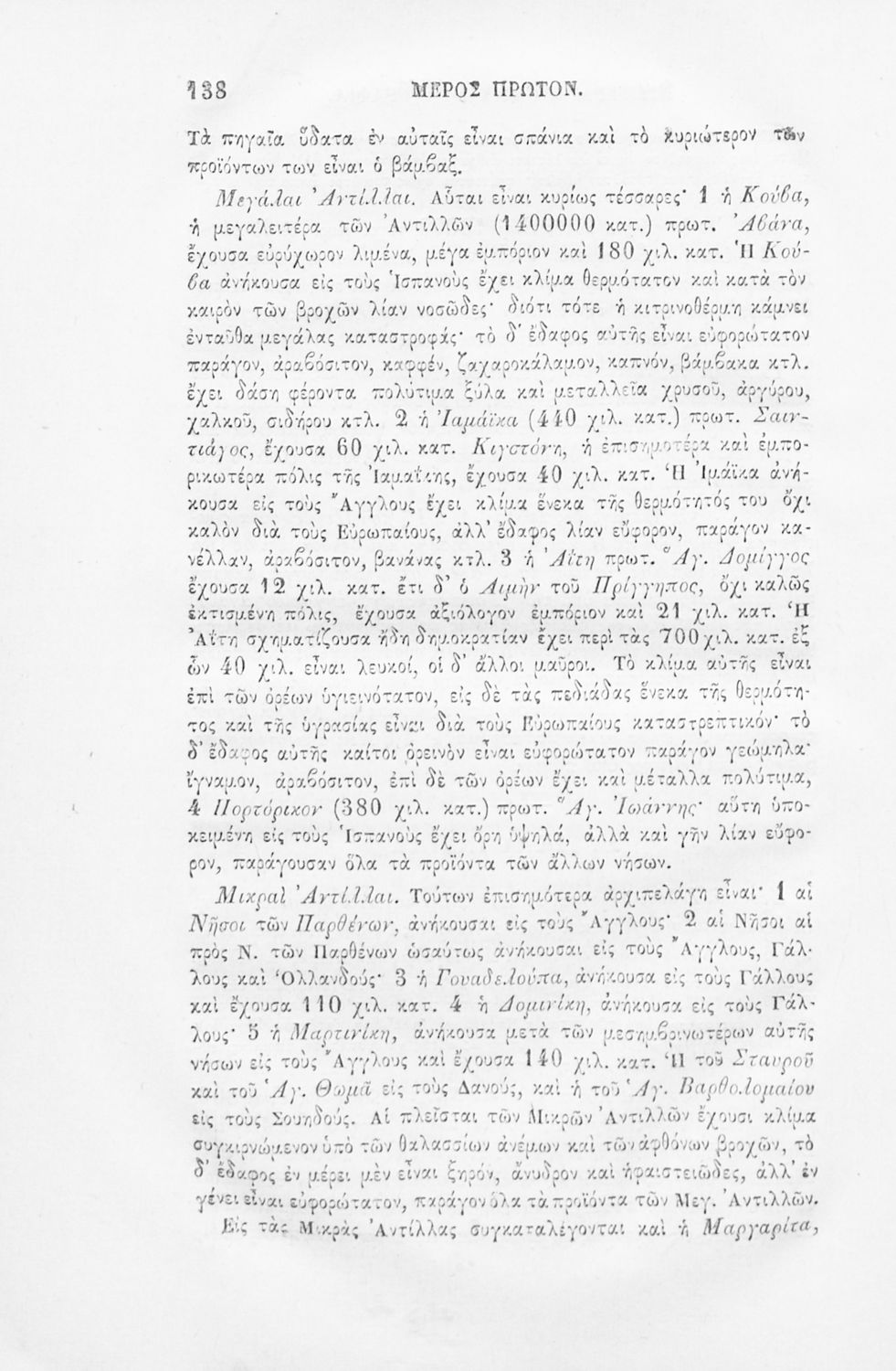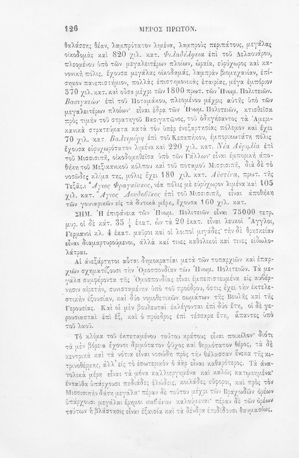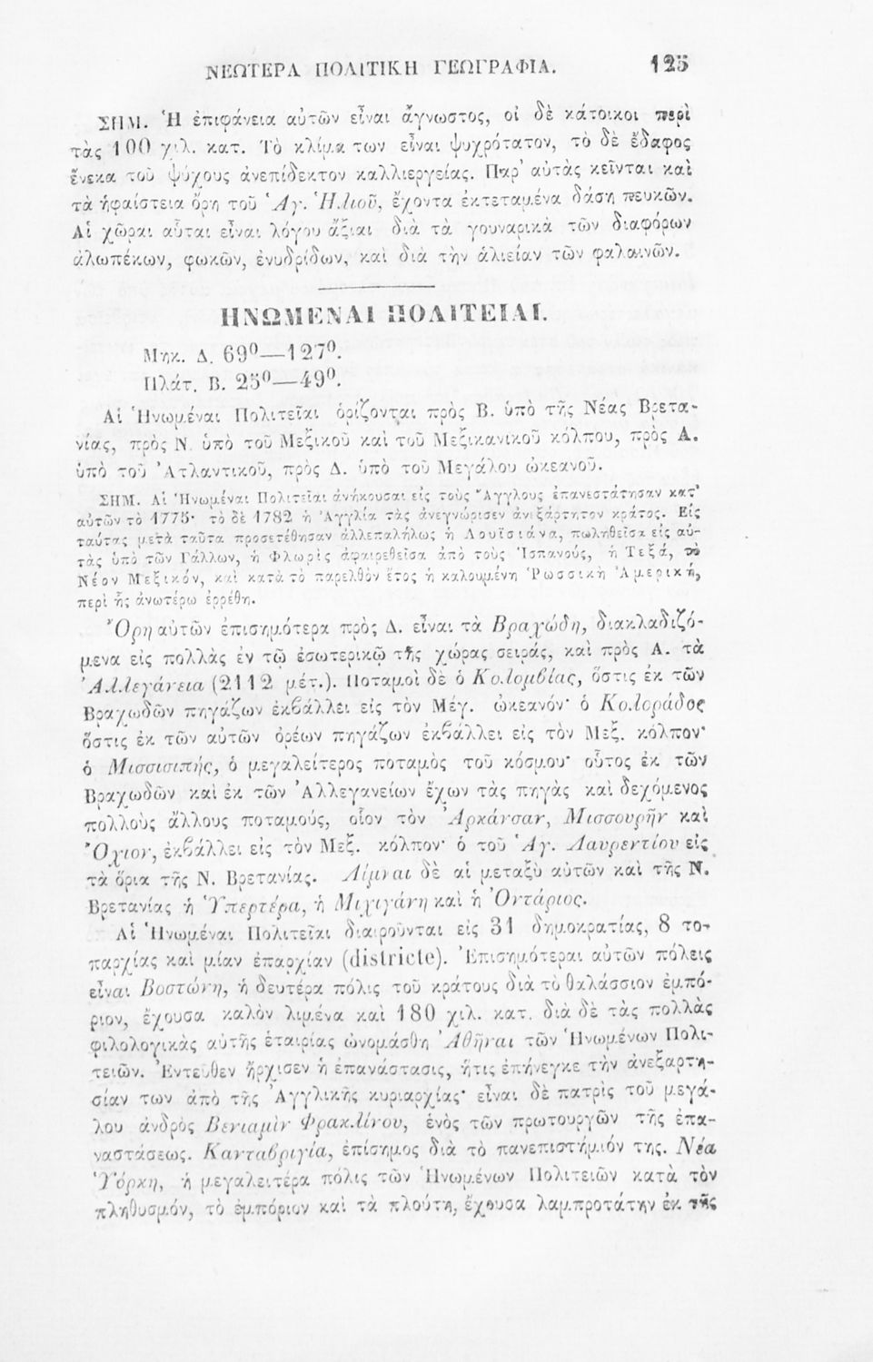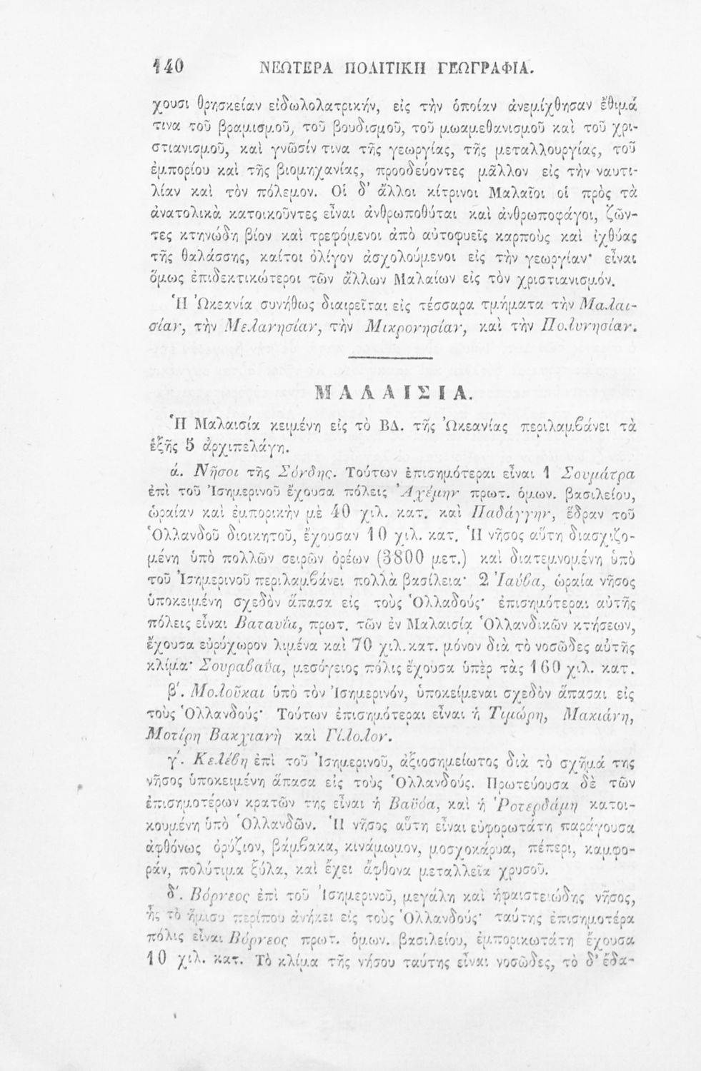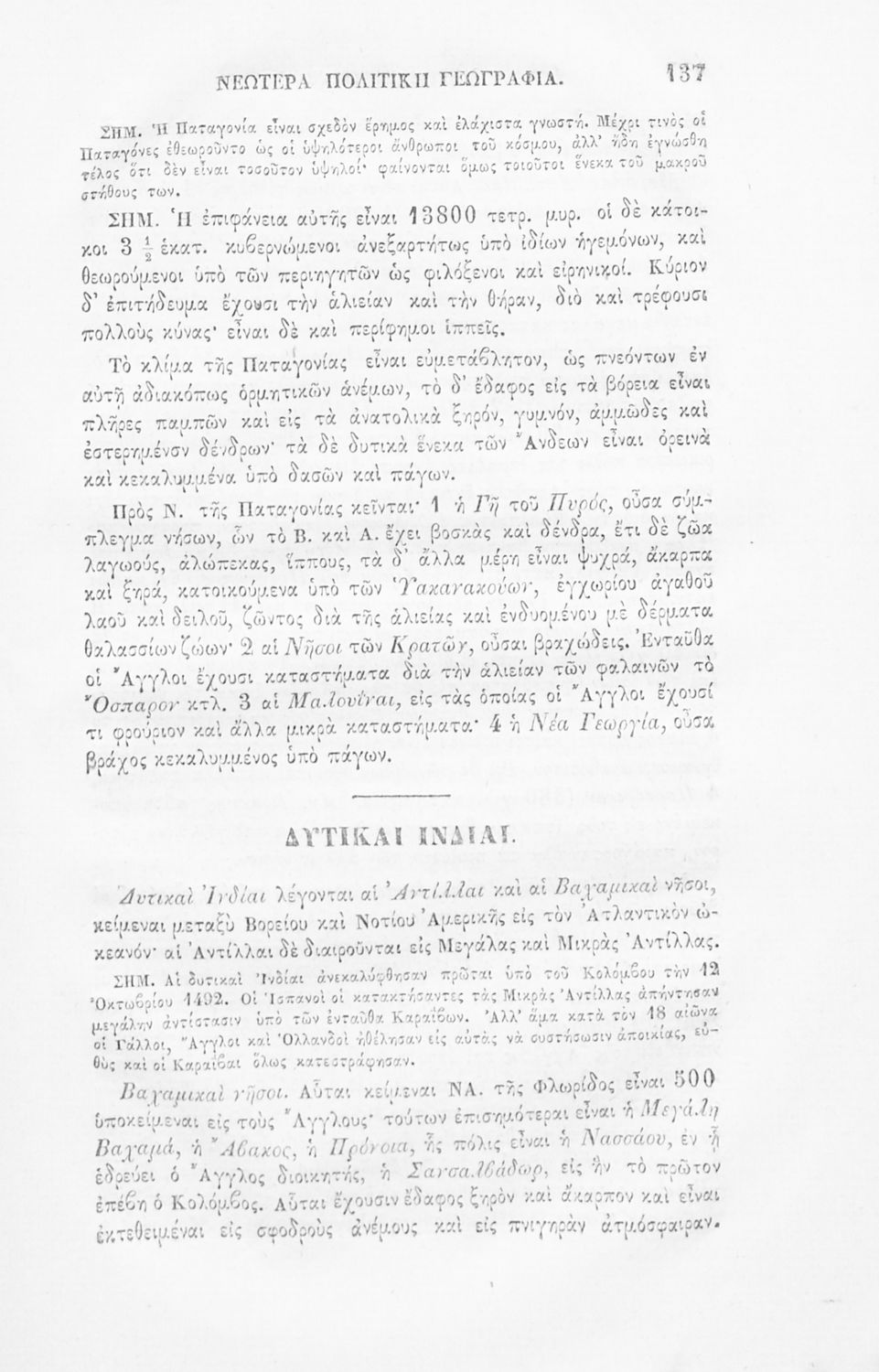 Σχολικό εγχειρίδιο Γεωγραφίας για τα Ελληνικά Σχολεία που περιλαμβάνει εισαγωγή στις βασικές έννοιες και ορισμούς της επιστήμης, και στοιχεία μαθηματικής, φυσικής και πολιτικής γεωγραφίας των πέντε ηπείρων.