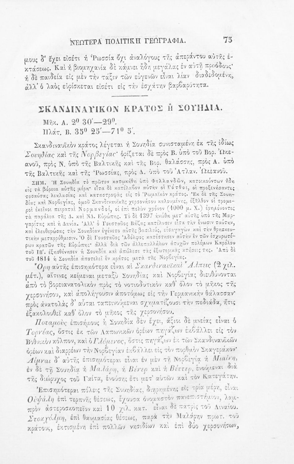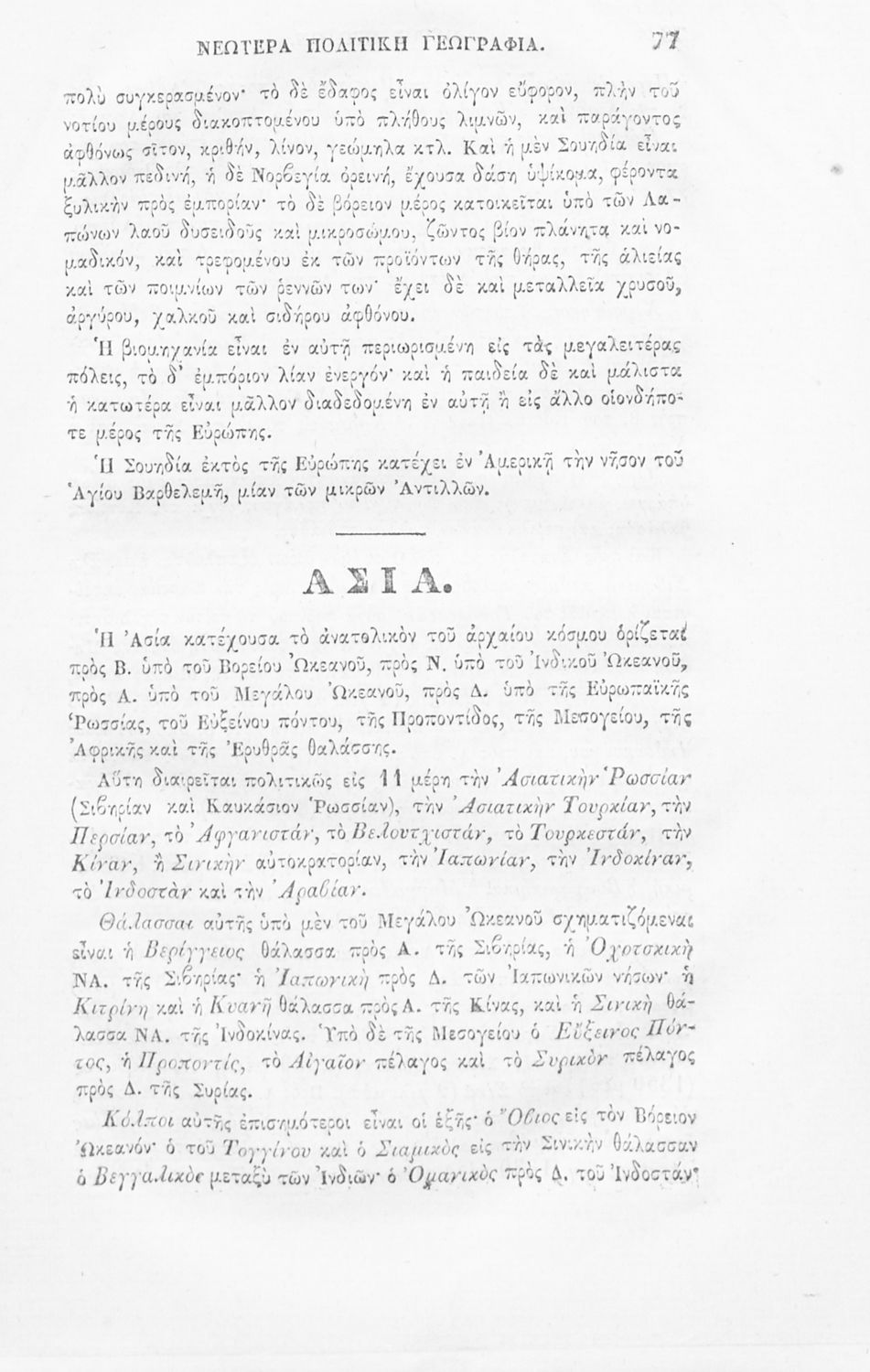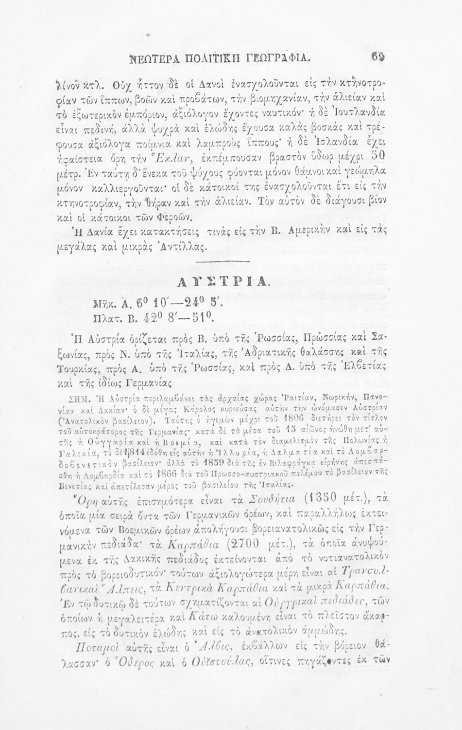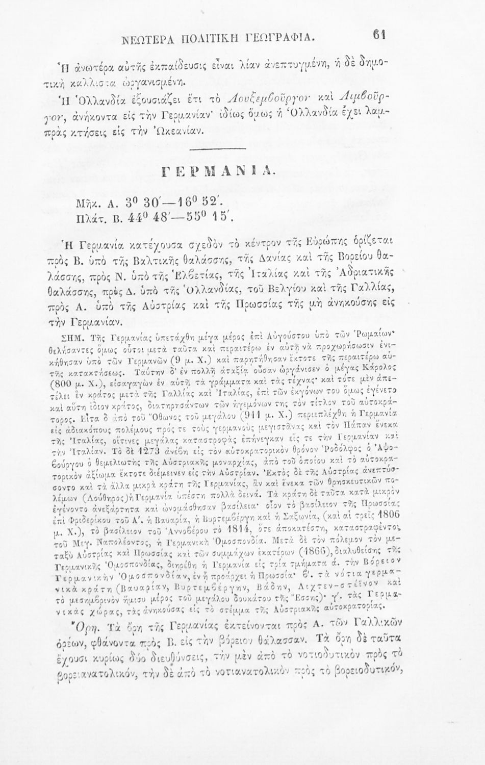 Σχολικό εγχειρίδιο Γεωγραφίας για τα Ελληνικά Σχολεία που περιλαμβάνει εισαγωγή στις βασικές έννοιες και ορισμούς της επιστήμης, και στοιχεία μαθηματικής, φυσικής και πολιτικής γεωγραφίας των πέντε ηπείρων.