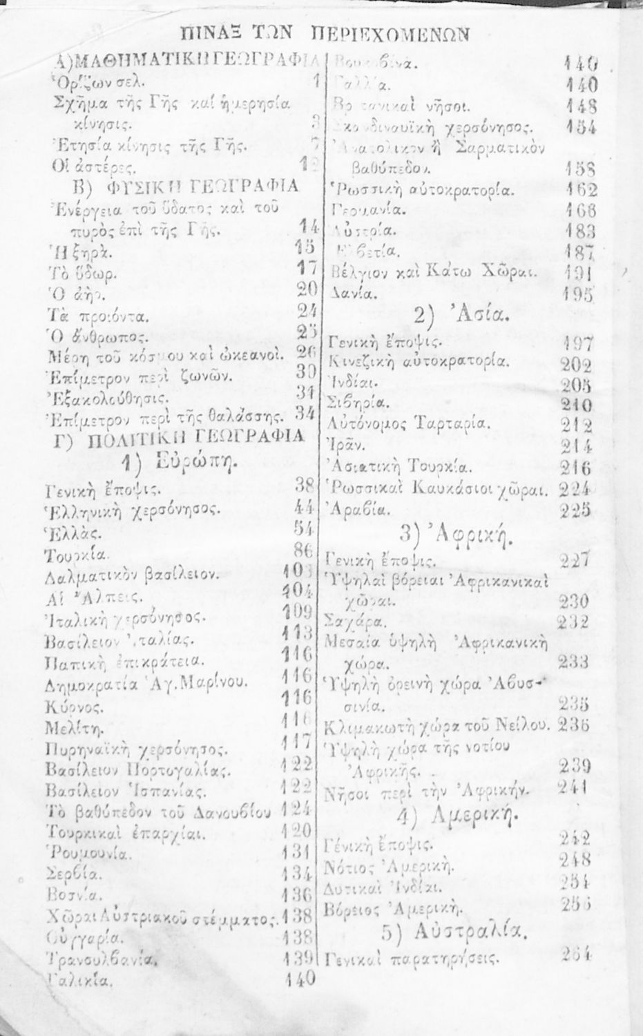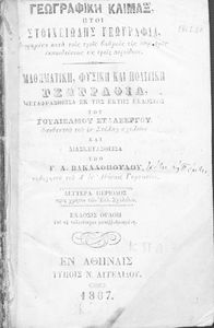 Σχολικό εγχειρίδιο Γεωγραφίας για τα Ελληνικά Σχολεία και Παρθεναγωγεία που περιλαμβάνει εισαγωγή στη φυσική, πολιτική και οικονομική γεωγραφία και μια γενική επισκόπηση της Ελλάδας και της Ευρωπαϊκής Τουρκίας