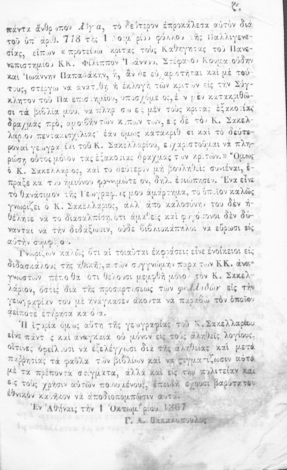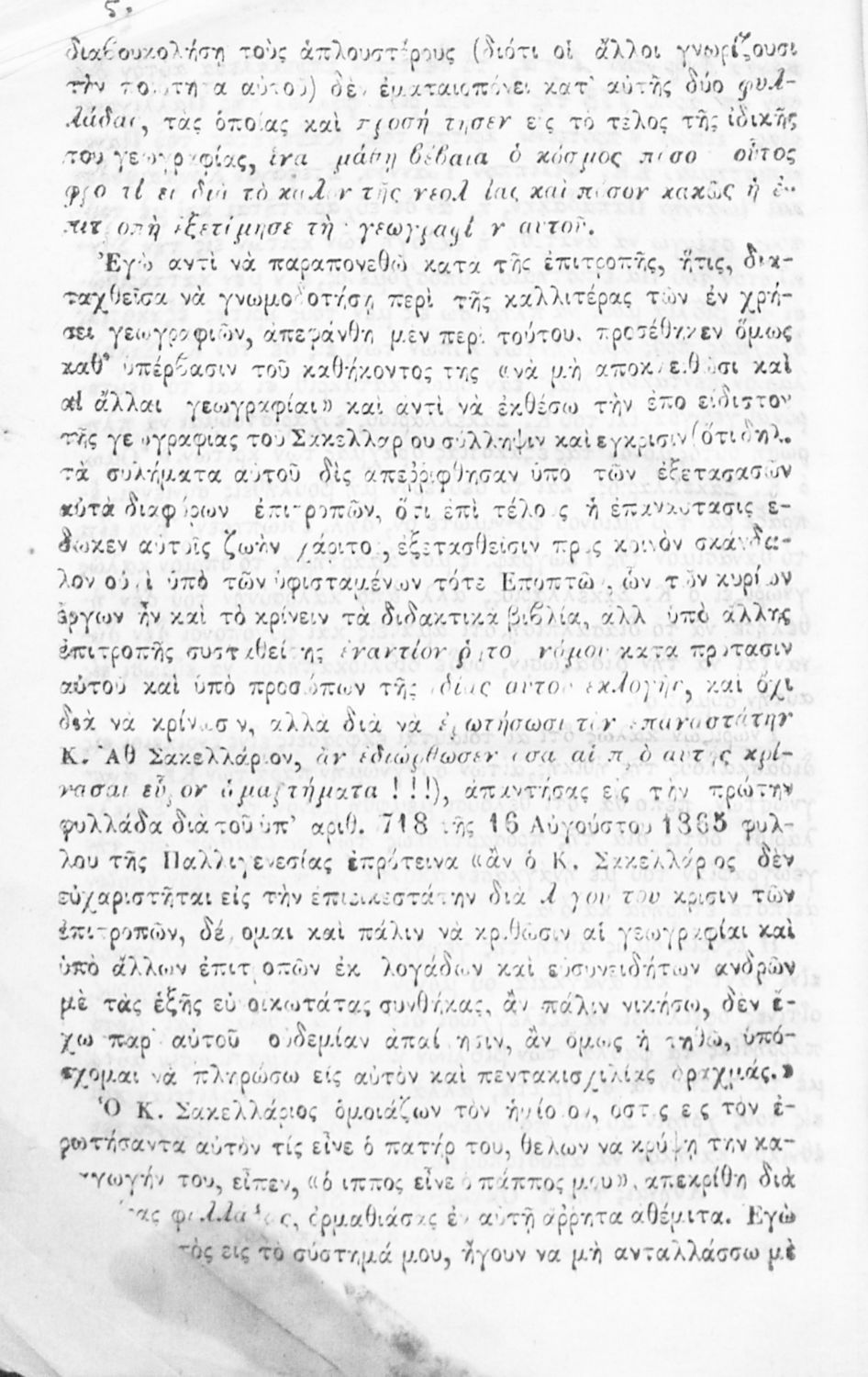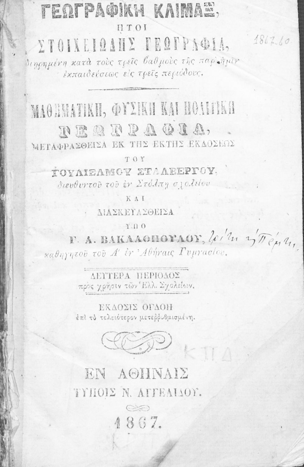 Σχολικό εγχειρίδιο Γεωγραφίας για τα Ελληνικά Σχολεία και τα Παρθεναγωγεία που περιλαμβάνει εισαγωγή στη φυσική, πολιτική και οικονομική γεωγραφία, και παρουσιάζει την Ελλάδα και ενδεικτικές χώρες και περιοχές