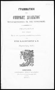 Κωδικός αναγνώρισης: 02-02957 Τίτλος: Γραμματική της ομηρικής διαλέκτου μετταγλωττισθείσα εκ της γερμανικής, εκδίδεται προς χρήσιν της εν τοις Γυμνασίοις σπουδαζούσης νεολαίας Συγγραφέας: Ευάγγελος Κ. Κοφινιώτης Μέγεθος και υπόστρωμα: Σχολικό εγχειρίδιο, μαλακό εξώφυλλο, 56 σελίδες. Διακοσμητικά στοιχεία (ασπρόμαυρα). |