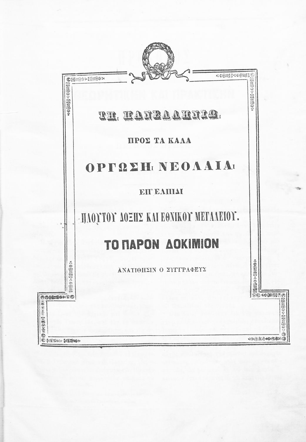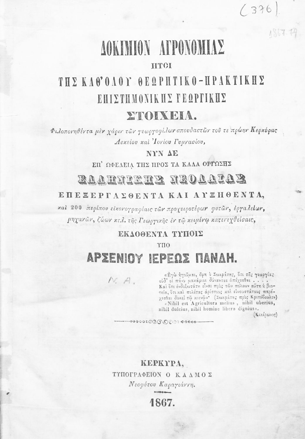 Τίτλος: Δοκίμιον αγρονομίας : ήτοι της καθ΄ όλου θεωρητικο-πρακτικής επιστημονικής γεωργικής στοιχεία : φιλοπονηθέντα μεν χάριν των γεωργοφίλων σπουδαστών του τε πρώην Κερκύρας Λυκείου και Ιονίου Γυμνασίου : νυν δε επ΄ ωφελεία της προς τα καλά όργωσης ελληνικής νεολαίας