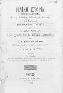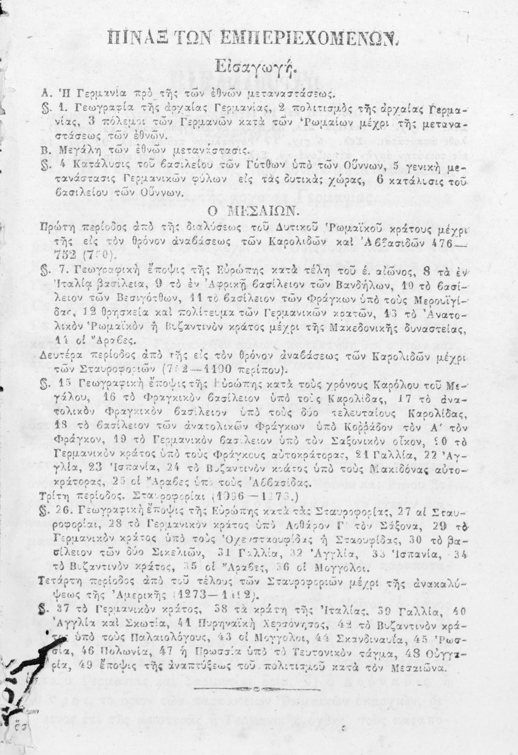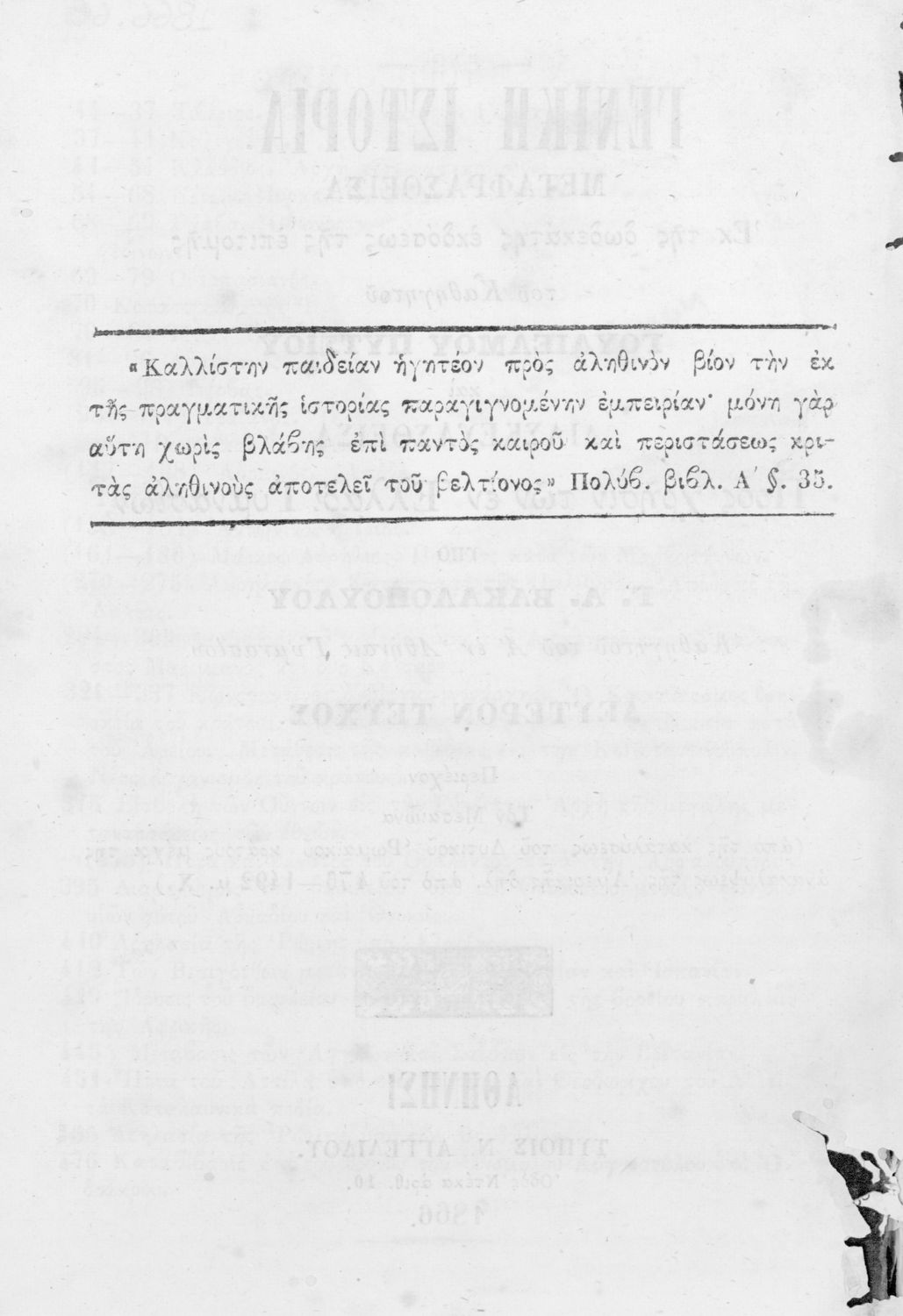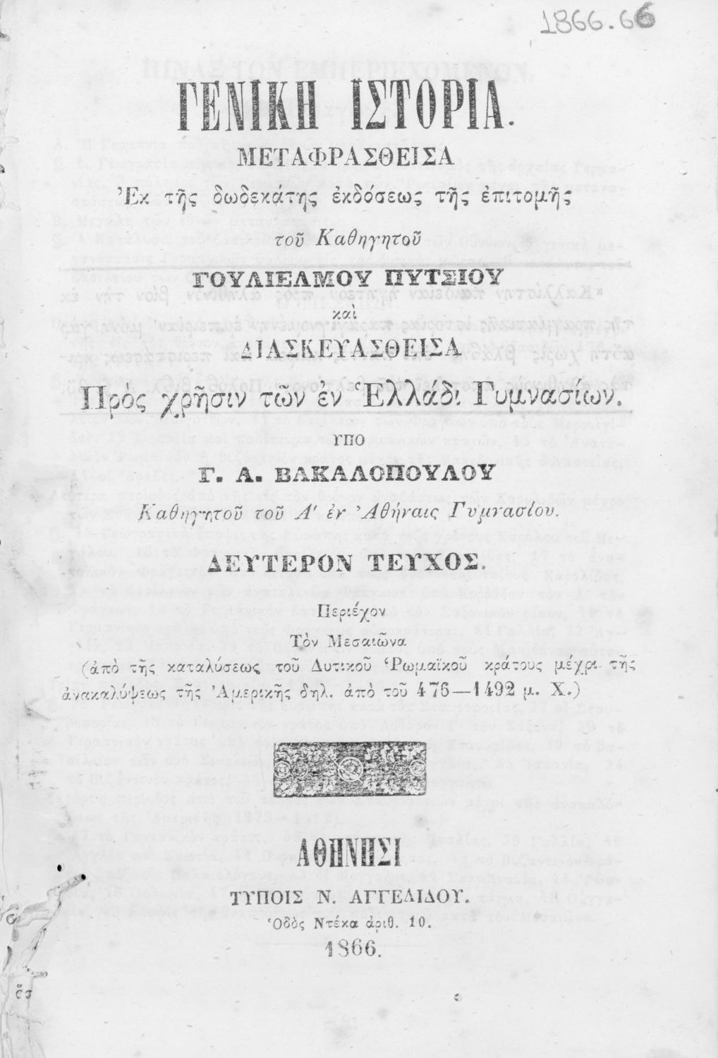 Τίτλος: Γενική Ιστορία μεταφρασθείσα εκ της δωδεκάτης εκδόσεως της επιτομής Γουλιέλμου Πυτσίου. Προς χρήσιν των εν Ελλάδι Γυμνασίων. Από της καταλύσεως του Δυτικού Ρωμαϊκού Κράτους μέχρι της ανακαλύψεως της Αμερικής 476 -1492 μ. Χ.