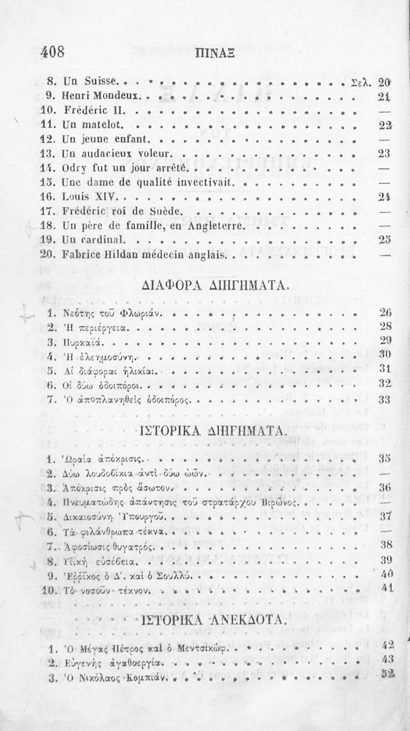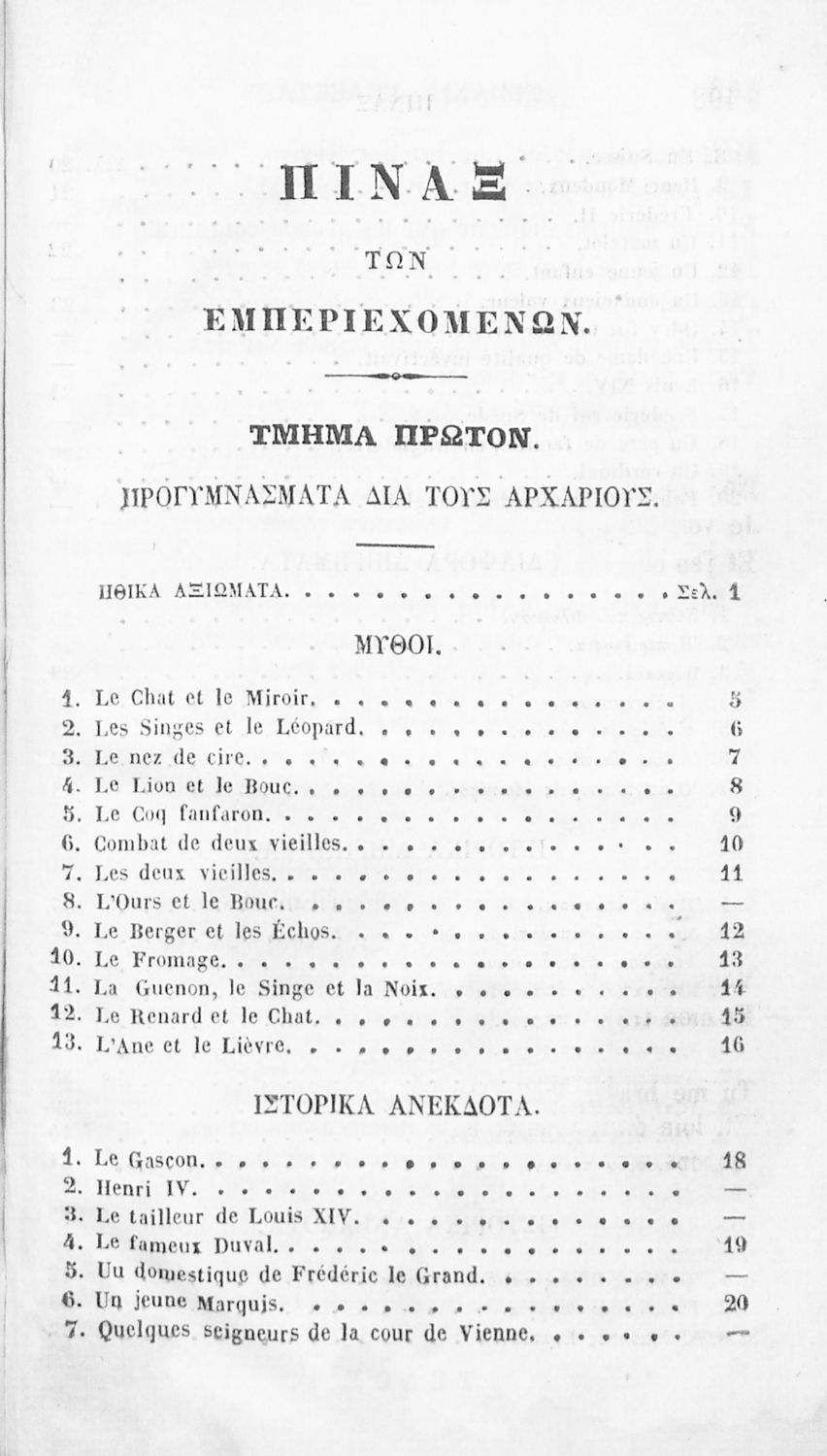 Μαθητικό βοήθημα Γαλλικών που περιλαμβάνει μύθους, ηθικά και ιστορικά διηγήματα και αποσπάσματα έργων Γάλλων συγγραφέων, ερμηνευτικές και γλωσσικές σημειώσεις καθώς και λεξιλογικό κατάλογο.