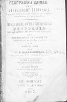 Σχολικό εγχειρίδιο Γεωγραφίας για τα Ελληνικά Σχολεία και τα Παρθεναγωγεία που περιλαμβάνει εισαγωγή στη φυσική, πολιτική και οικονομική γεωγραφία, και παρουσιάζει την Ελλάδα και ενδεικτικές χώρες και περιοχές