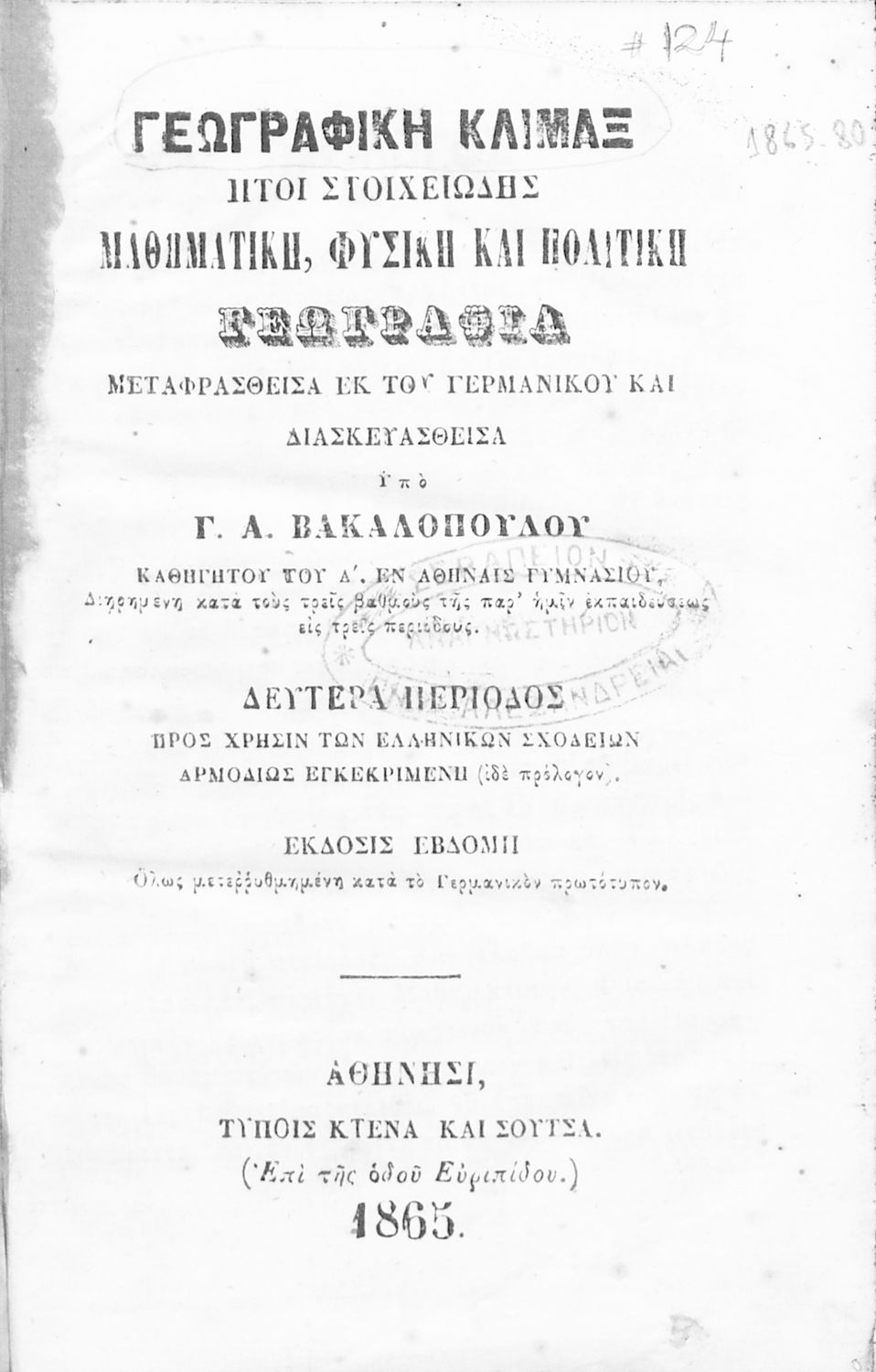 Τίτλος: Γεωγραφική κλίμαξ ήτοι στοιχειώδης γεωγραφία μαθηματική, φυσική, πολιτική γεωγραφία, Δευτέρα περίοδος προς χρήσιν των Ελληνικών Σχολείων