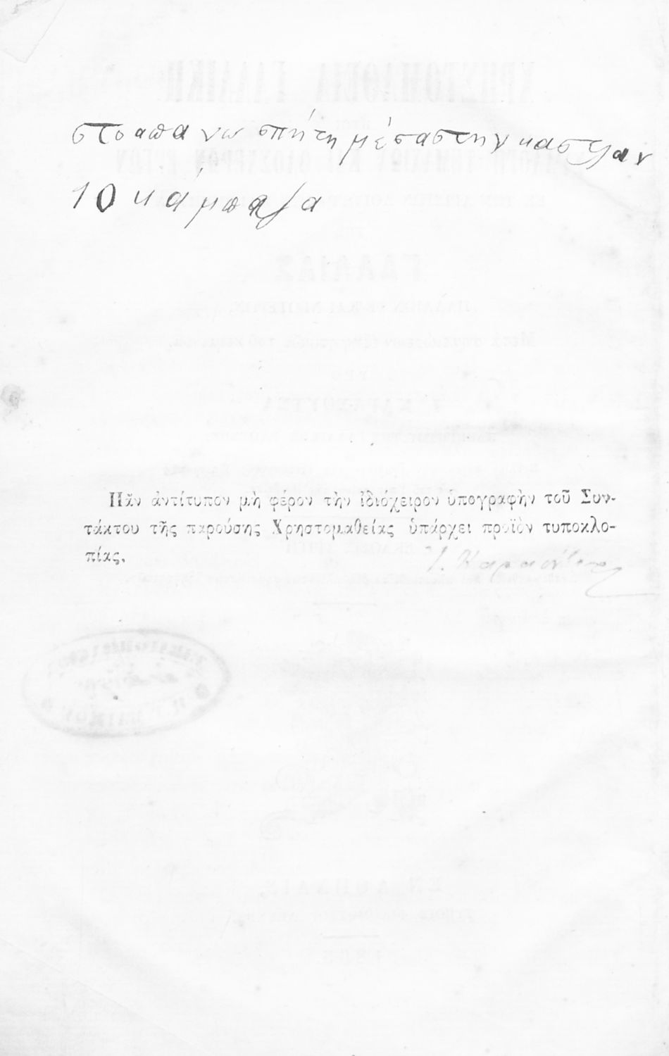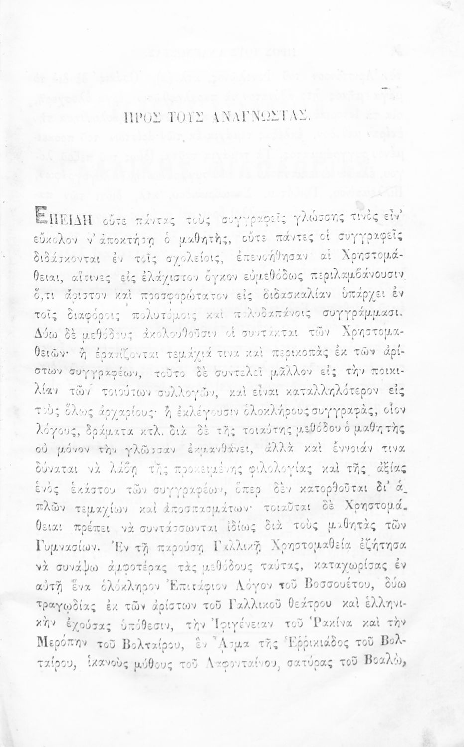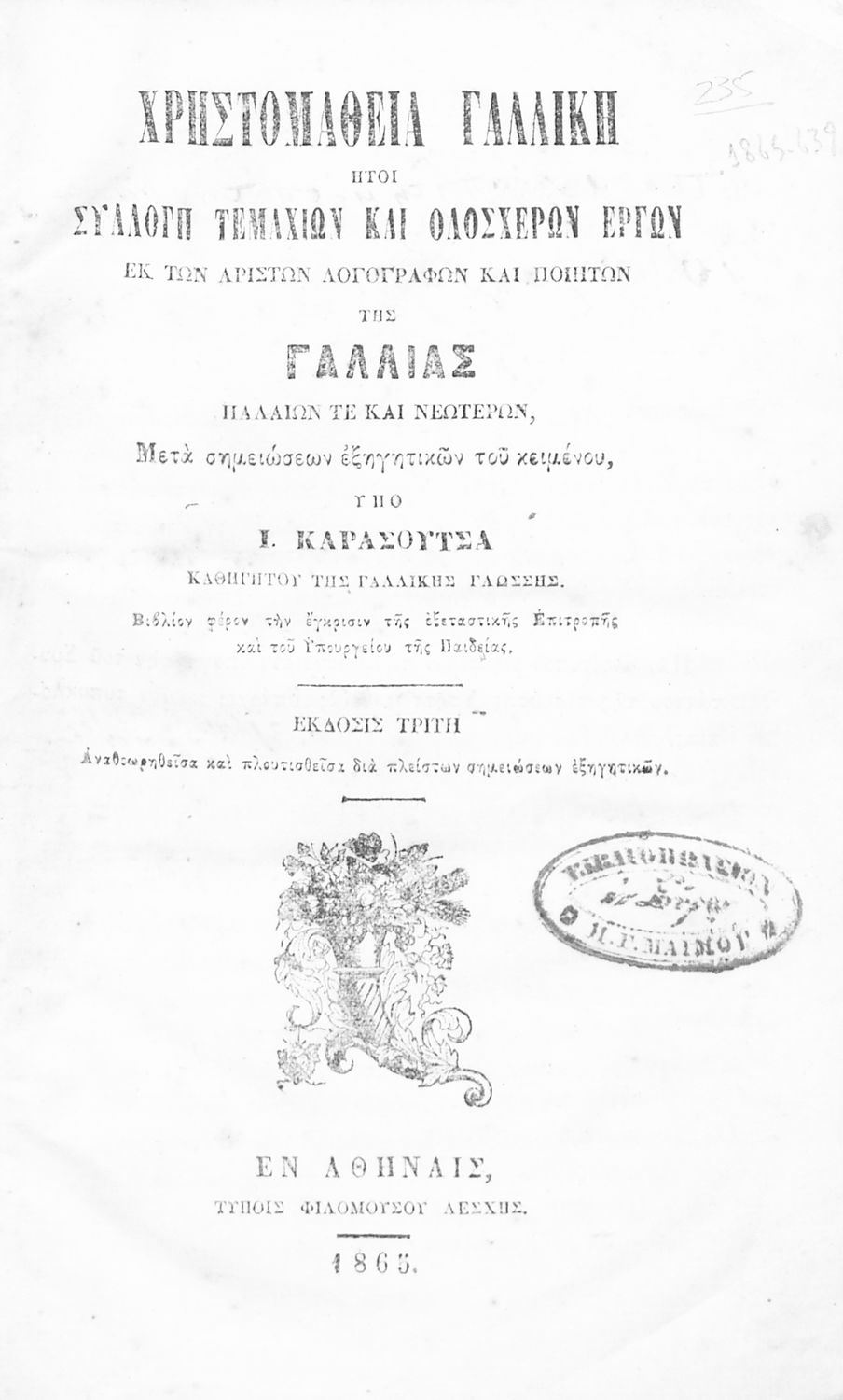 Τίτλος: Χρηστομάθεια γαλλική, ήτοι συλλογή τεμαχίων και ολοσχερών έργων εκ των αρίστων λογογράφων και ποιητών της Γαλλίας παλαιών τε και νεωτέρων, μετά σημειώσεων εξηγητικών του κειμένου