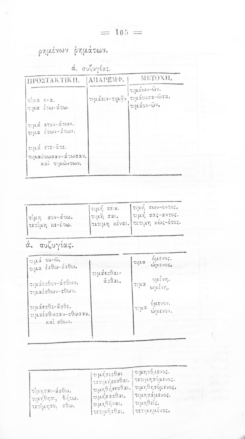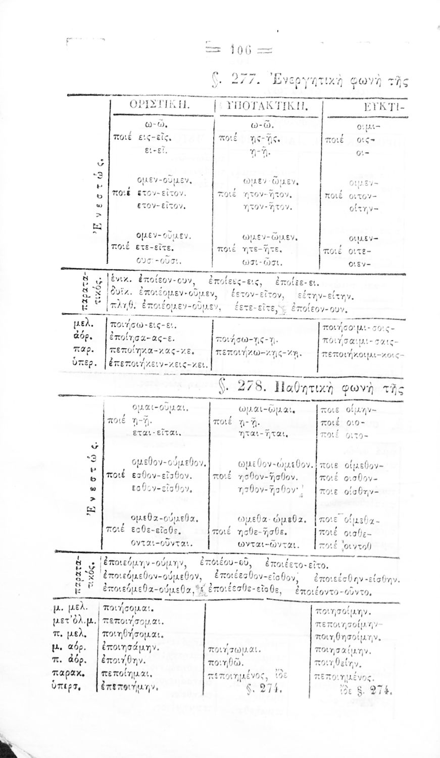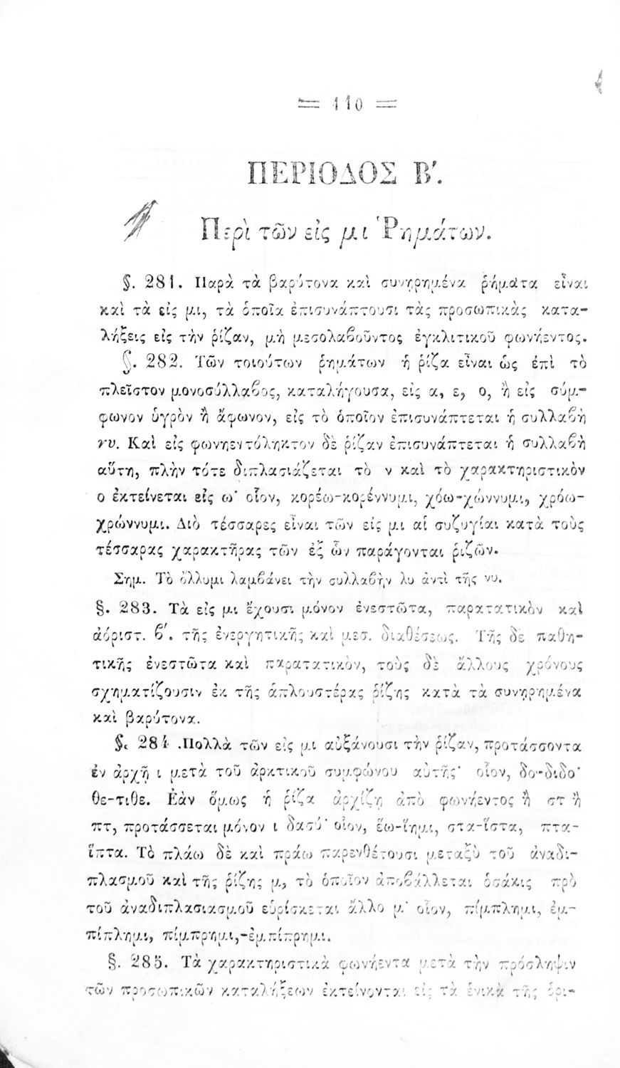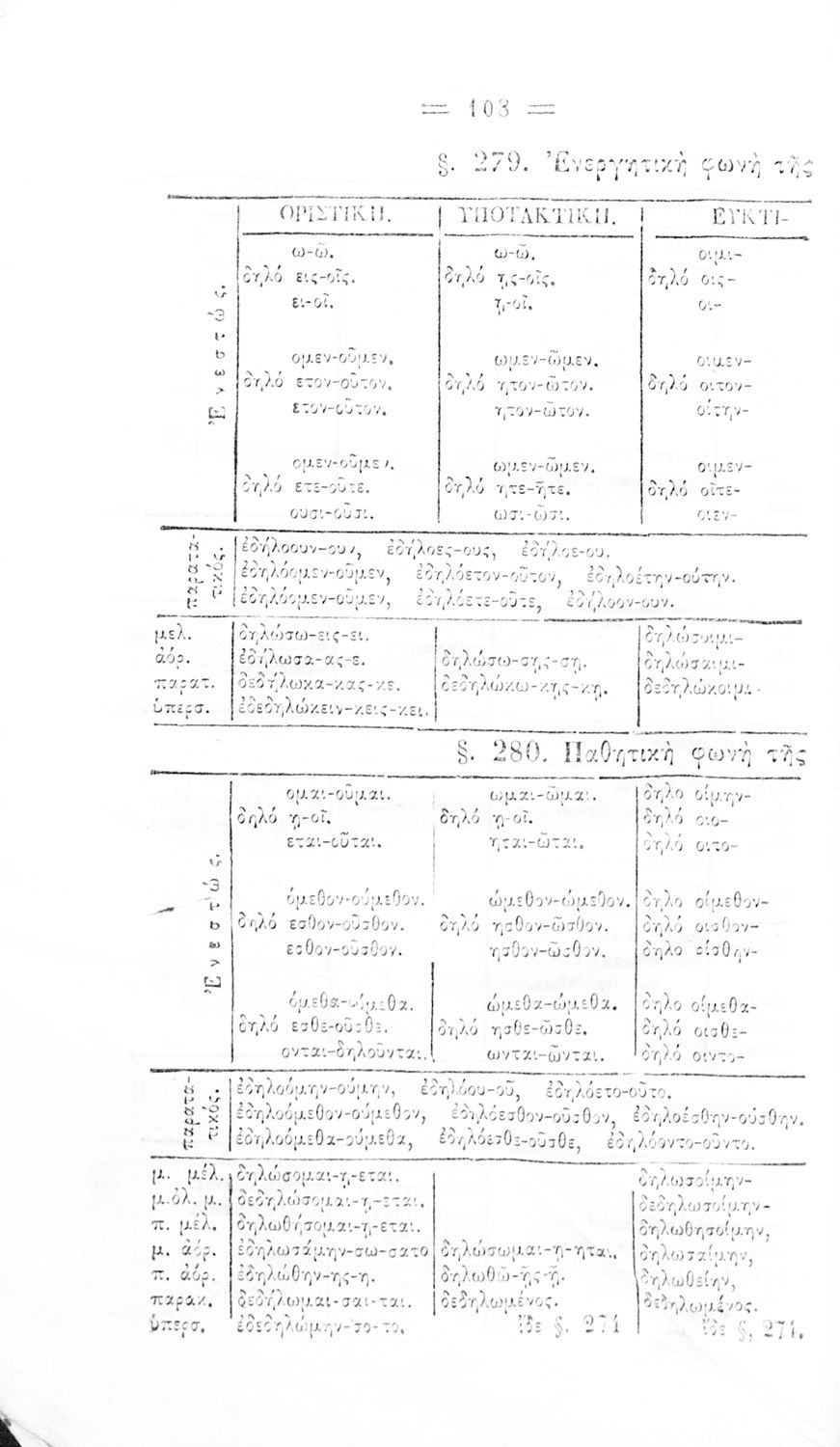 Σχολικό εγχειρίδιο Αρχαίων Ελληνικών για τα Ελληνικά Σχολεία και Παρθεναγωγεία που περιέχει τους κανόνες γραμματικής και είναι χωρισμένο σε φθογγολογικό, τυπολογικό και ετυμολογικό μέρος.