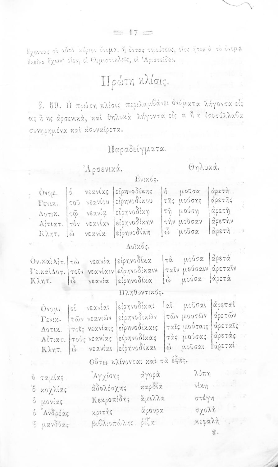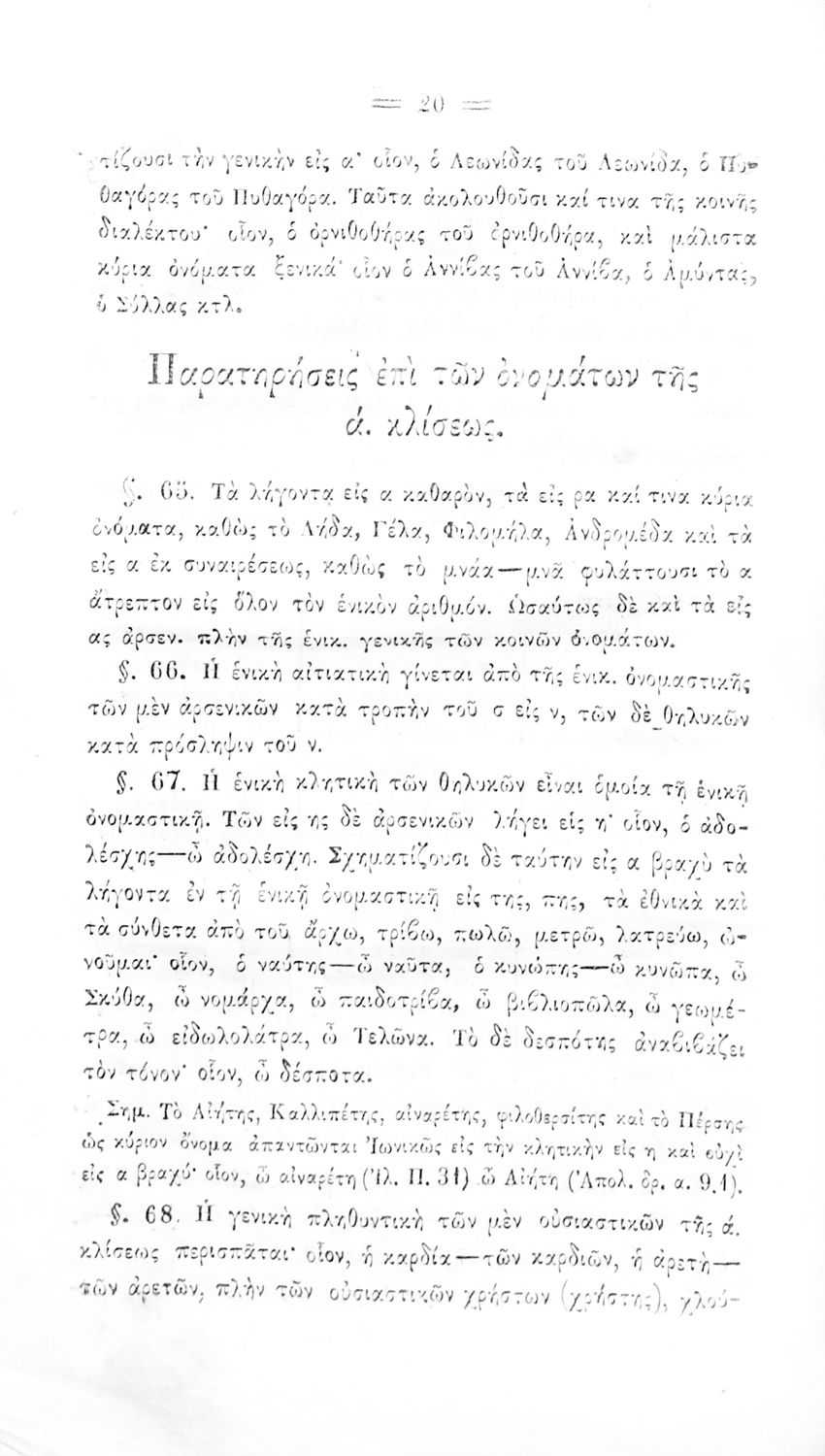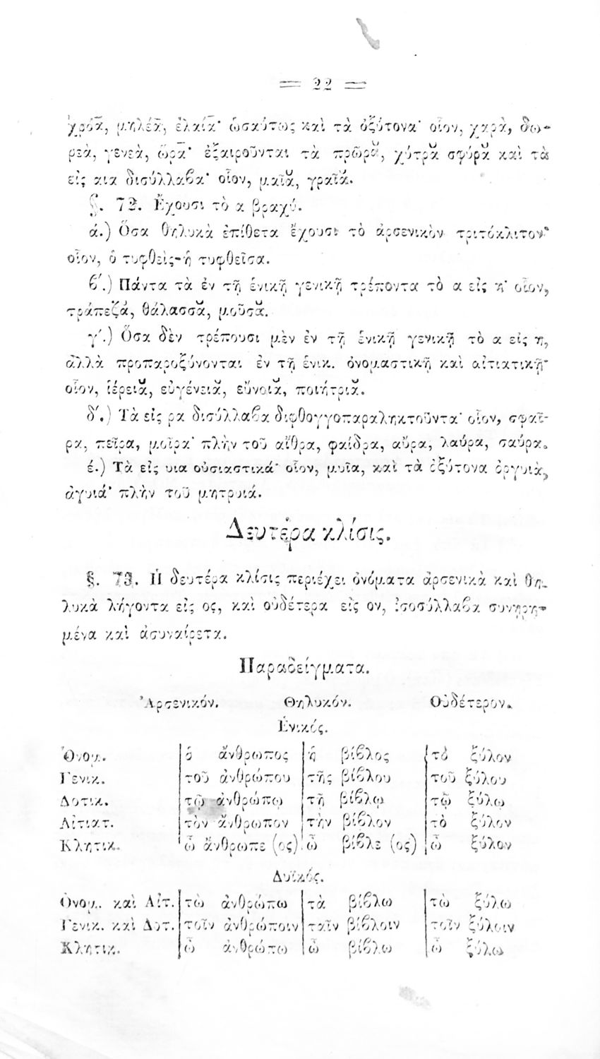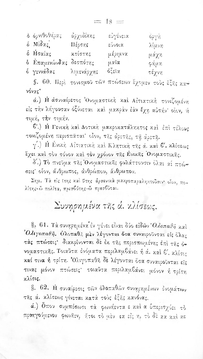Σχολικό εγχειρίδιο Αρχαίων Ελληνικών για τα Ελληνικά Σχολεία και Παρθεναγωγεία που περιλαμβάνει κανόνες της γραμματικής της αρχαίας ελληνικής και είναι χωρισμένη στο φθογγολογικό και στο τυπολογικό μέρος.