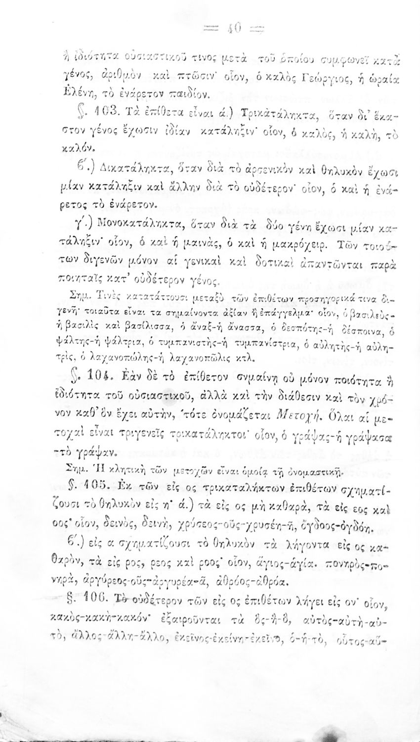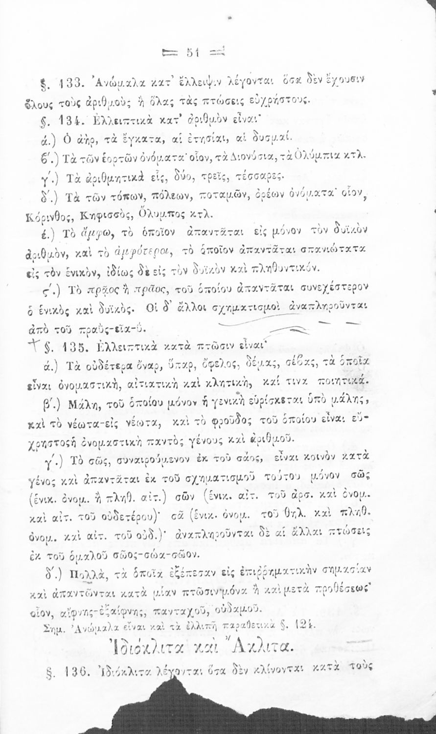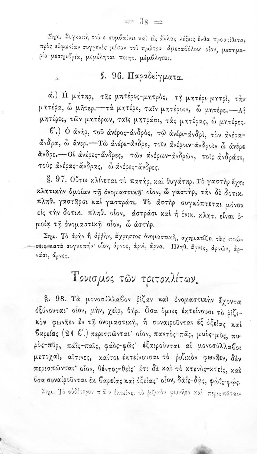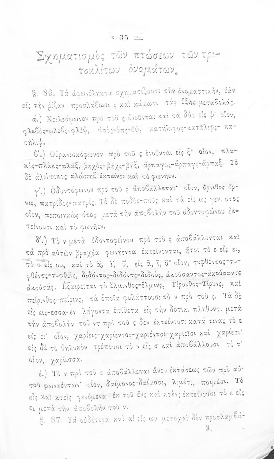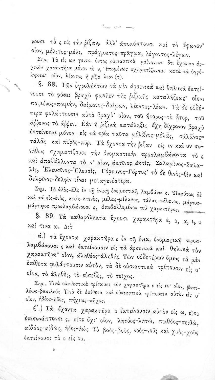 Σχολικό εγχειρίδιο Αρχαίων Ελληνικών για τα Ελληνικά Σχολεία και Παρθεναγωγεία που περιέχει τους κανόνες γραμματικής και είναι χωρισμένο σε φθογγολογικό, τυπολογικό και ετυμολογικό μέρος.