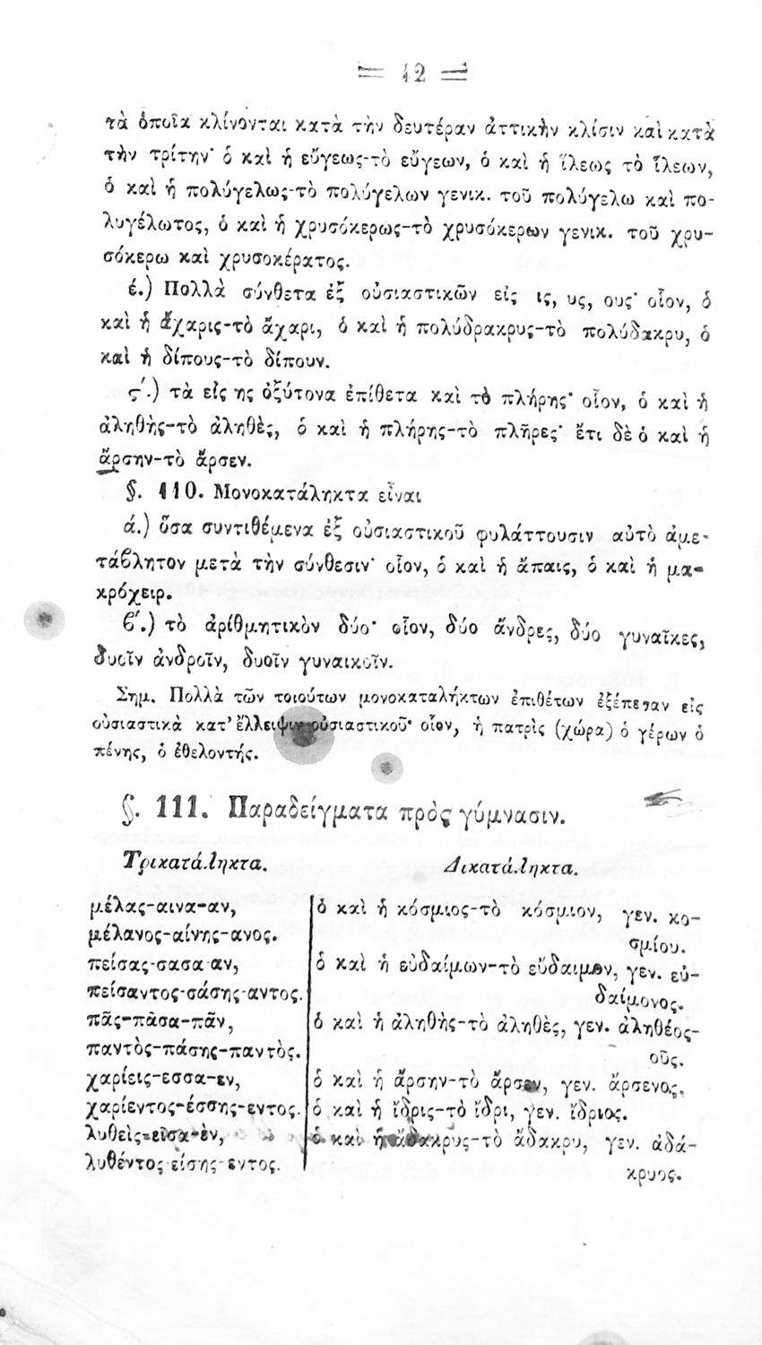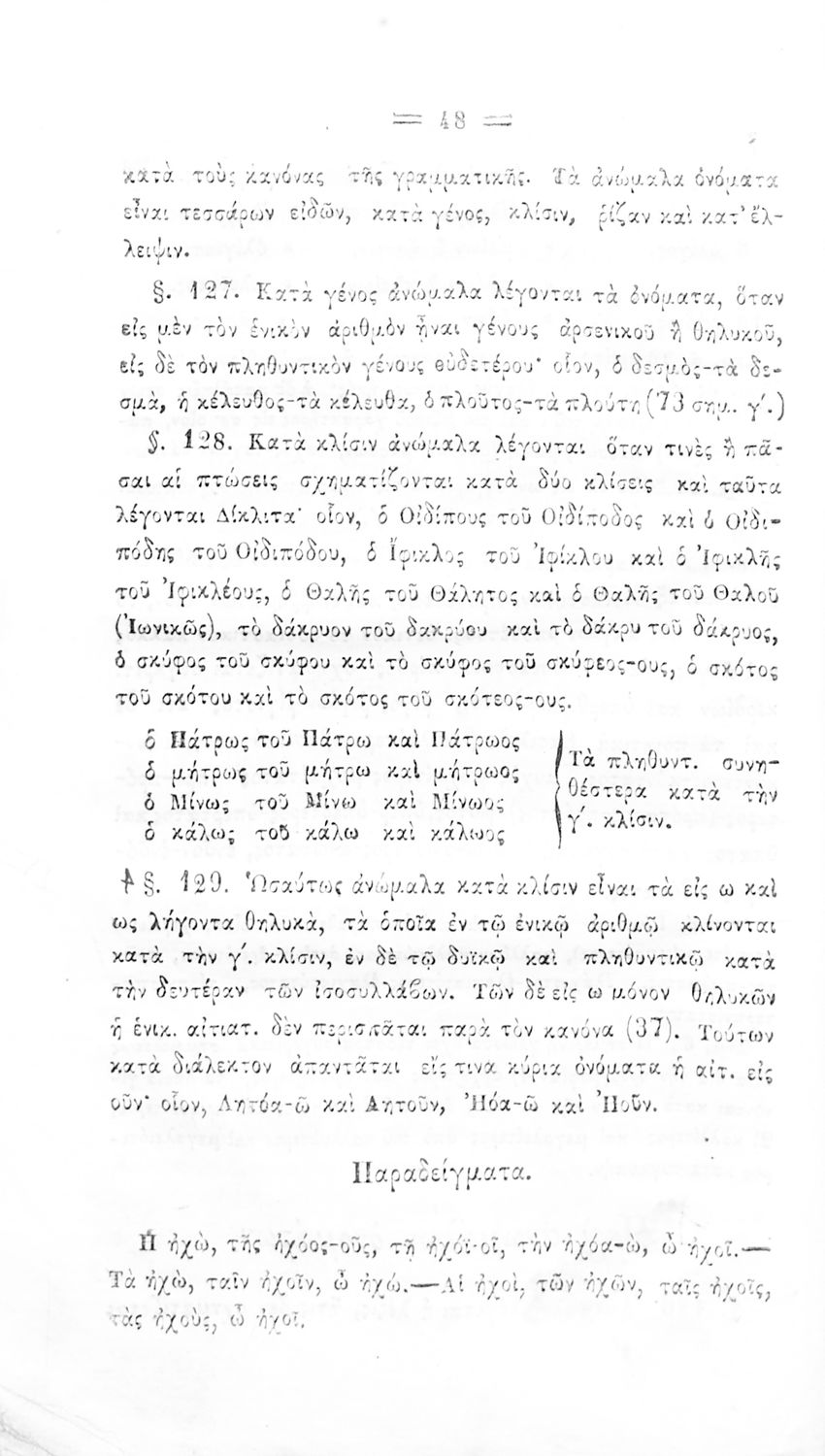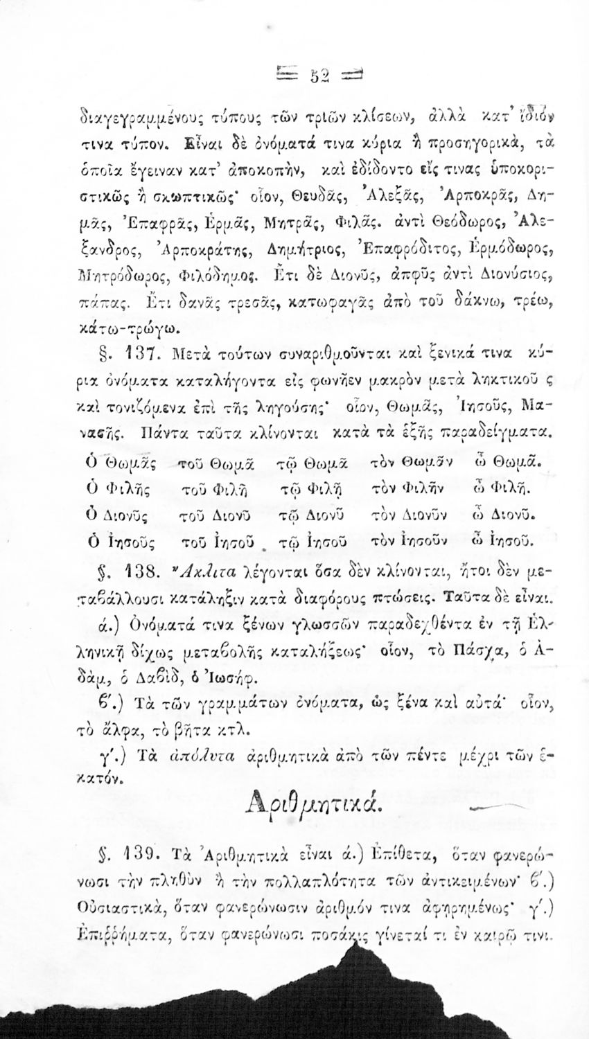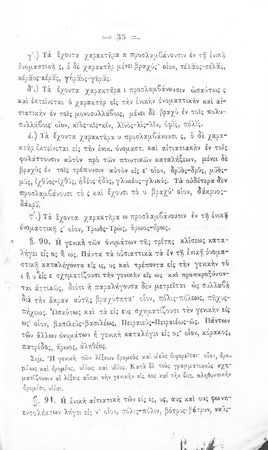 Σχολικό εγχειρίδιο Αρχαίων Ελληνικών για τα Ελληνικά Σχολεία και Παρθεναγωγεία που περιέχει τους κανόνες γραμματικής και είναι χωρισμένο σε φθογγολογικό, τυπολογικό και ετυμολογικό μέρος.