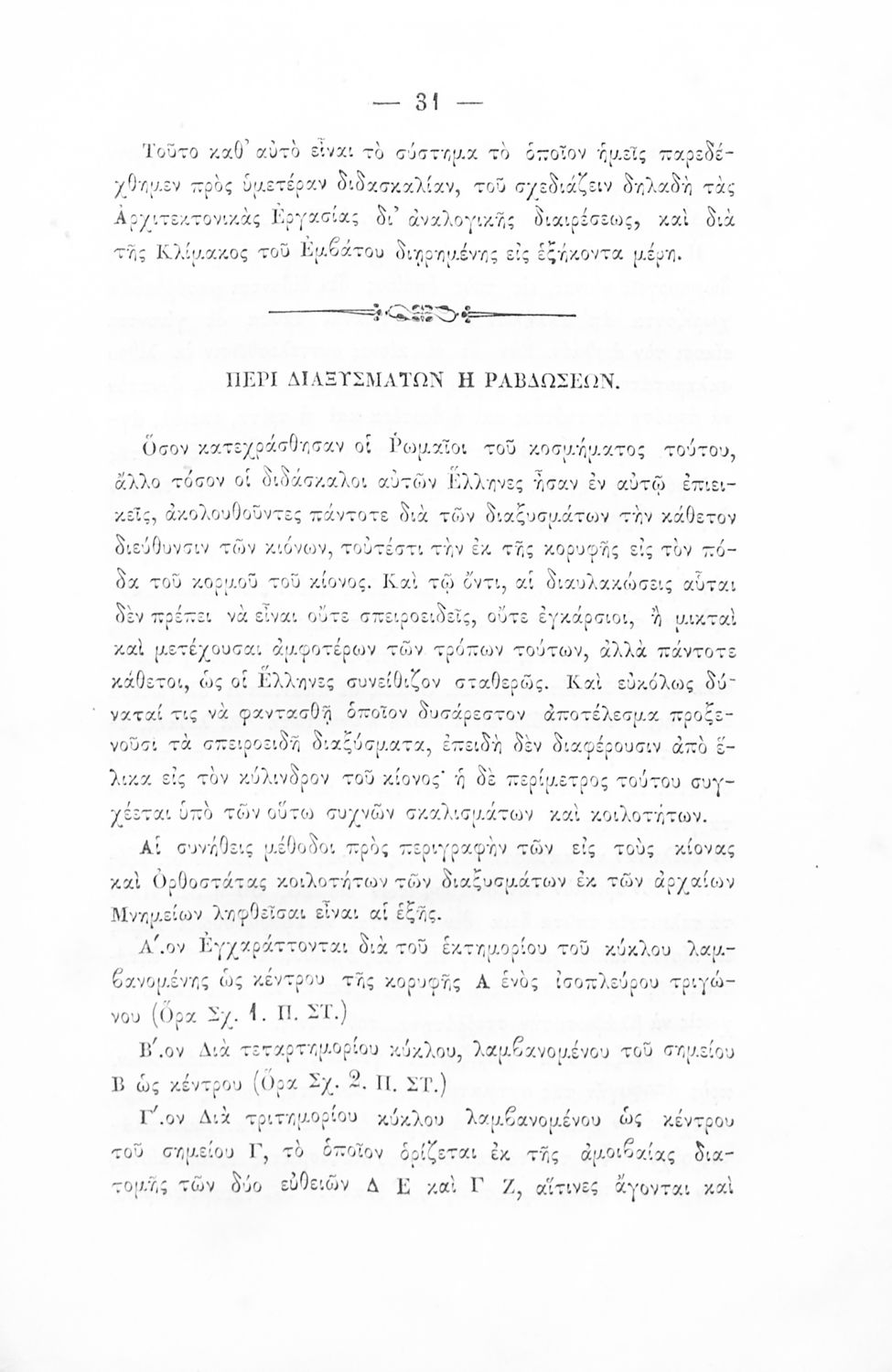 Βαθμίδα εκπαίδευσης: Δευτεροβάθμια Τάξη: Ιόνιο Γυμνάσιο / Λύκειο Γλώσσα: Καθαρεύουσα Παρουσίαση περιεχομένου: Σχολικό εγχειρίδιο το οποίο προοριζόταν για τη διδασκαλία στοιχείων αστικής αρχιτεκτονικής στους μαθητές του Ιονίου Γυμνασίου και Λυκείου. |