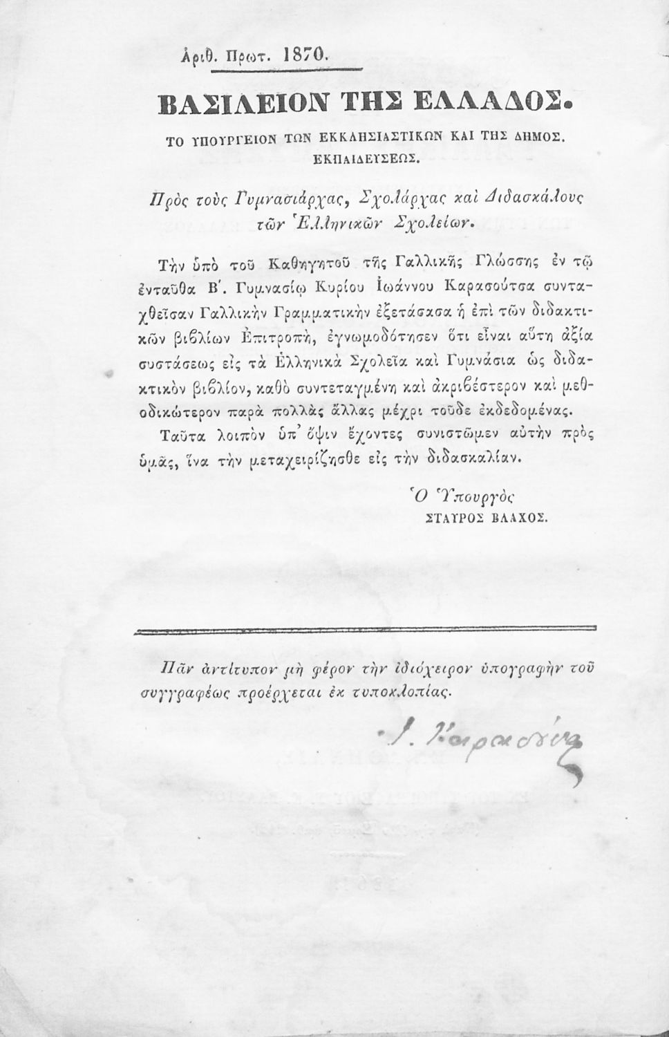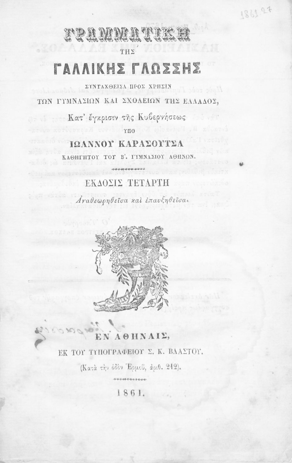 Τίτλος: Γραμματική της γαλλικής γλώσσης, συνταχθείσα προς χρήσιν των Γυμνασίων και σχολείων της Ελλάδος