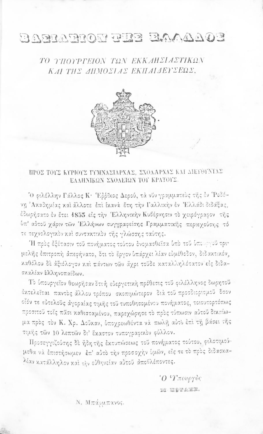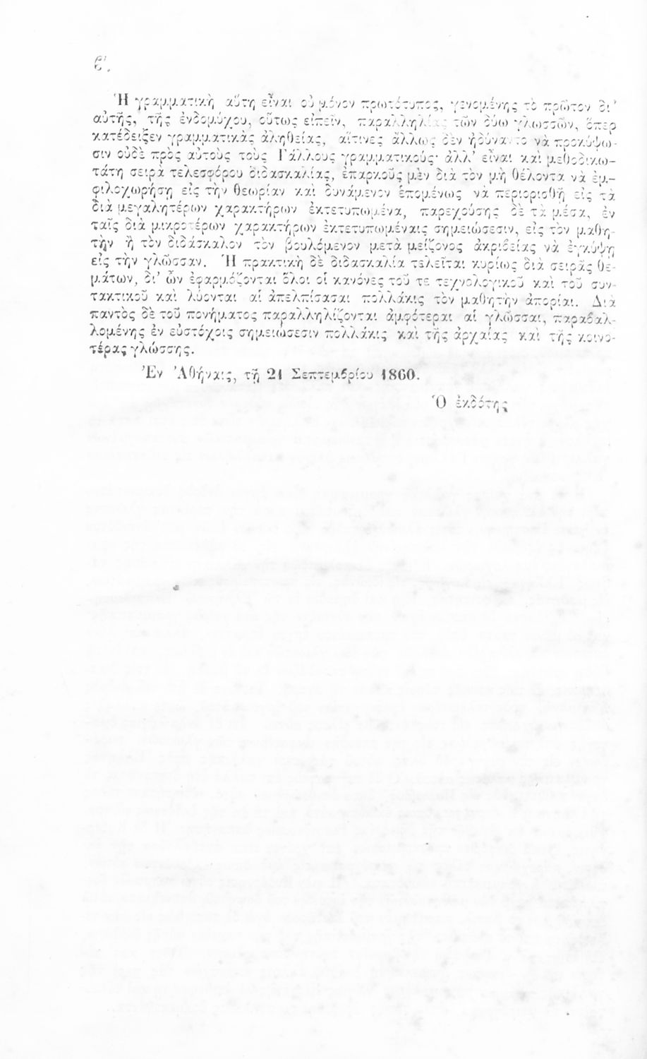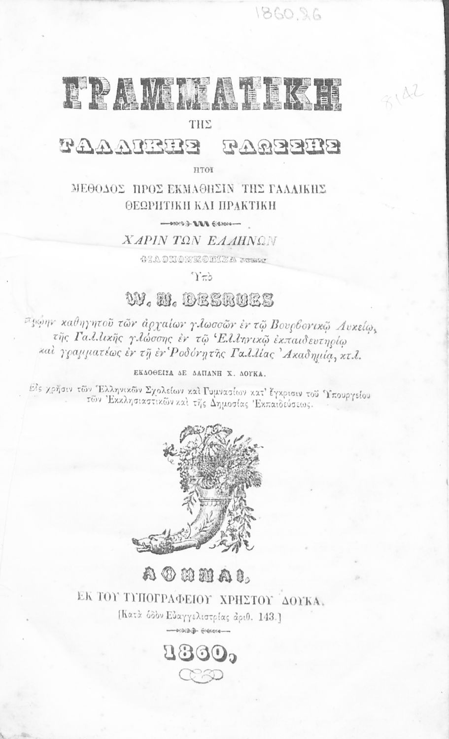 Τίτλος: Γραμματική της γαλλικής γλώσσης ήτοι μέθοδος προς εκμάθησιν της γαλλικής θεωρητική και πρακτική χάριν των Ελλήνων