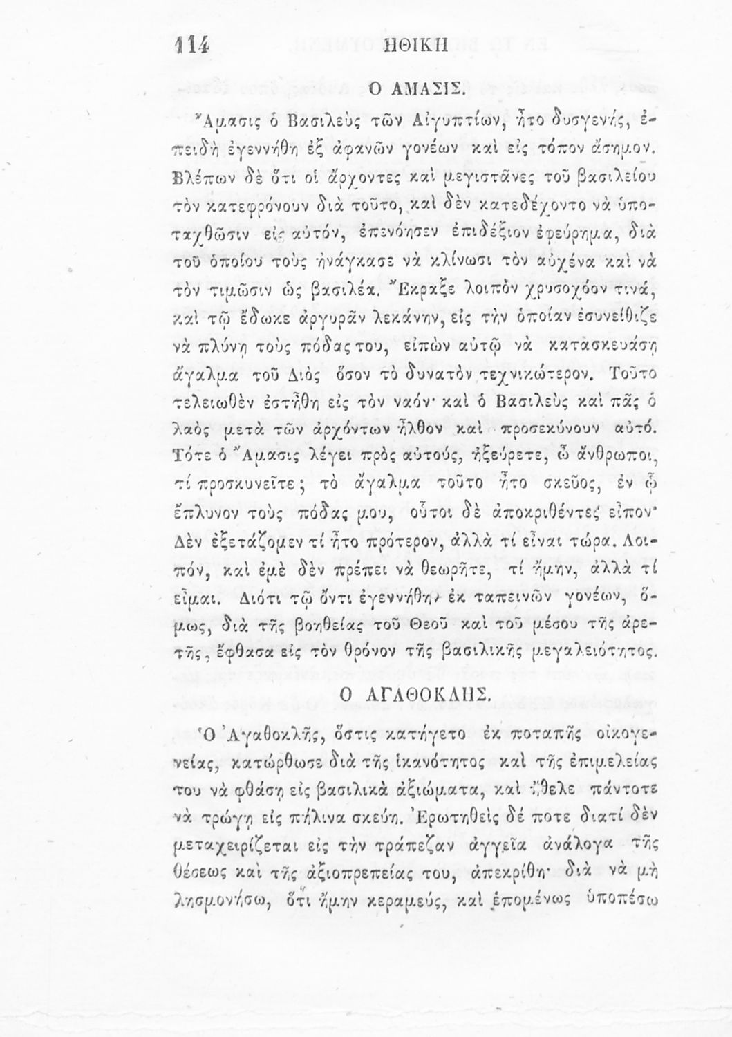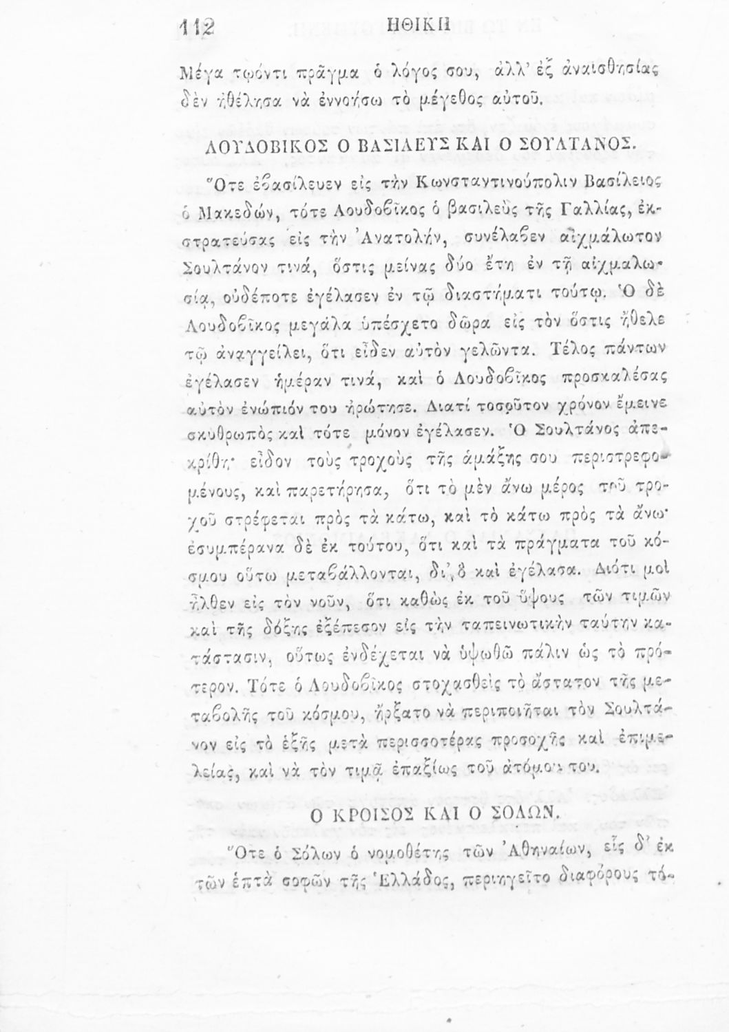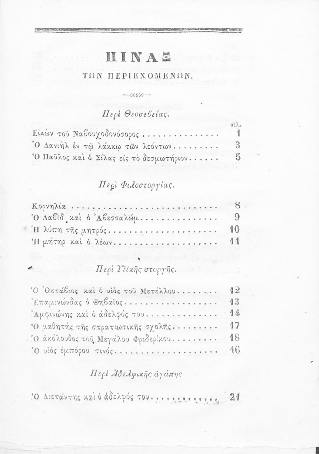 Τίτλος: Ηθική εν τω βίω ενεργουμένη ήτοι ηθικά τεμάχια διαφόρων συγγραφέων της τε παλαιάς και νεωτέρας ιστορίας, τα μεν μεταφρασθέντα τα δε ερανισθέντα, προς ηθικήν εφαρμογήν και χρήσιν των Δημοτικών Σχολείων