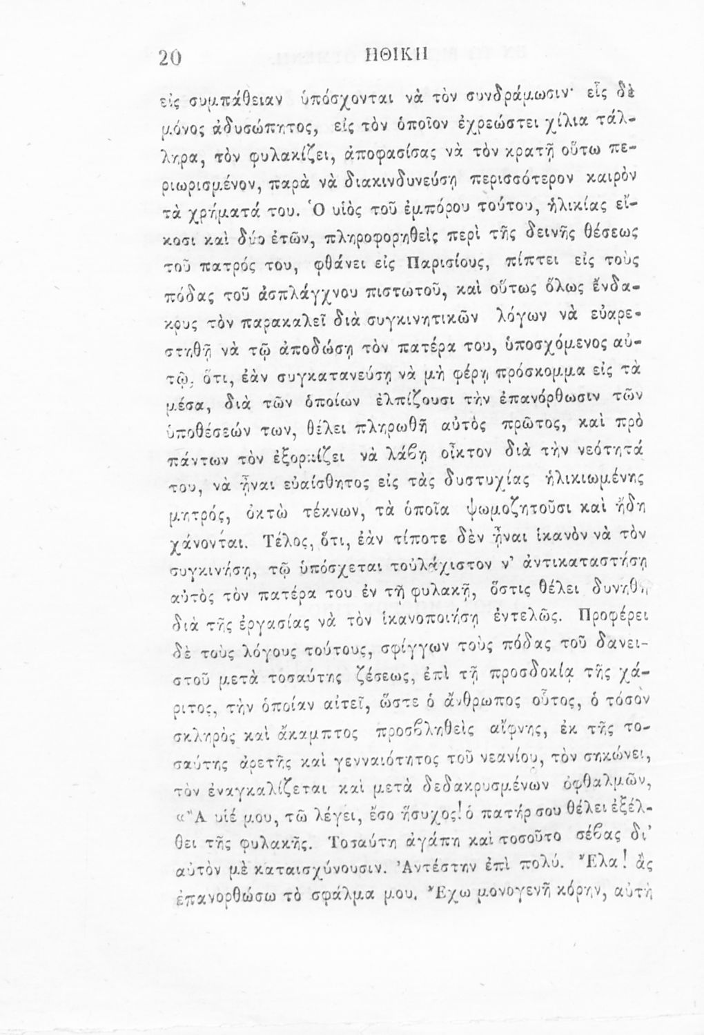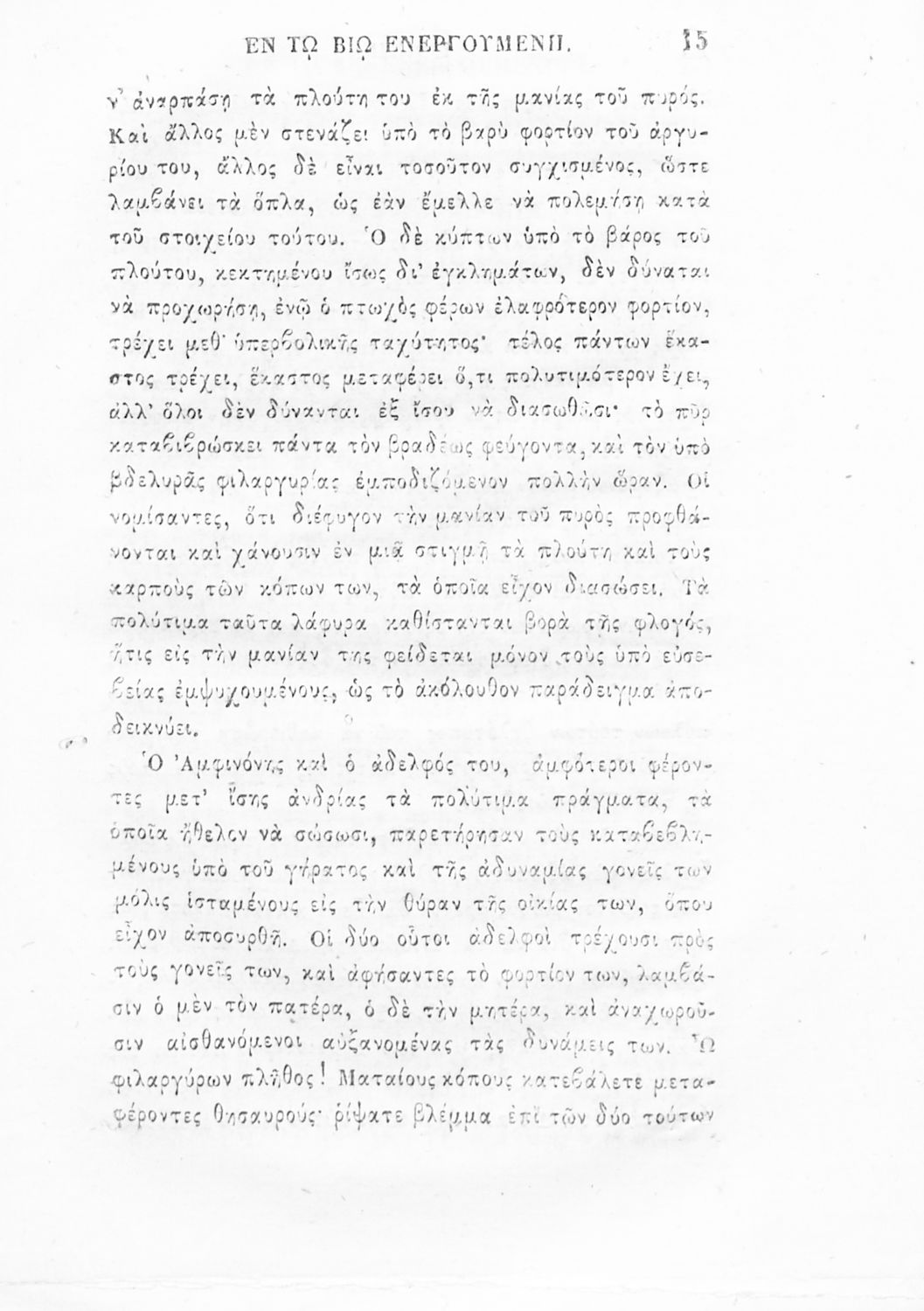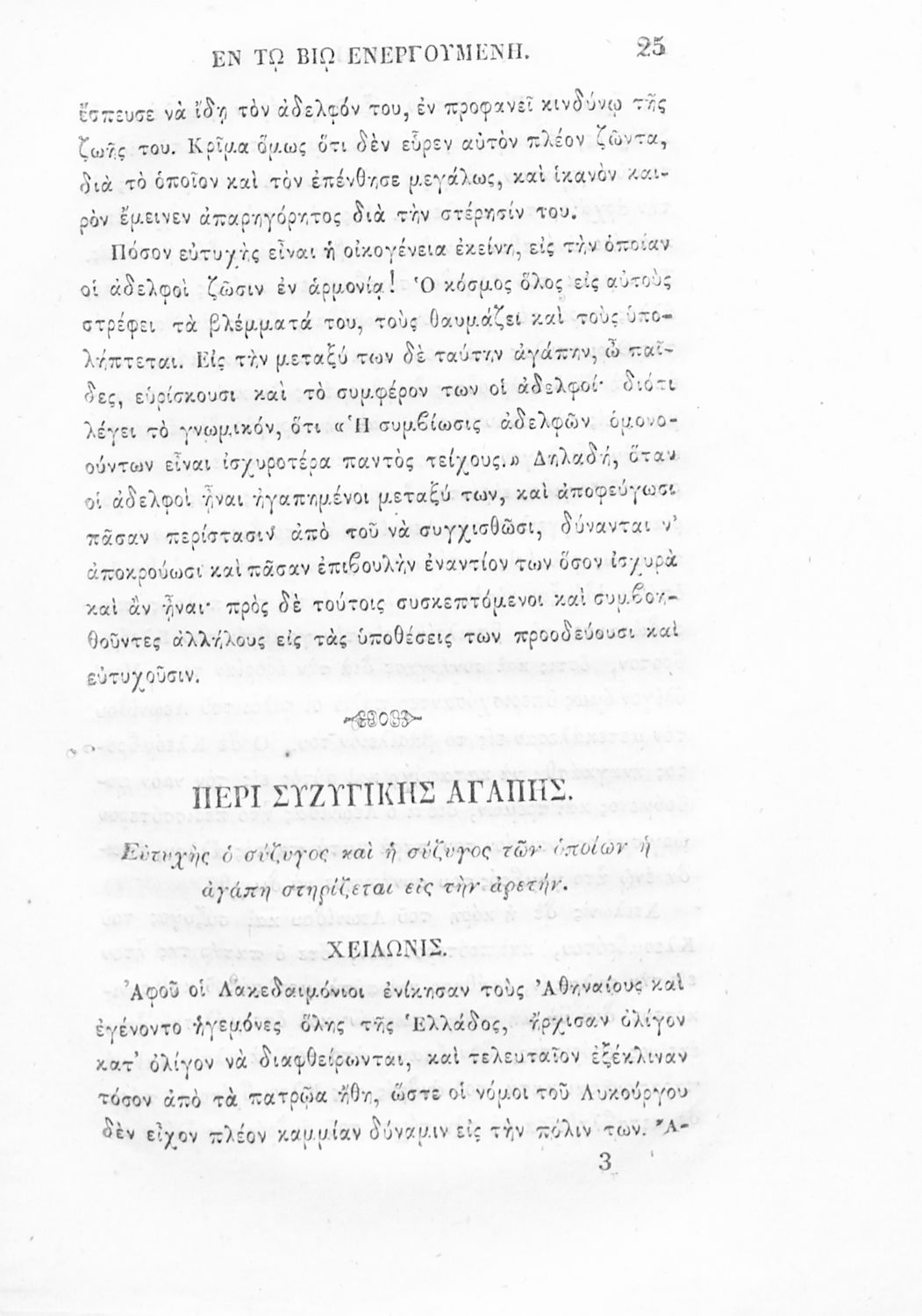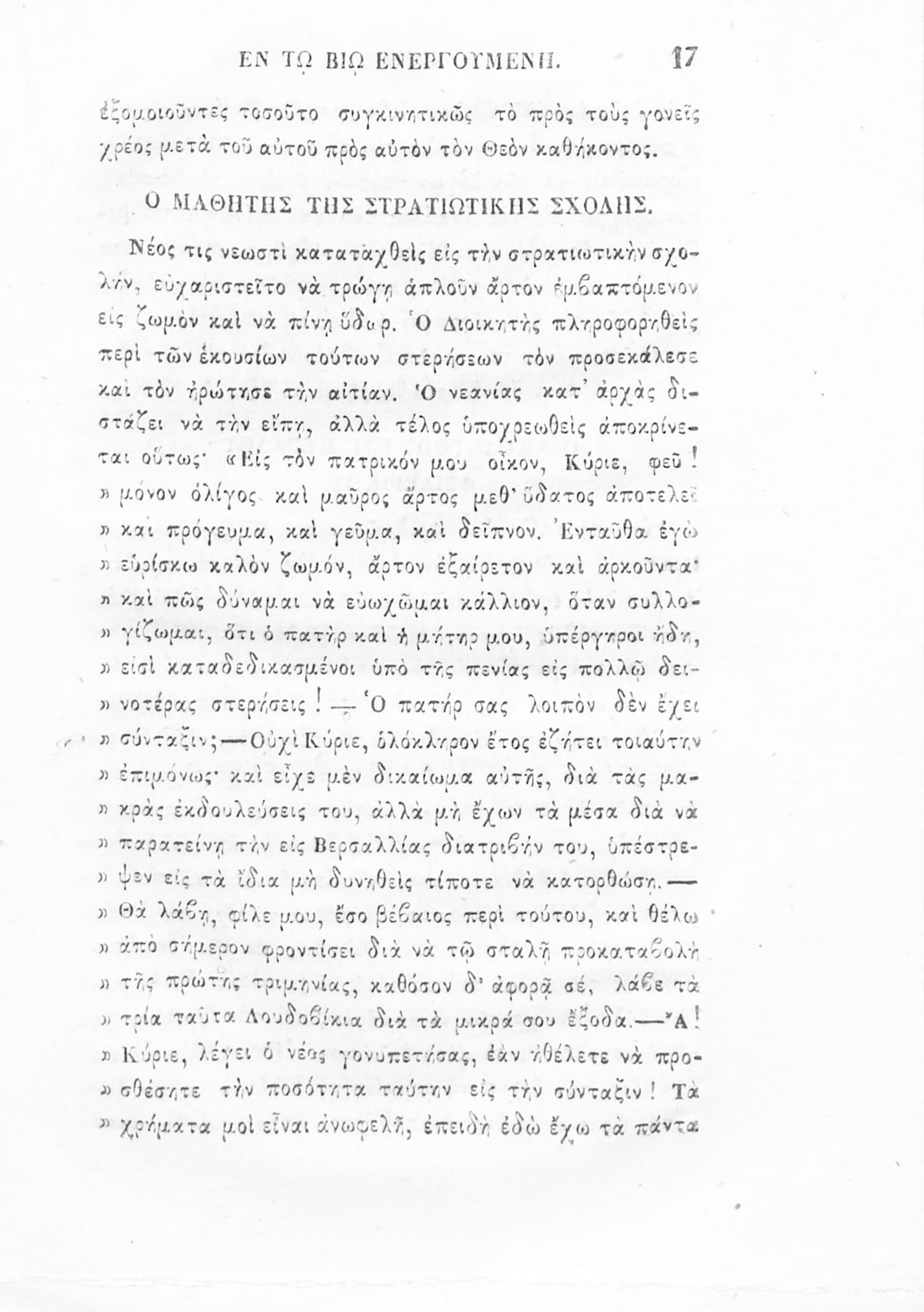 Τίτλος: Ηθική εν τω βίω ενεργουμένη ήτοι ηθικά τεμάχια διαφόρων συγγραφέων της τε παλαιάς και νεωτέρας ιστορίας, τα μεν μεταφρασθέντα τα δε ερανισθέντα, προς ηθικήν εφαρμογήν και χρήσιν των Δημοτικών Σχολείων