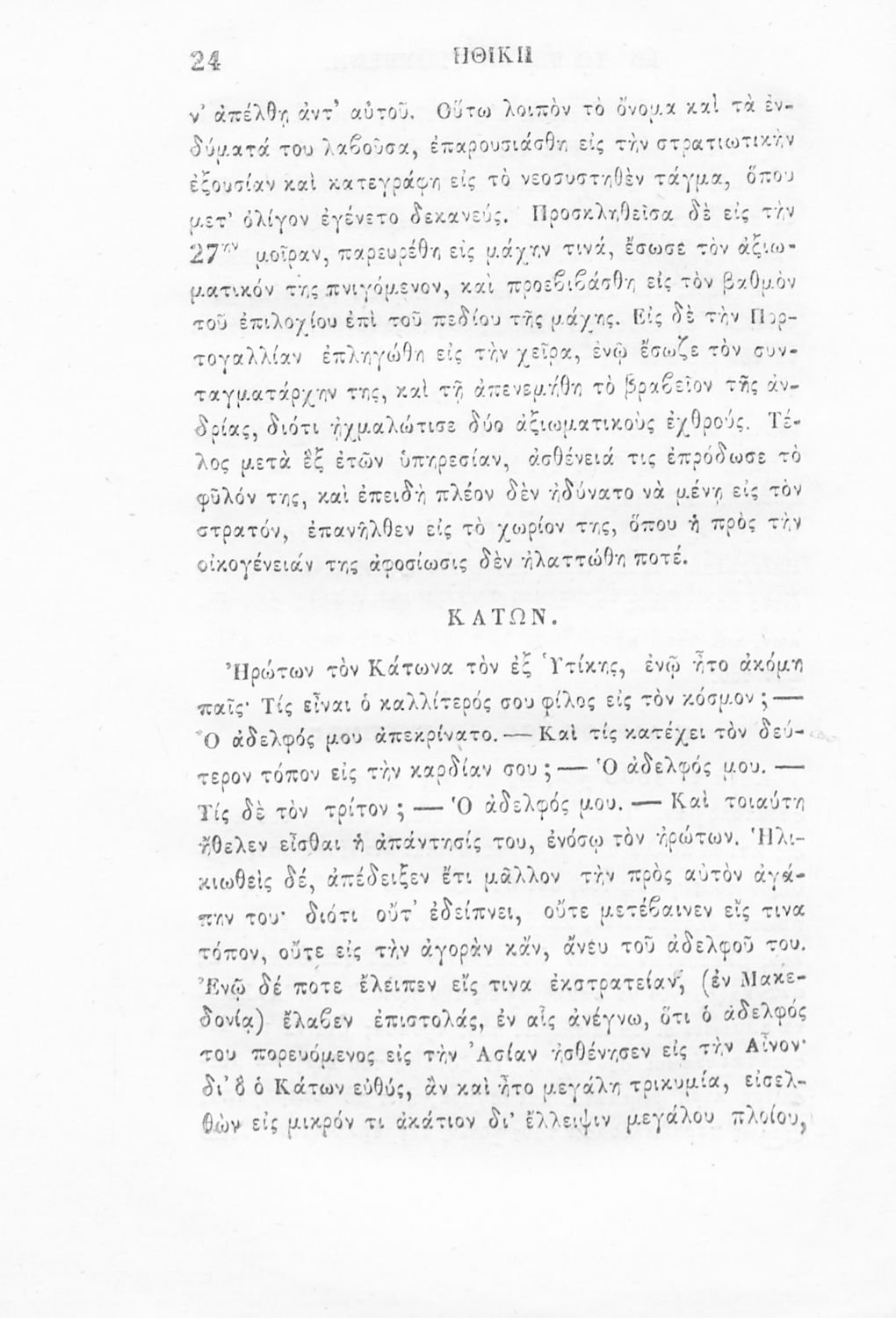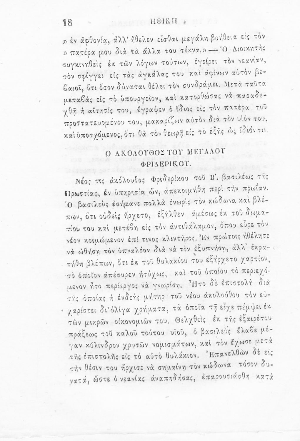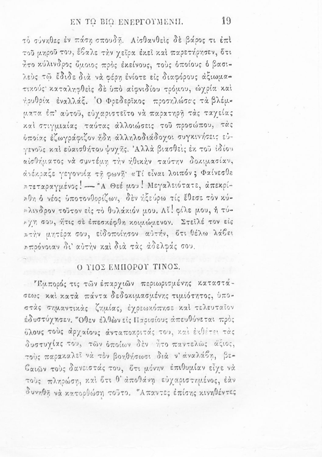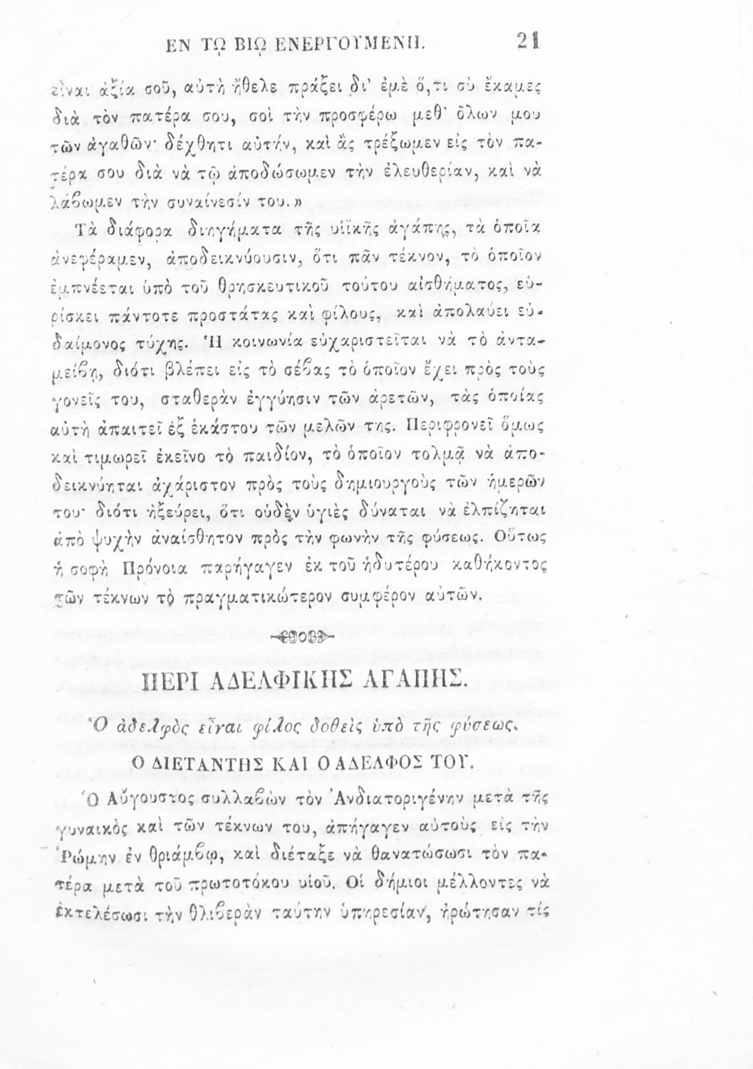 Τίτλος: Ηθική εν τω βίω ενεργουμένη ήτοι ηθικά τεμάχια διαφόρων συγγραφέων της τε παλαιάς και νεωτέρας ιστορίας, τα μεν μεταφρασθέντα τα δε ερανισθέντα, προς ηθικήν εφαρμογήν και χρήσιν των Δημοτικών Σχολείων