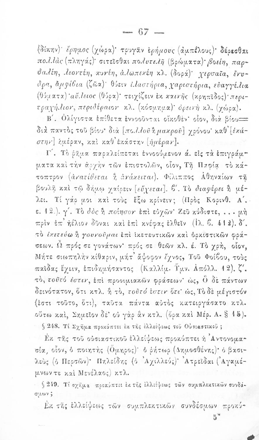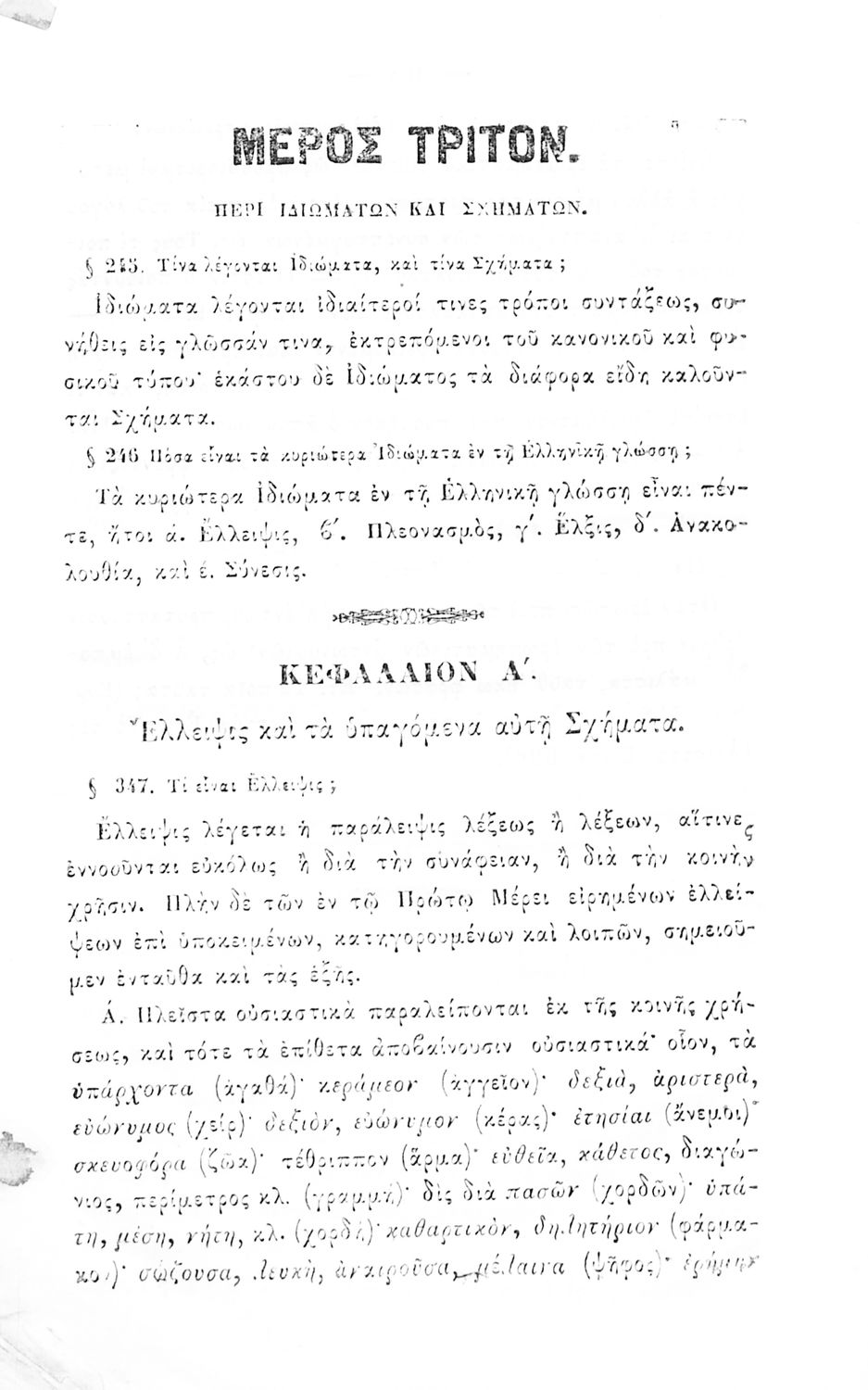 Σχολικό εγχειρίδιο Αρχαίων Ελληνικών για τα Ελληνικά Σχολεία, Παρθεναγωγεία και Γυμνάσια που περιέχει τους κανόνες γραμματικής και είναι χωρισμένο σε φθογγολογικό, τυπολογικό και ετυμολογικό μέρος.