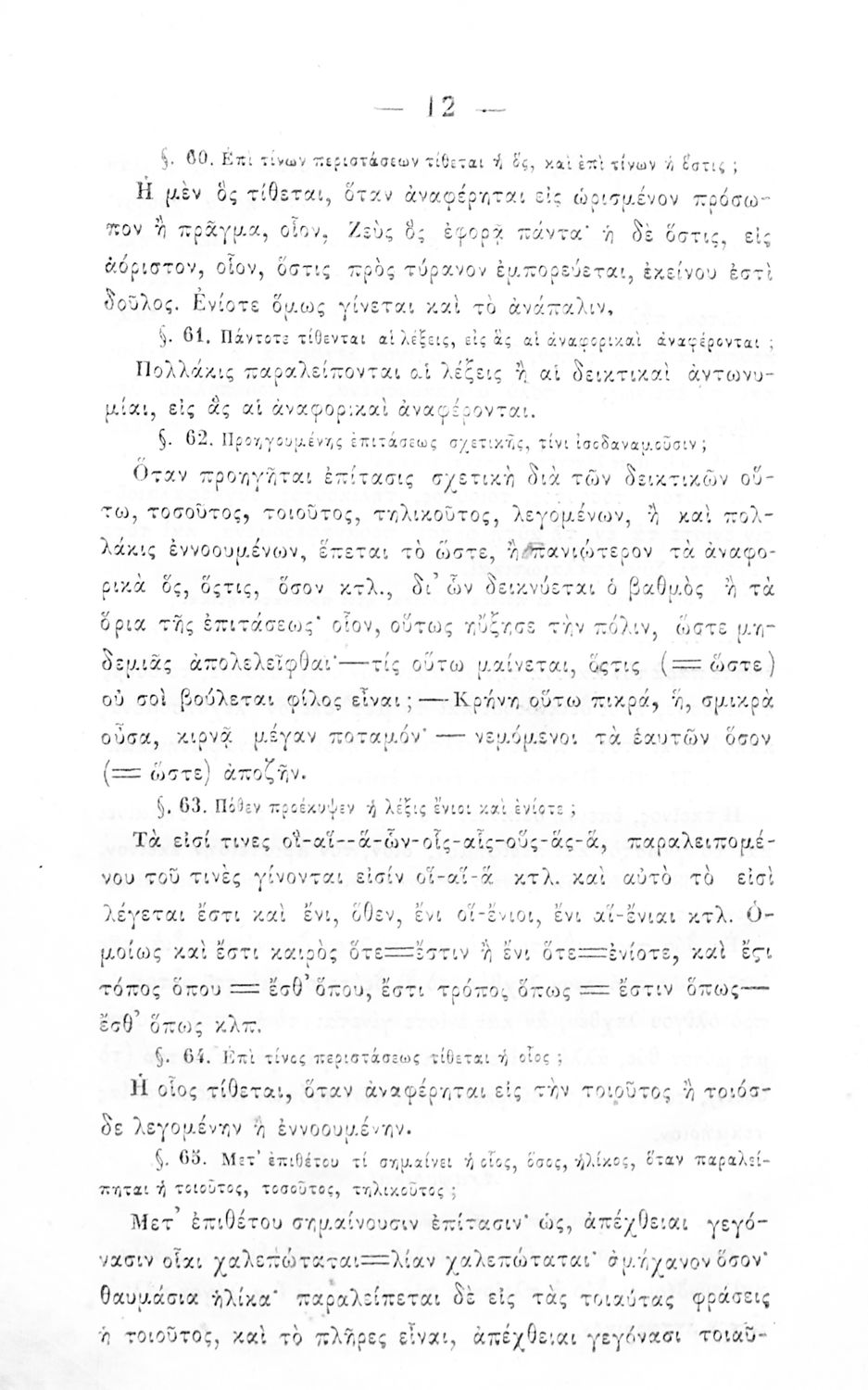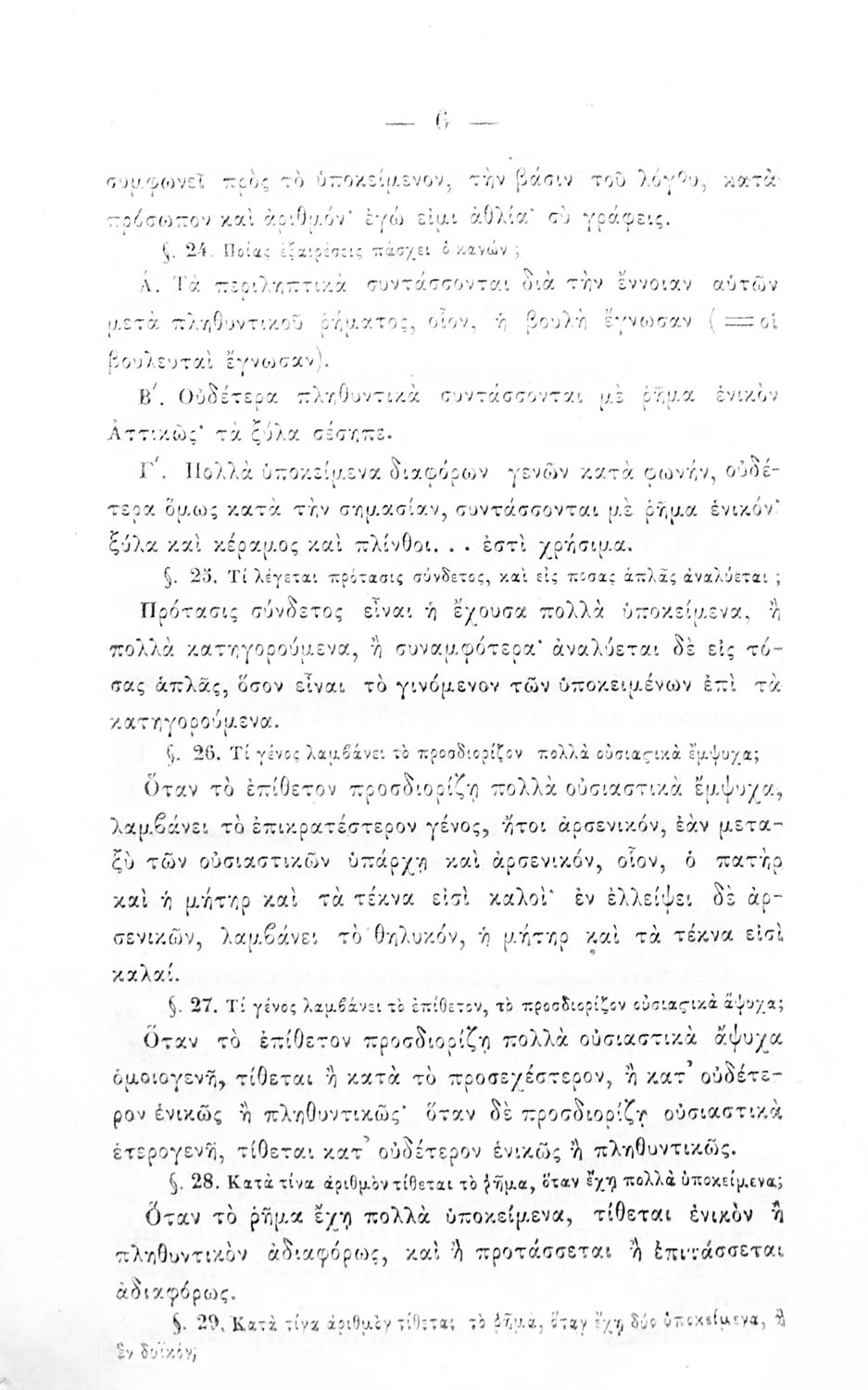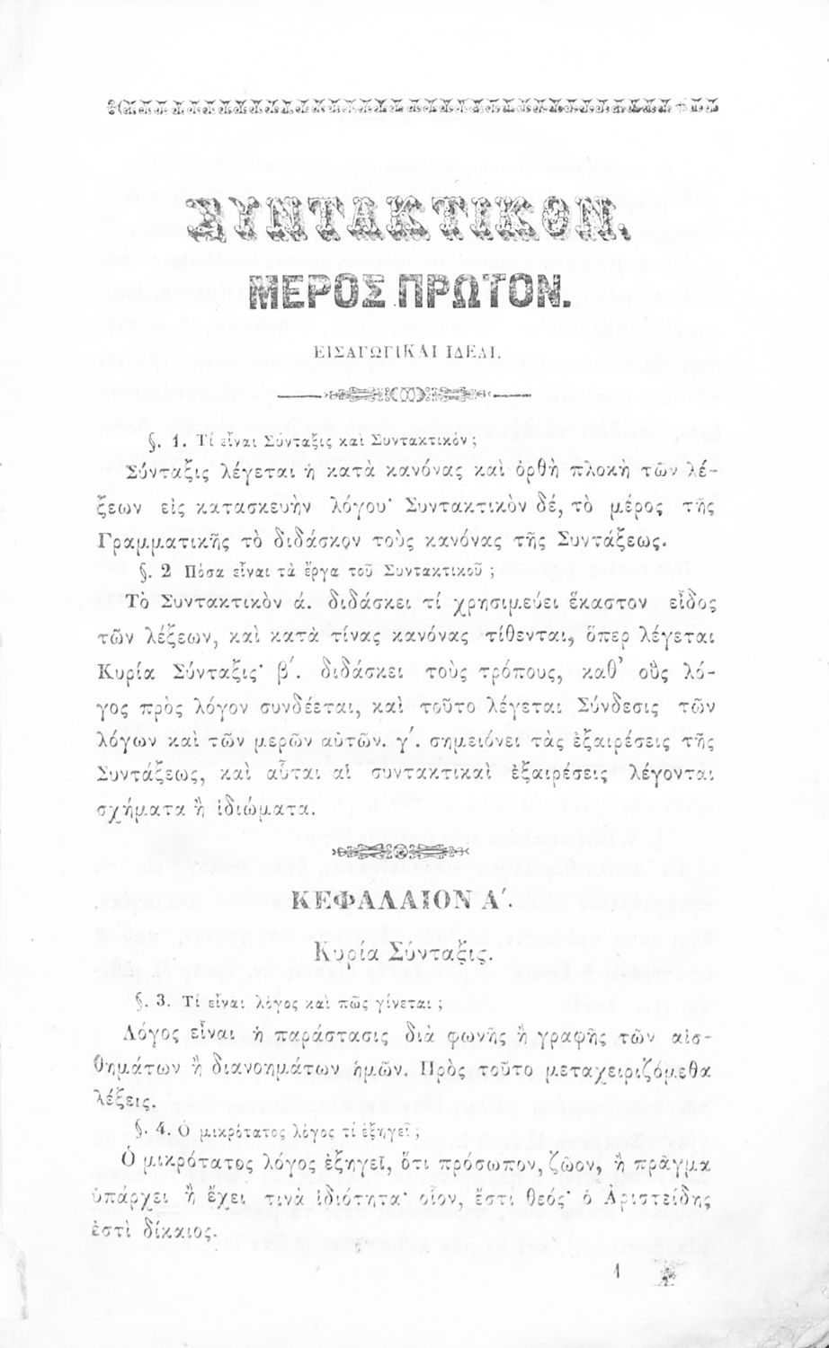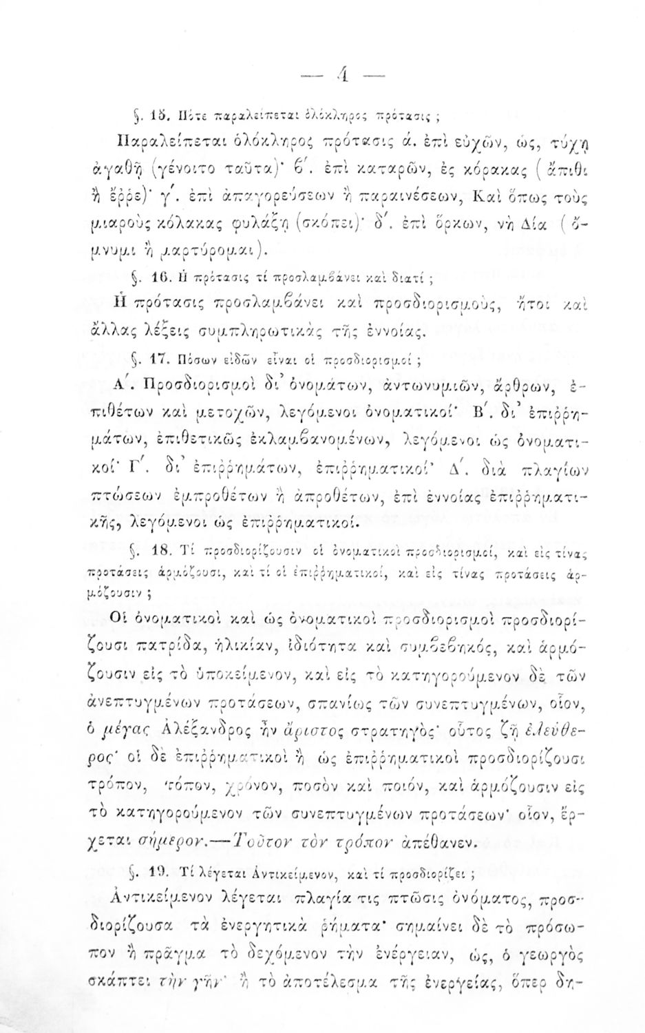 Σχολικό εγχειρίδιο Αρχαίων Ελληνικών για τα Ελληνικά Σχολεία και Παρθεναγωγεία που εστιάζει στα μέρη του λόγου και στην σύνταξή τους.
