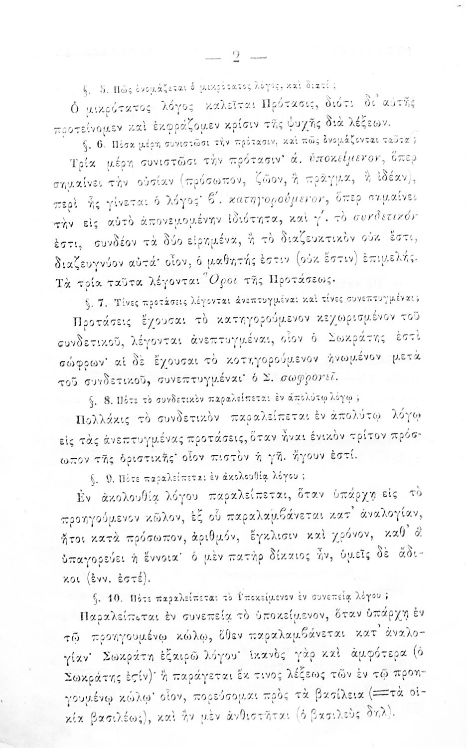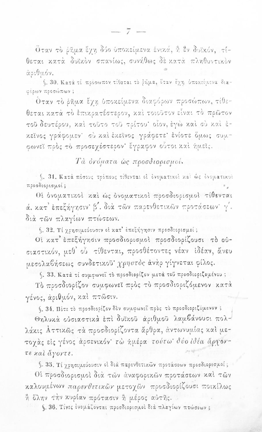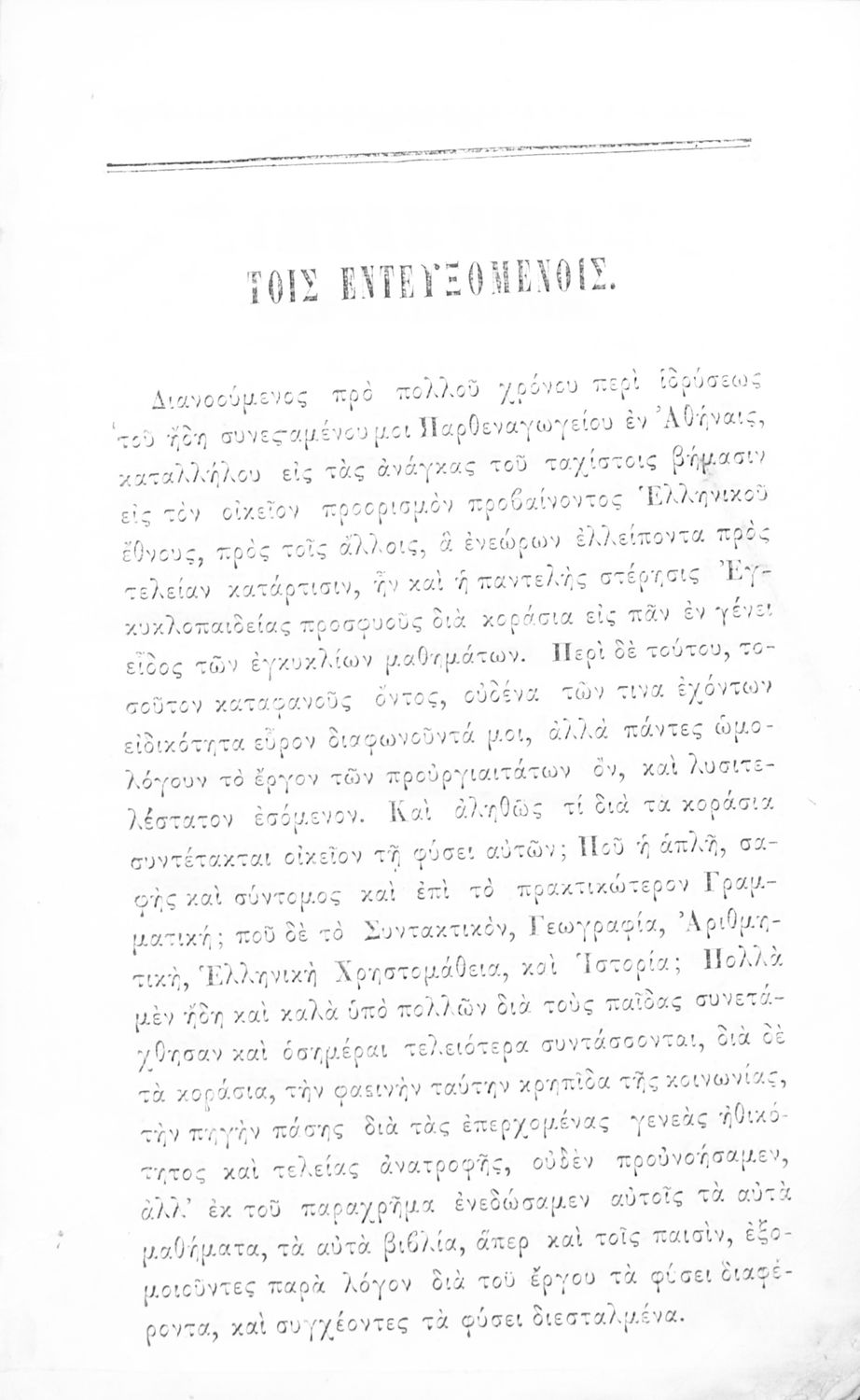 Σχολικό εγχειρίδιο Αρχαίων Ελληνικών για τα Ελληνικά Σχολεία και Παρθεναγωγεία που εστιάζει στα μέρη του λόγου και στην σύνταξή τους.
